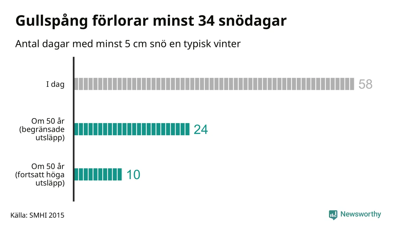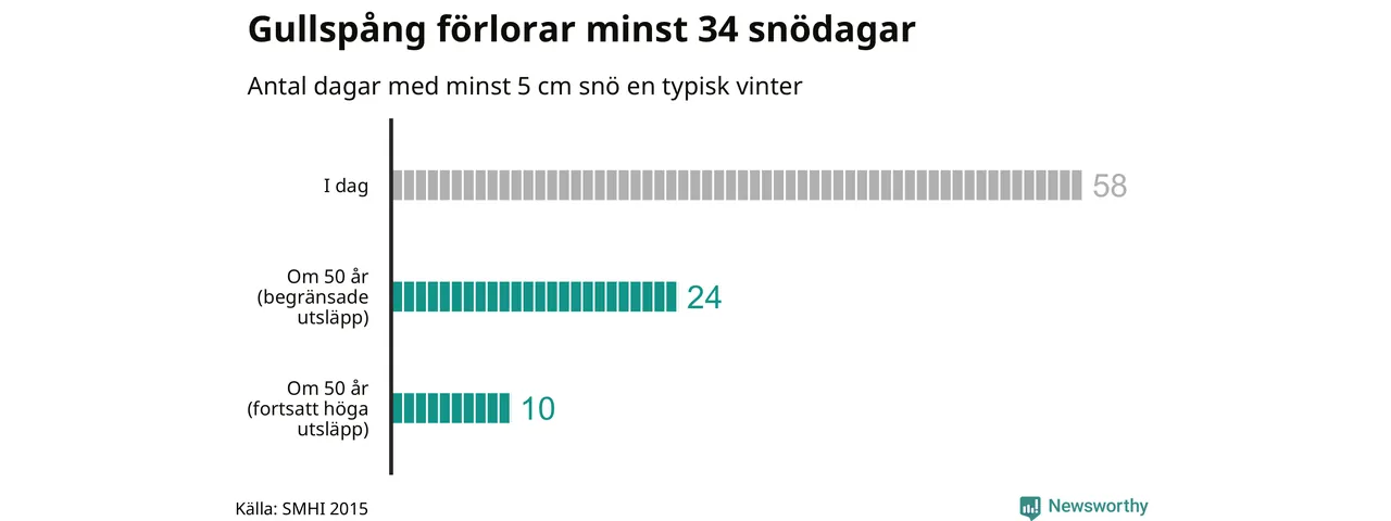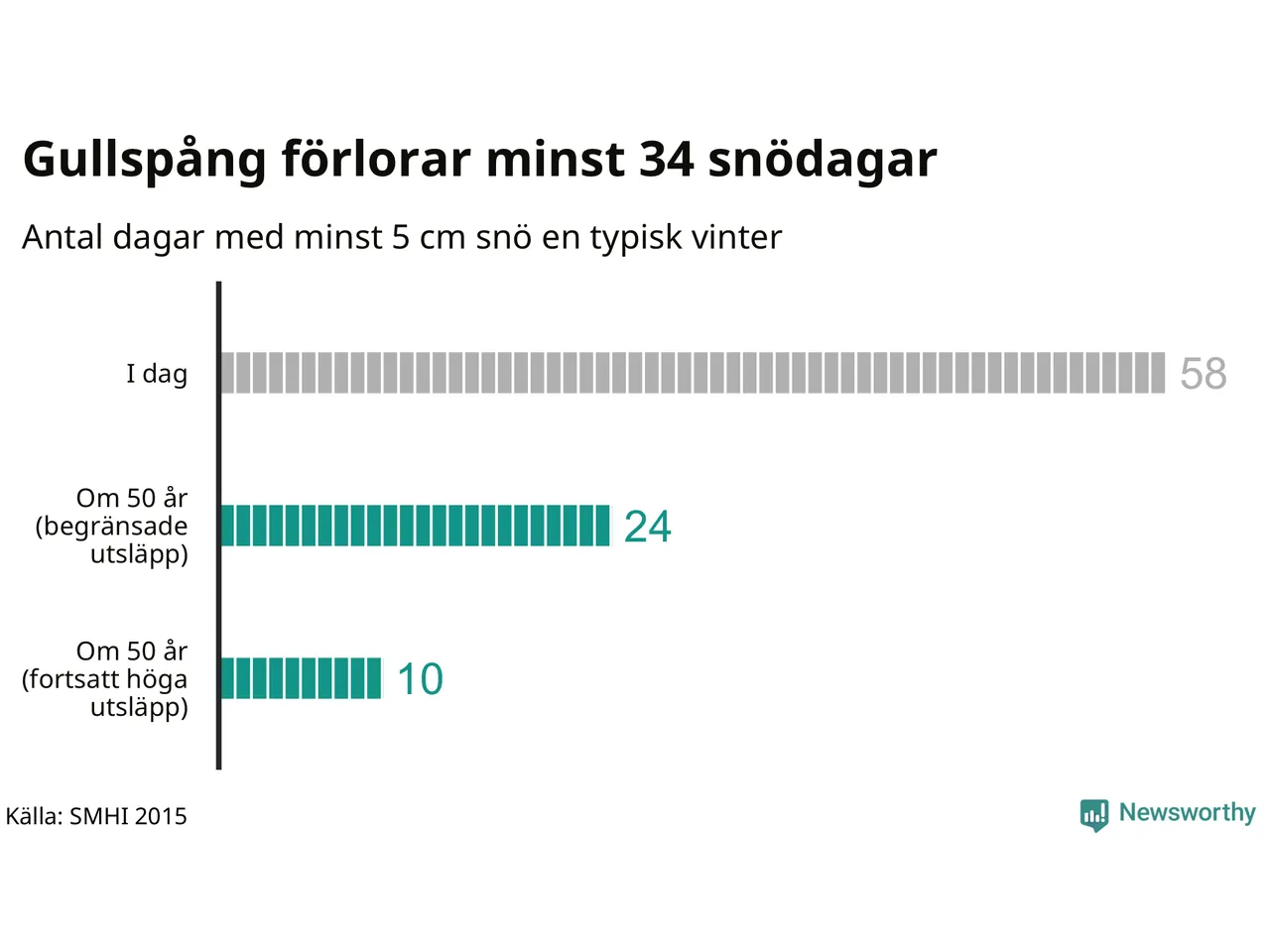 Men framtidens vintrar och jular ser ut att bli rejält annorlunda. Enligt klimatscenarierna har Gullspångs kommun mellan tio och 24 snödagar en normal vinter i slutet av seklet, beroende på hur utsläppsutvecklingen blir. Omkring tre av fem snödagar riskerar med andra ord gå förlorade.