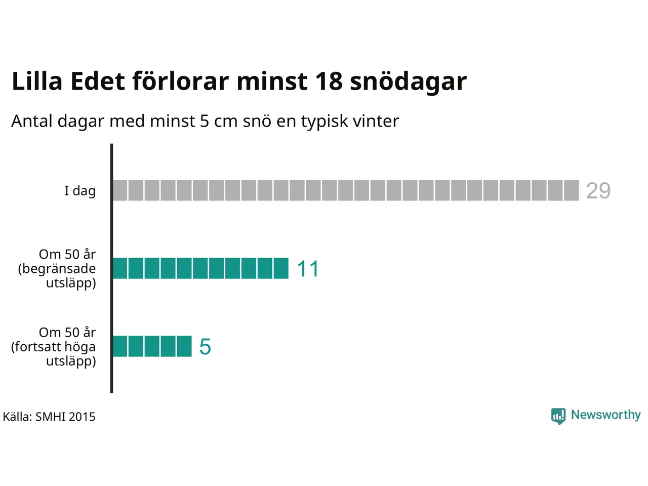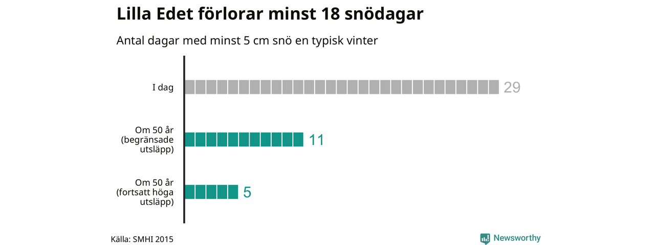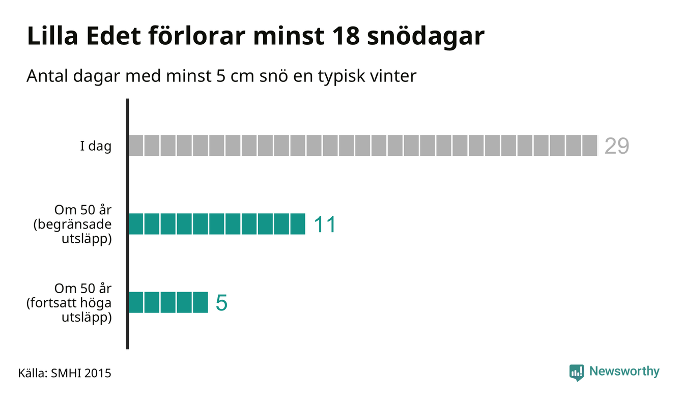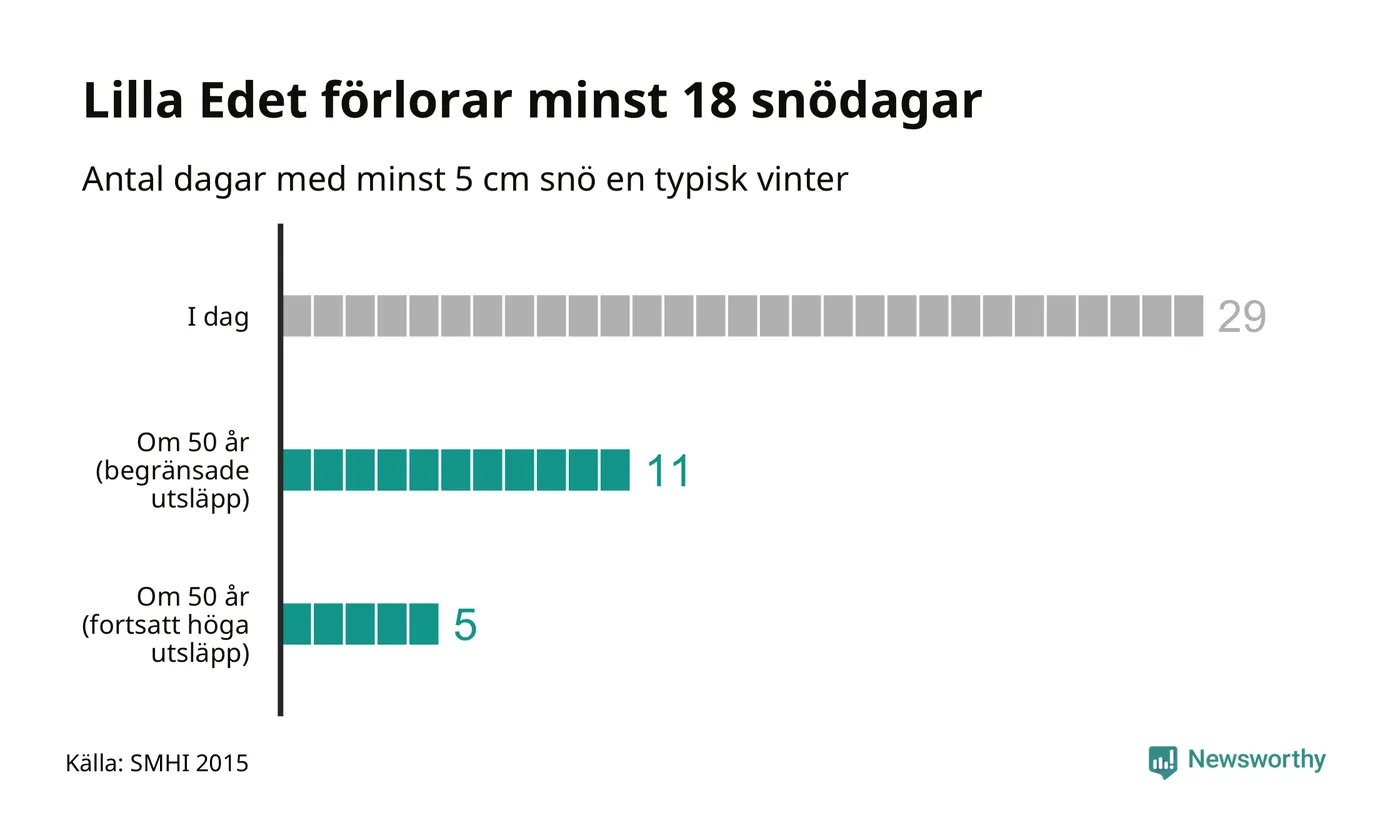 Men framtidens vintrar och jular ser ut att bli rejält annorlunda. Enligt klimatscenarierna har Lilla Edets kommun mellan fem och elva snödagar en normal vinter i slutet av seklet, beroende på hur utsläppsutvecklingen blir. Omkring två av tre snödagar riskerar med andra ord gå förlorade.