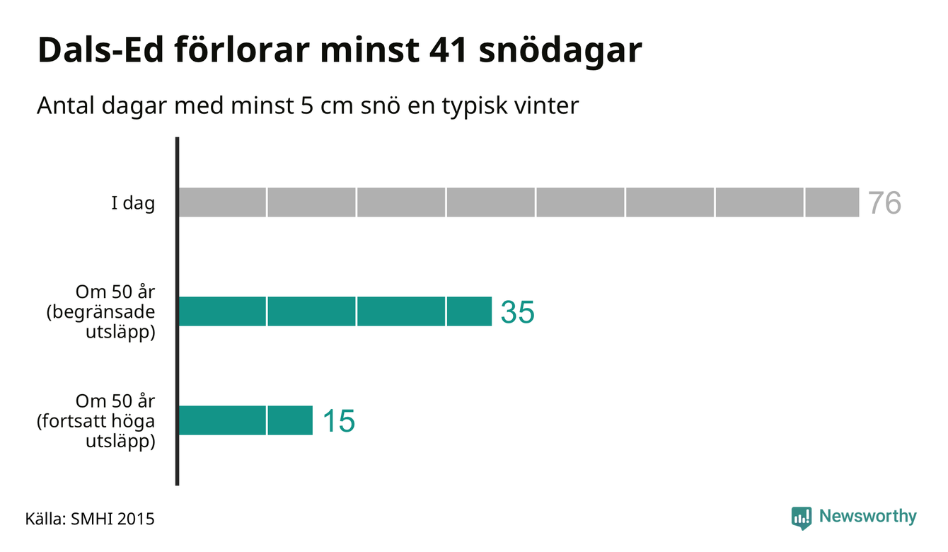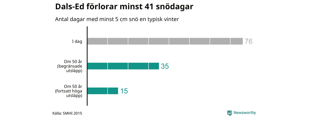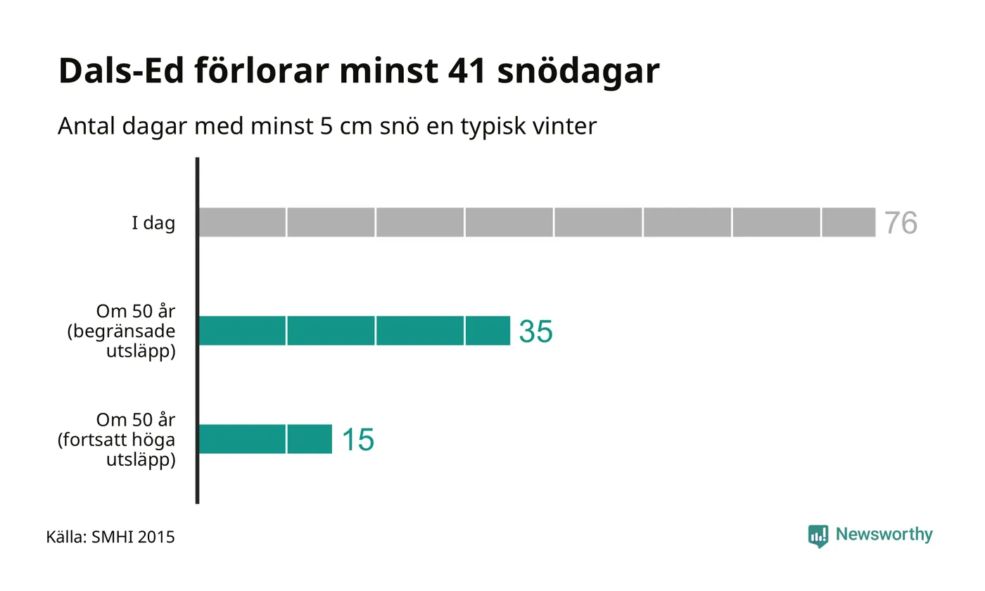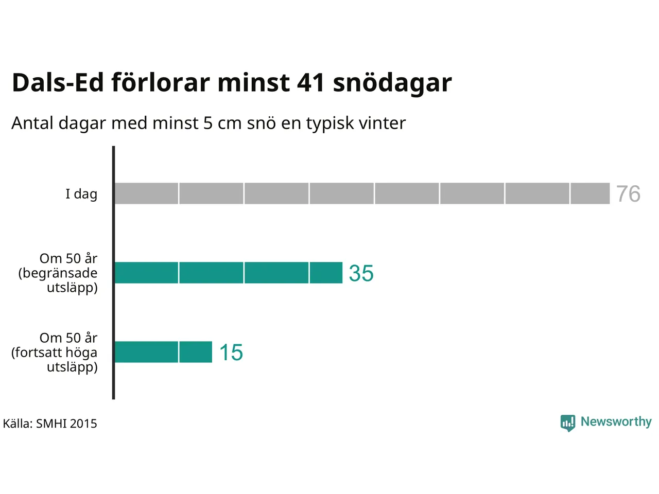 Men framtidens vintrar och jular ser ut att bli rejält annorlunda. Enligt klimatscenarierna har Dals-Eds kommun mellan 15 och 35 snödagar en normal vinter i slutet av seklet, beroende på hur utsläppsutvecklingen blir. Omkring tre av fem snödagar riskerar med andra ord gå förlorade.