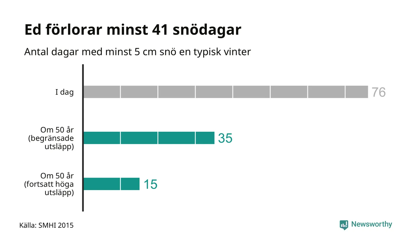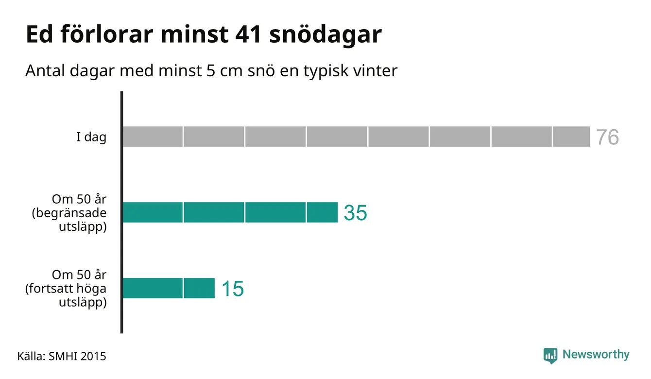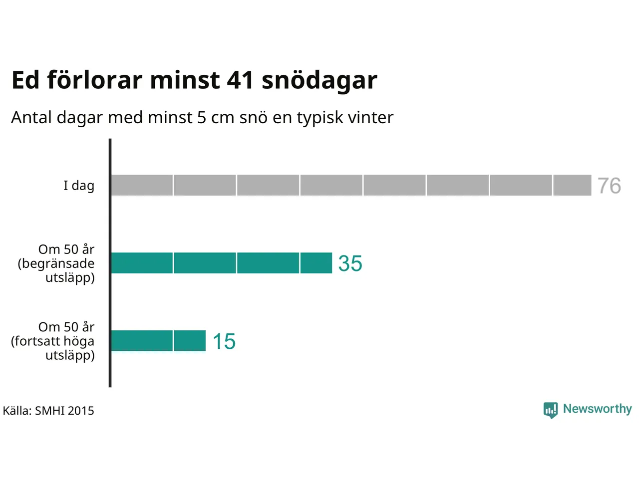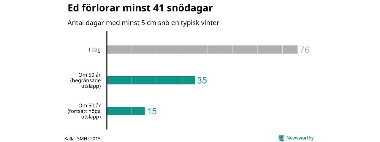Men framtidens vintrar och jular ser ut att bli rejält annorlunda. Enligt klimatscenarierna har Dals-Eds kommun mellan 15 och 35 snödagar en normal vinter i slutet av seklet, beroende på hur utsläppsutvecklingen blir. Omkring tre av fem snödagar riskerar med andra ord gå förlorade.