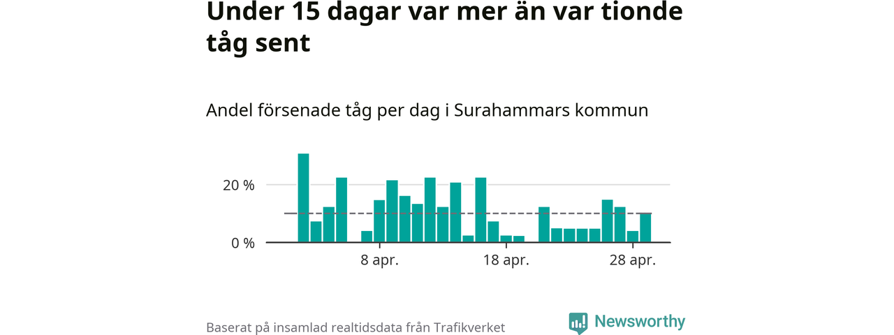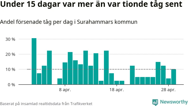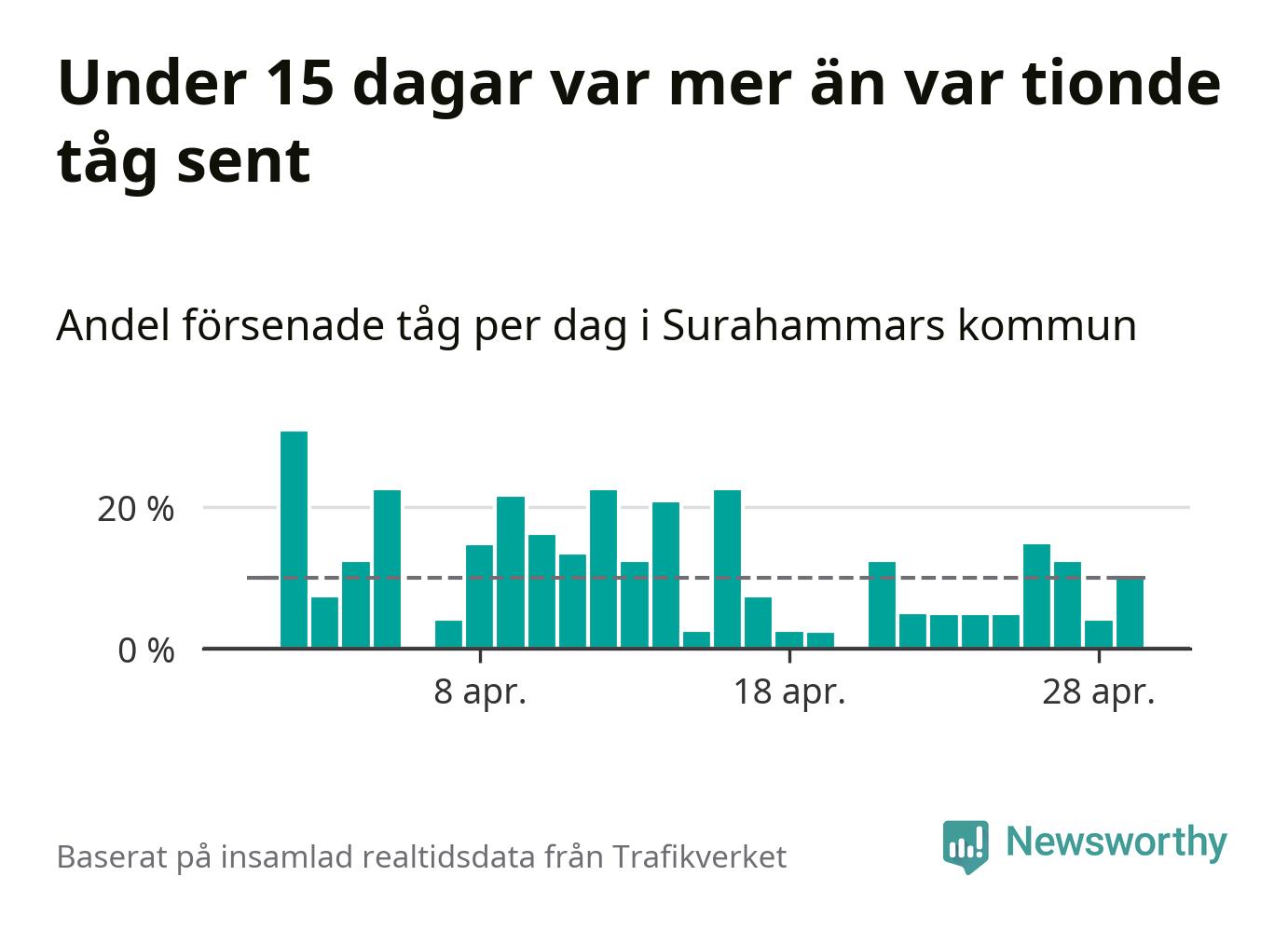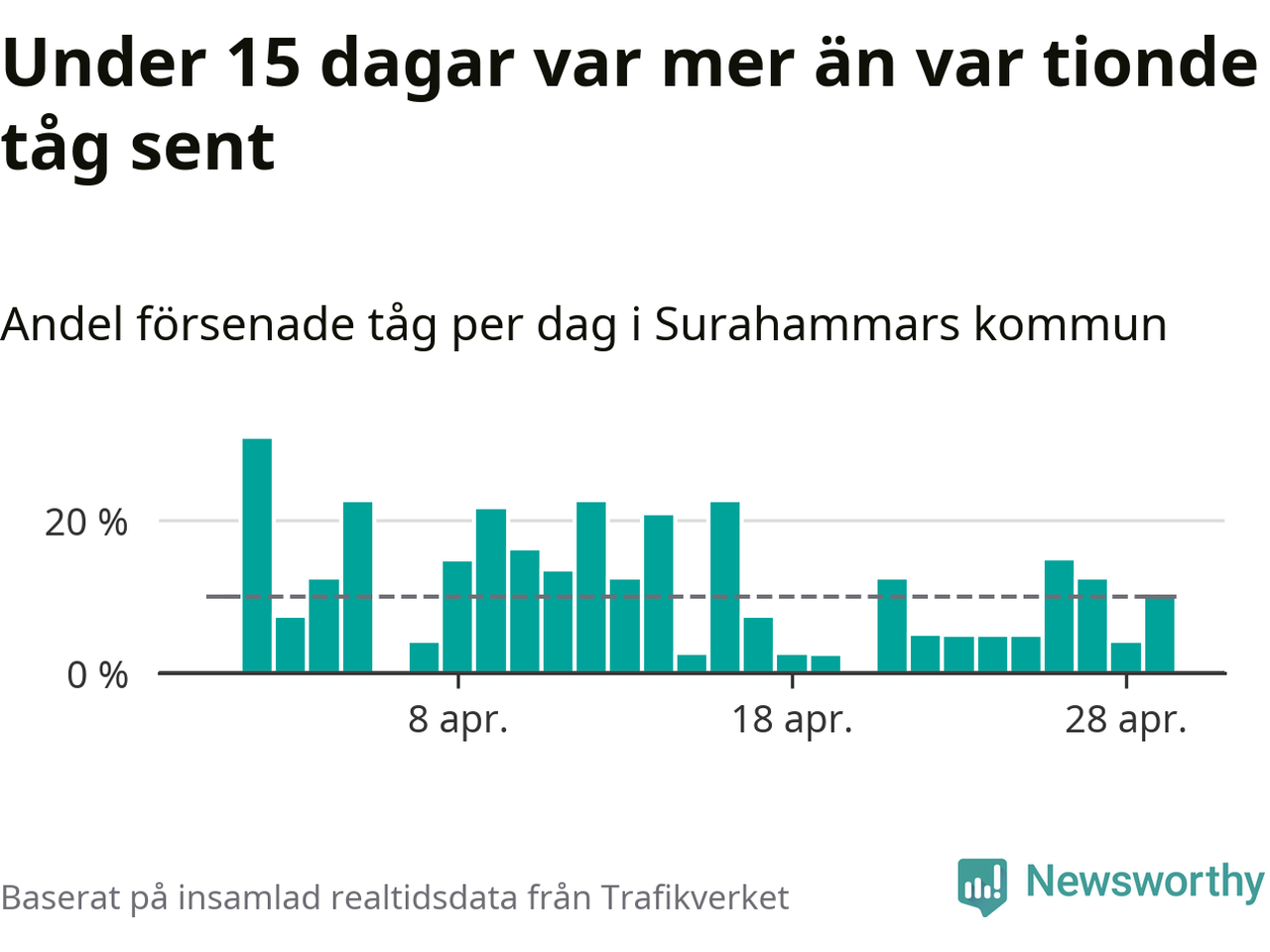 Under 15 av 30 dagar i april var mer än var tionde tåg i Surahammars kommun försenat. Det visar Newsworthys sammanställning av alla tågförseningar förra månaden.