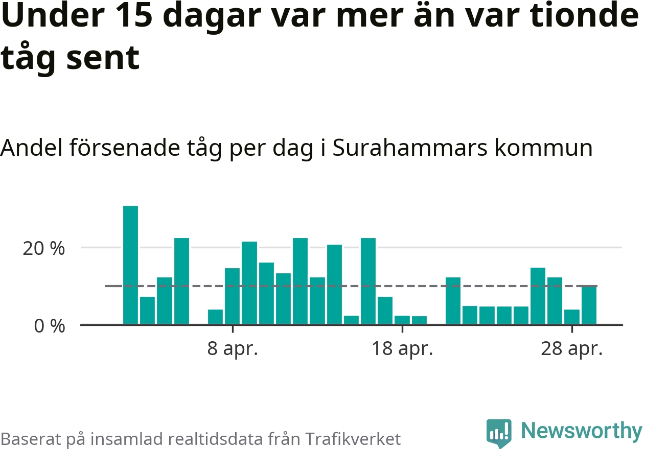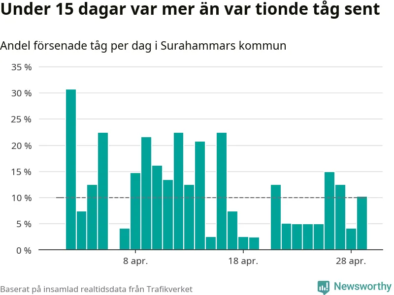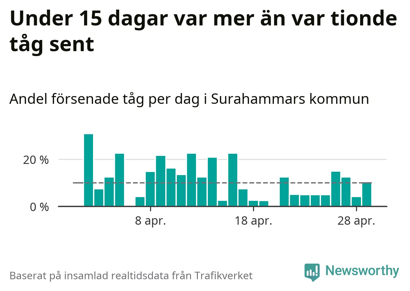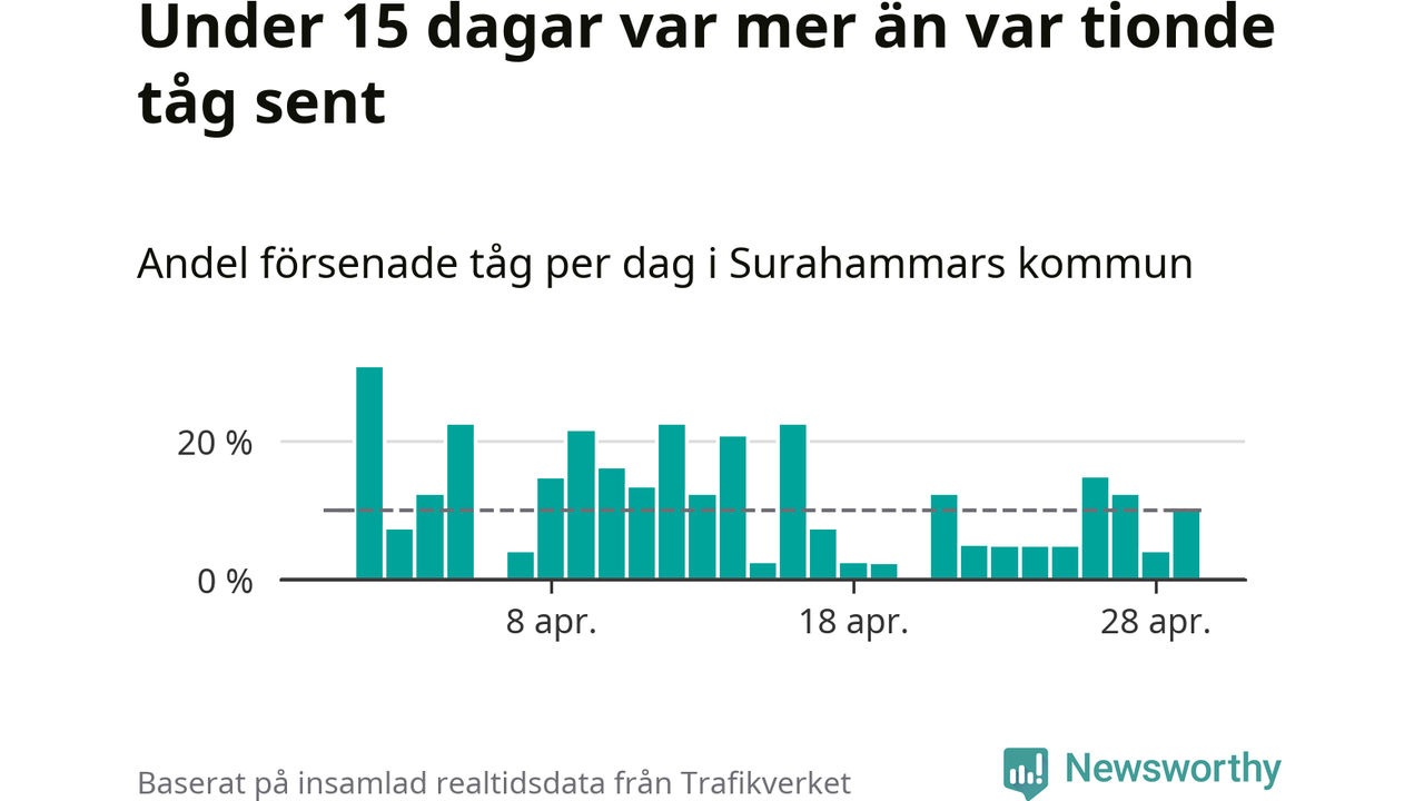 Under 15 av 30 dagar i april var mer än var tionde tåg i Surahammars kommun försenat. Det visar Newsworthys sammanställning av alla tågförseningar förra månaden.