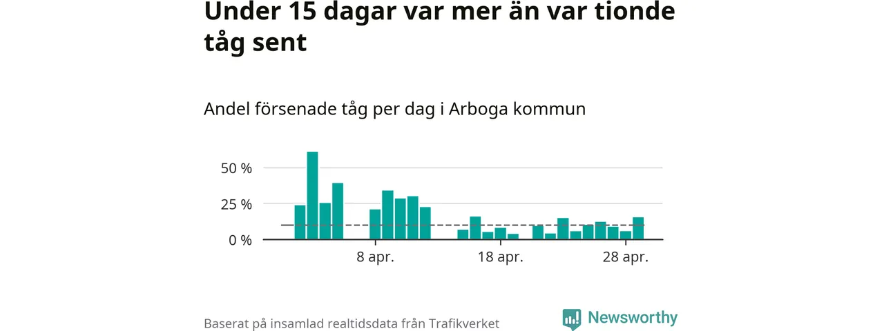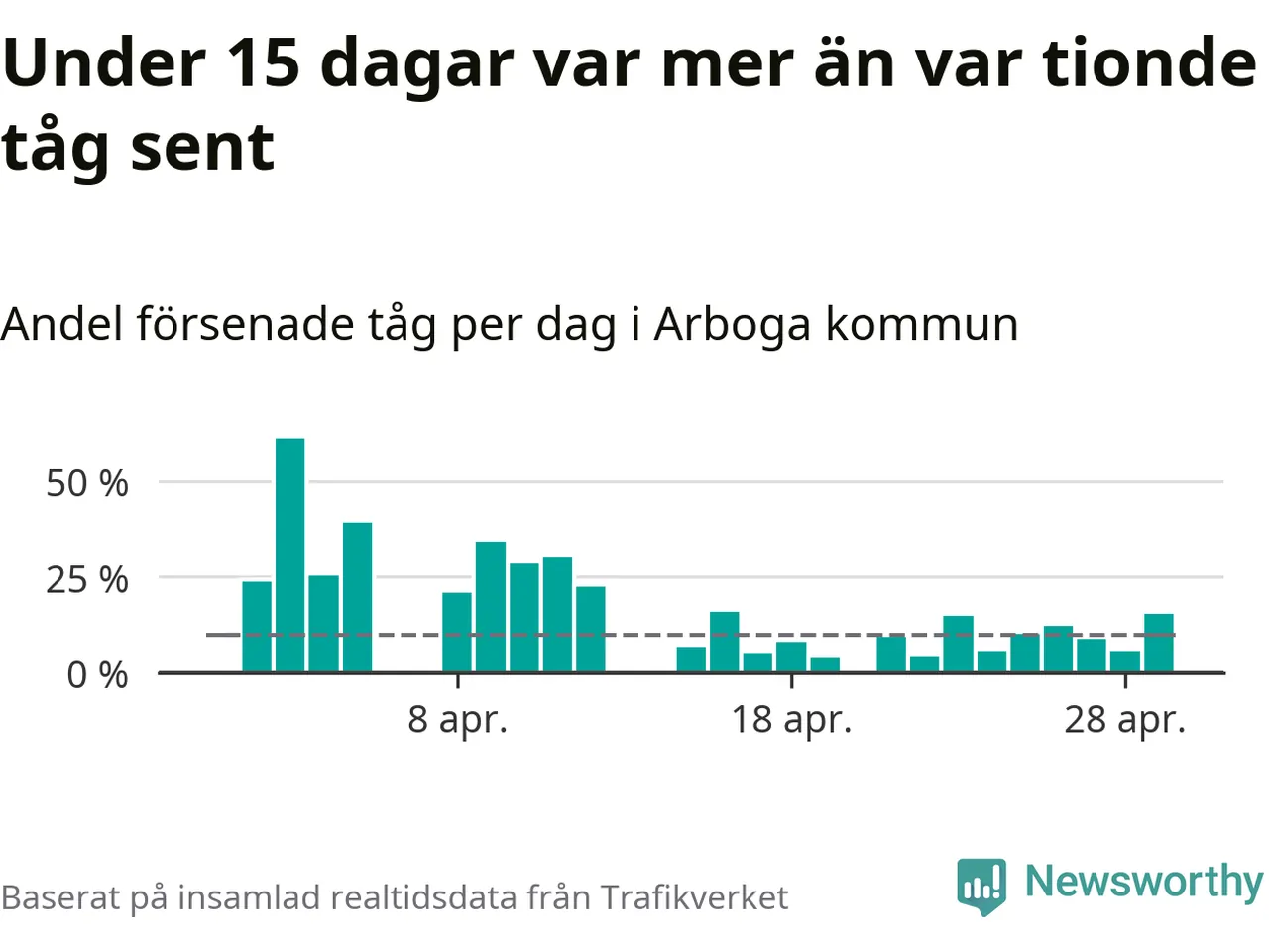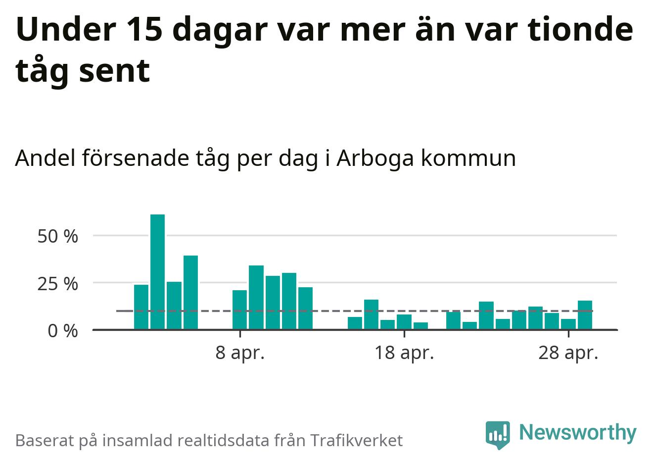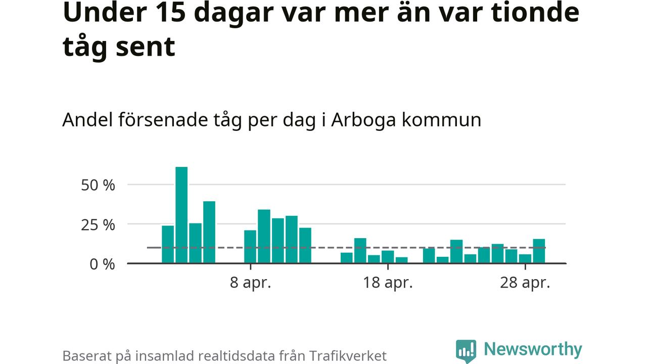 Under 15 av 30 dagar i april var mer än var tionde tåg vid Arboga försenat. Det visar Newsworthys sammanställning av alla tågförseningar förra månaden.