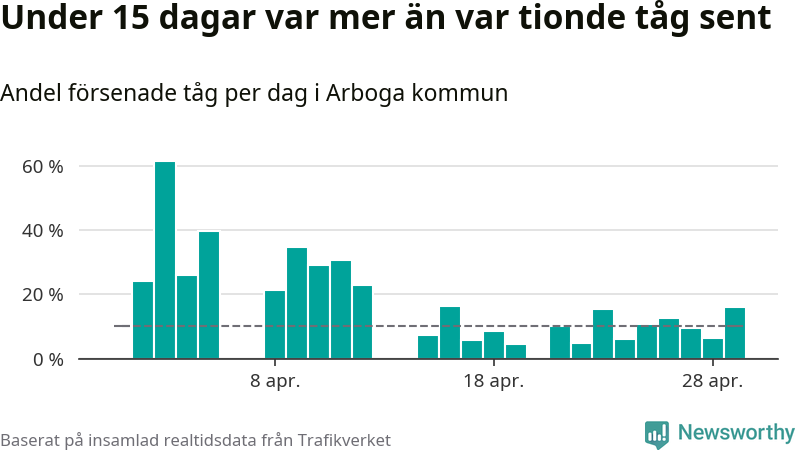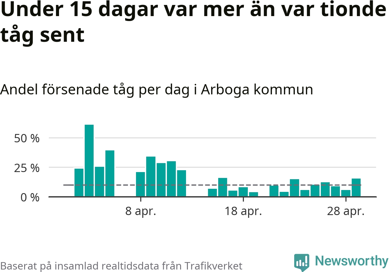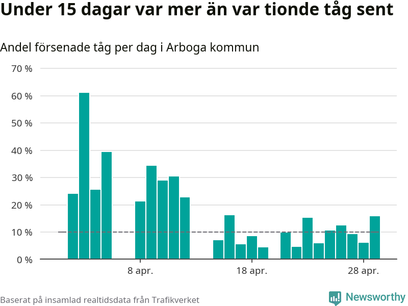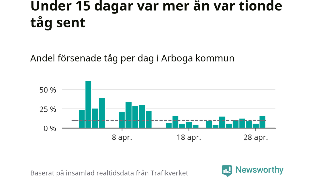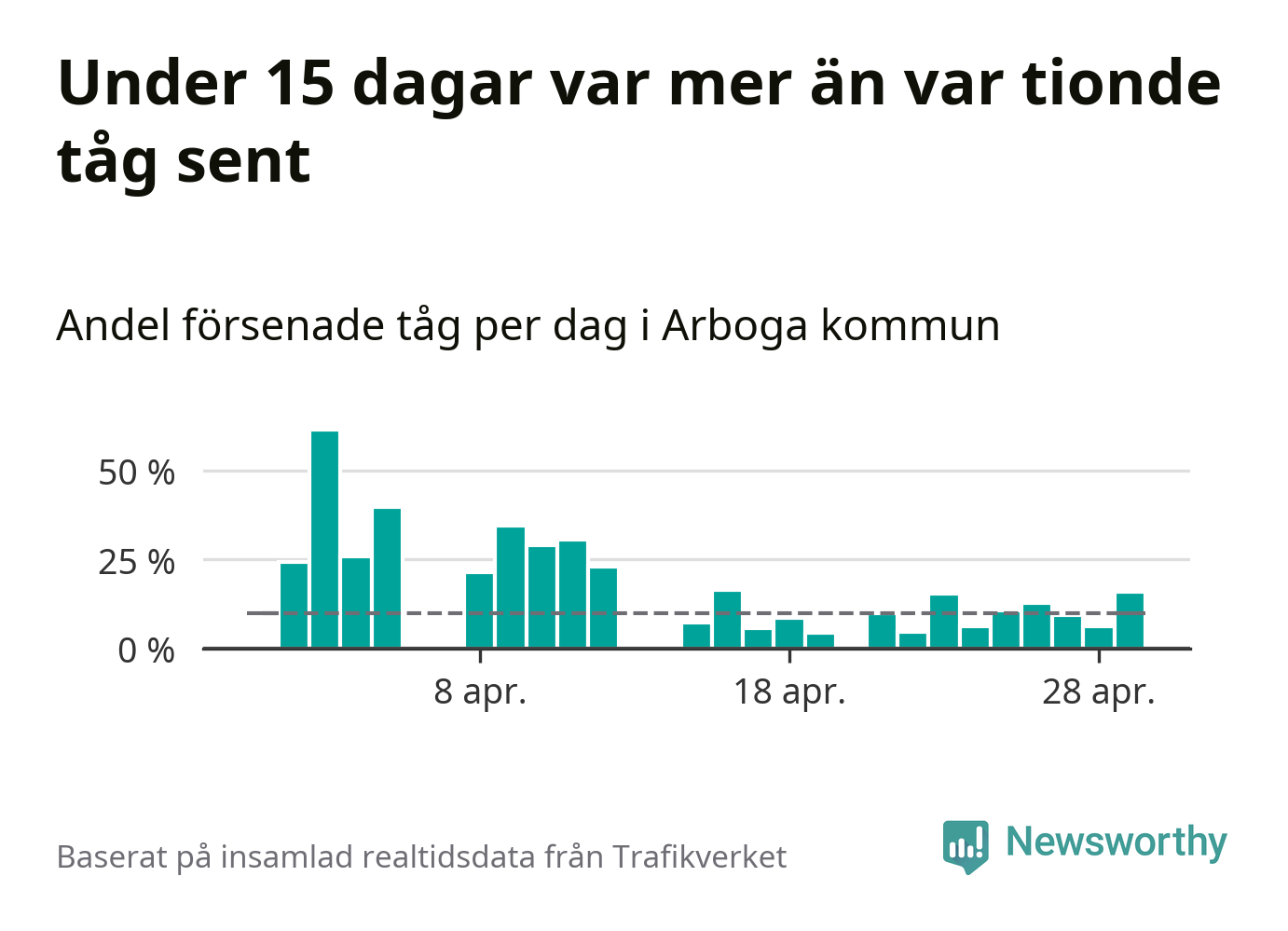 Under 15 av 30 dagar i april var mer än var tionde tåg vid Arboga försenat. Det visar Newsworthys sammanställning av alla tågförseningar förra månaden.