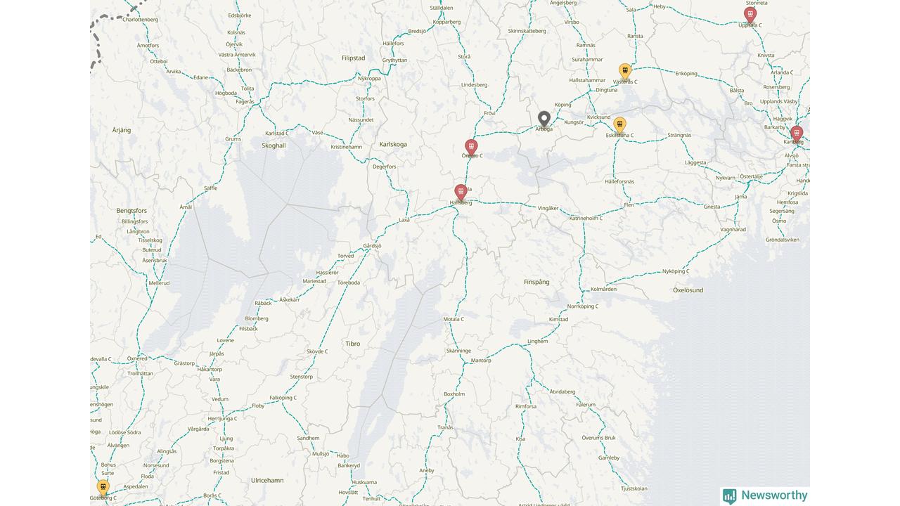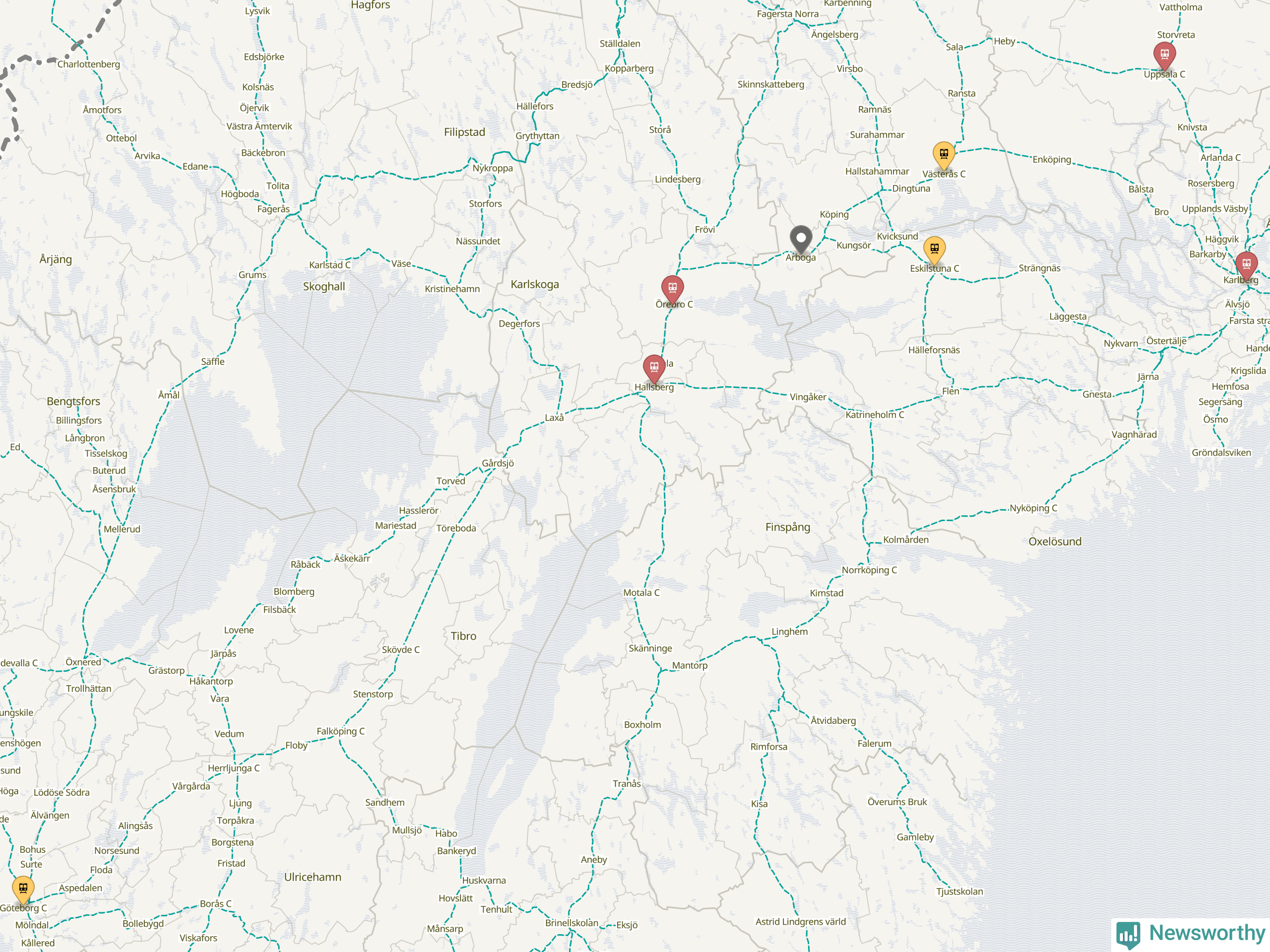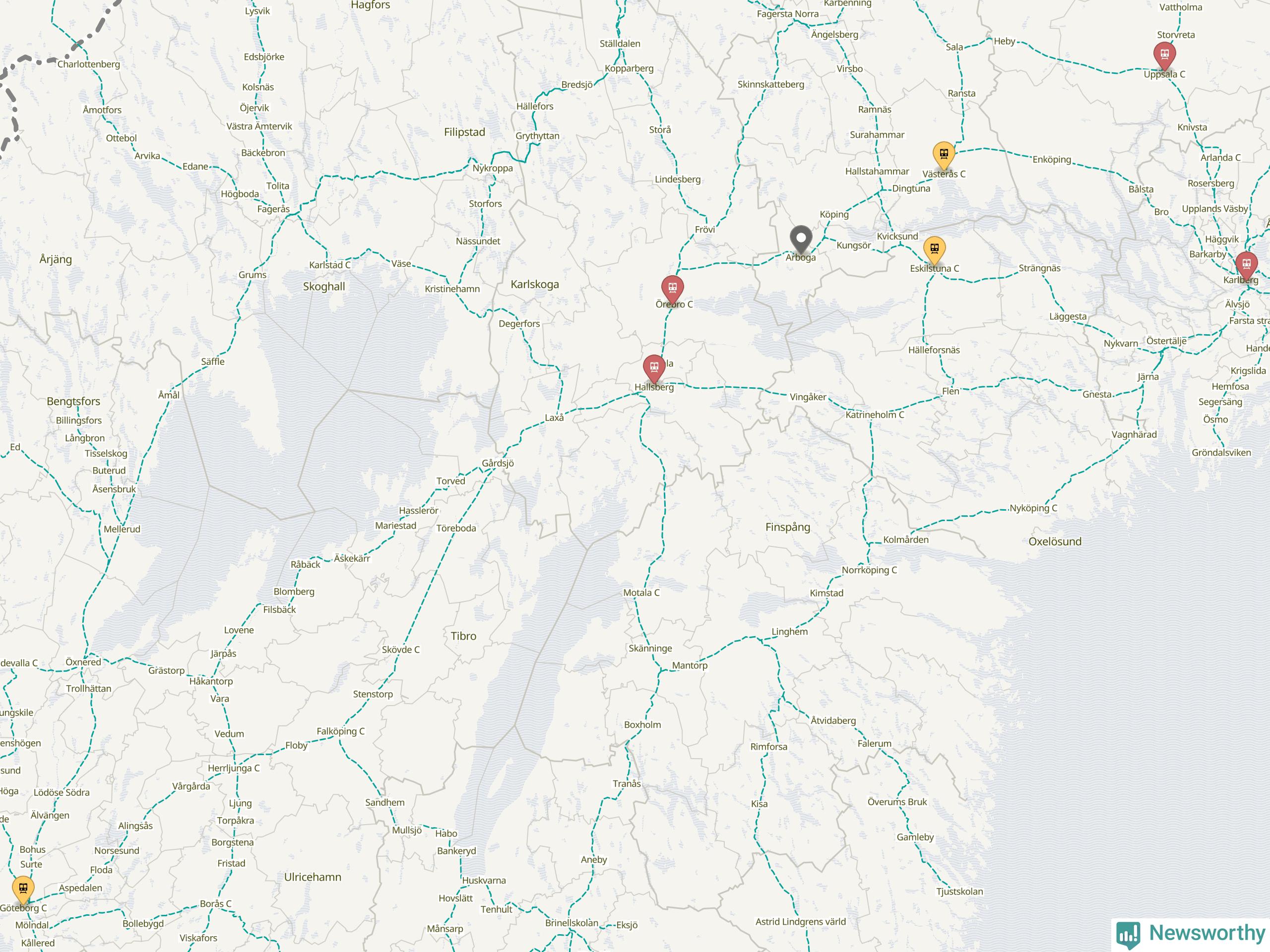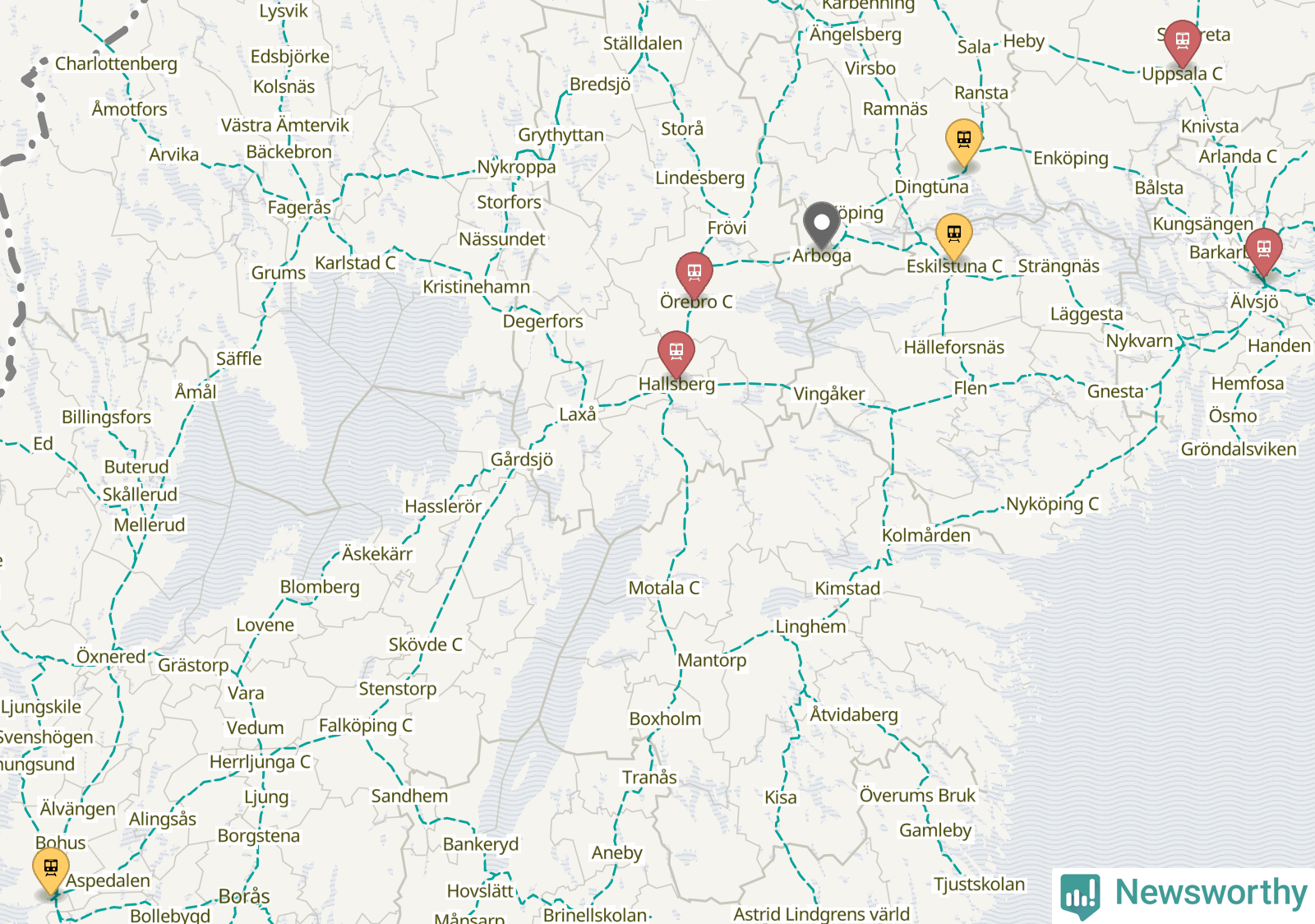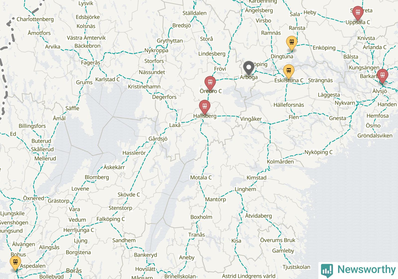 Kartdata från Mapbox, Newsworthy, OpenStreetMap och Trafikverket. Uppgifter om sträckor med passagerartrafik från jarnvag.net.