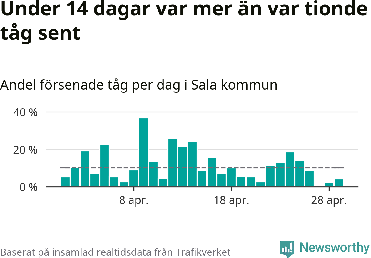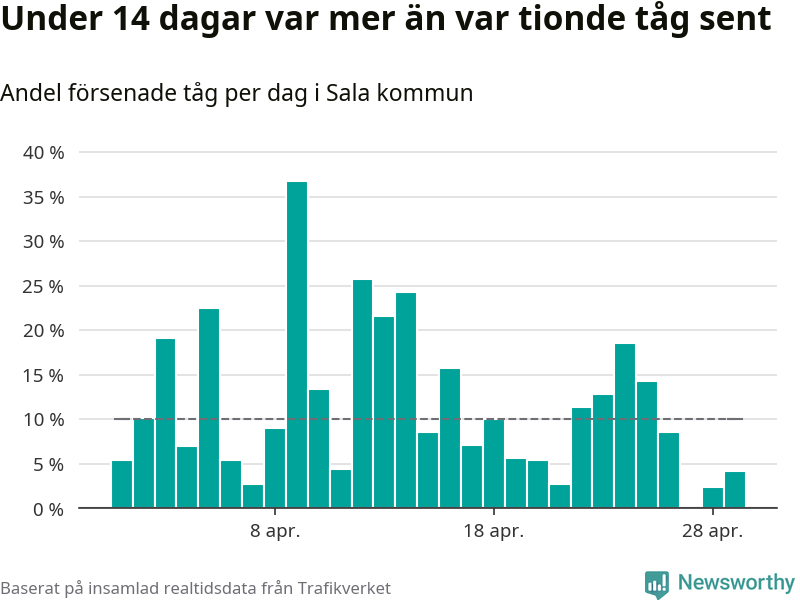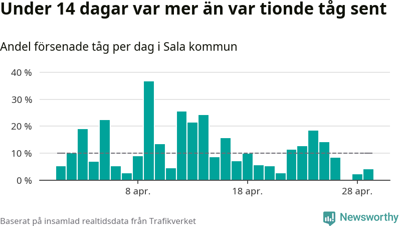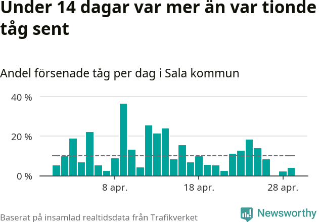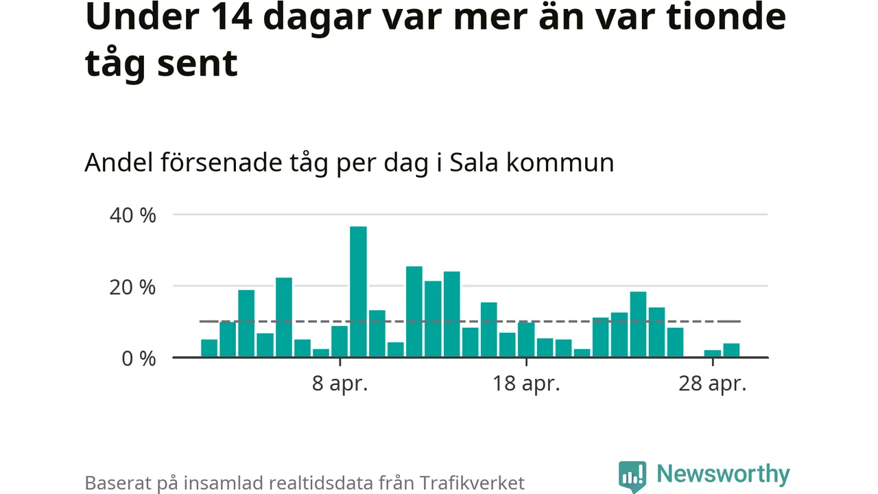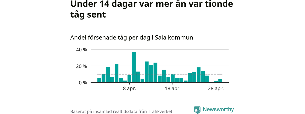 Under 14 av 30 dagar i april var mer än var tionde tåg i Sala kommun försenat. Det visar Newsworthys sammanställning av alla tågförseningar förra månaden.