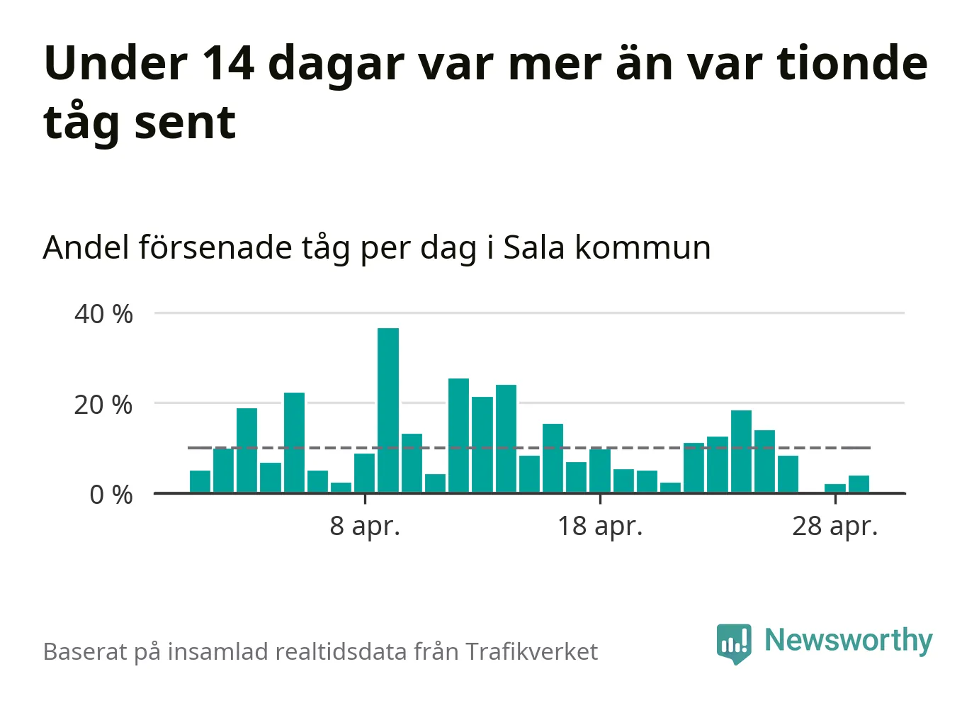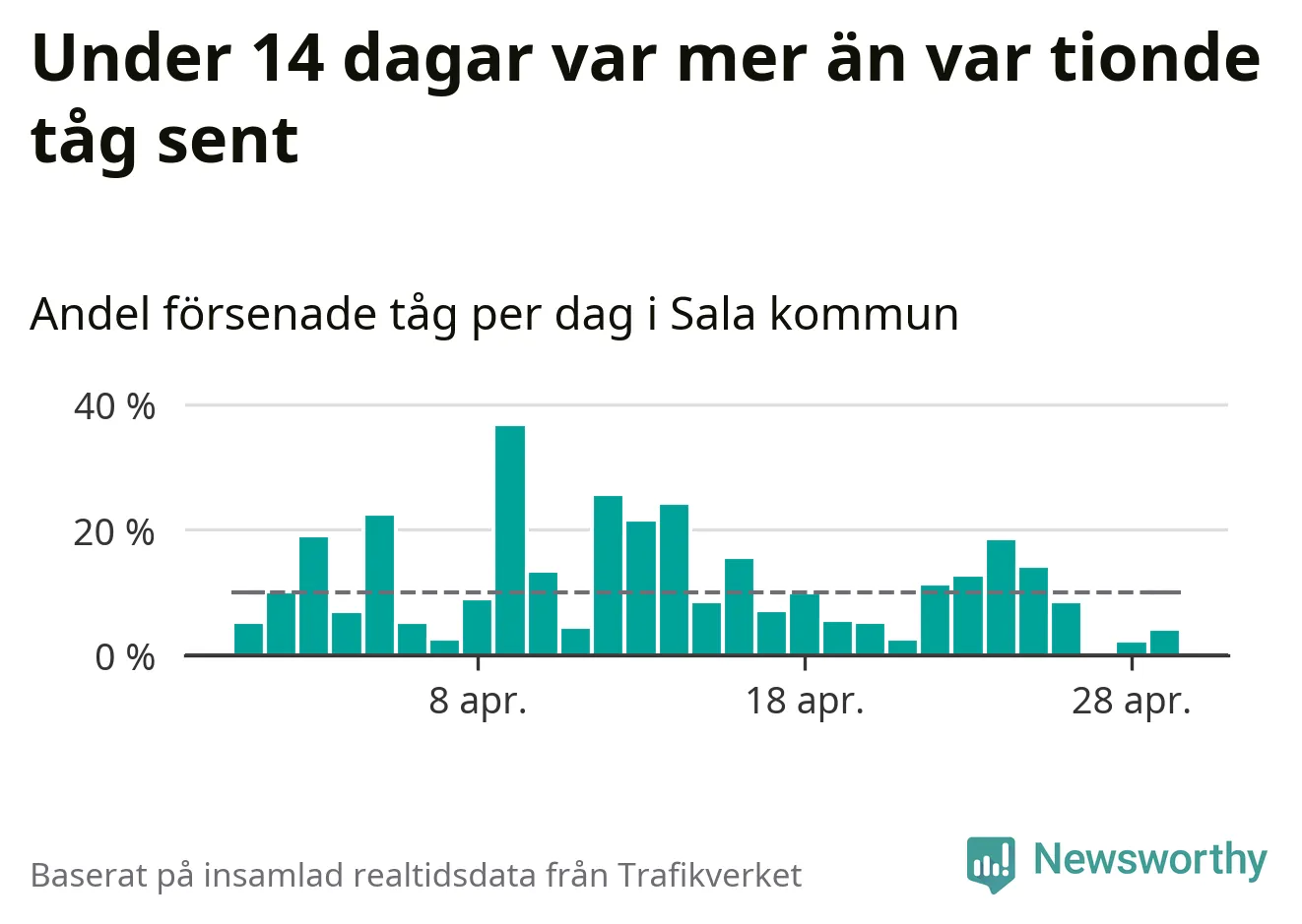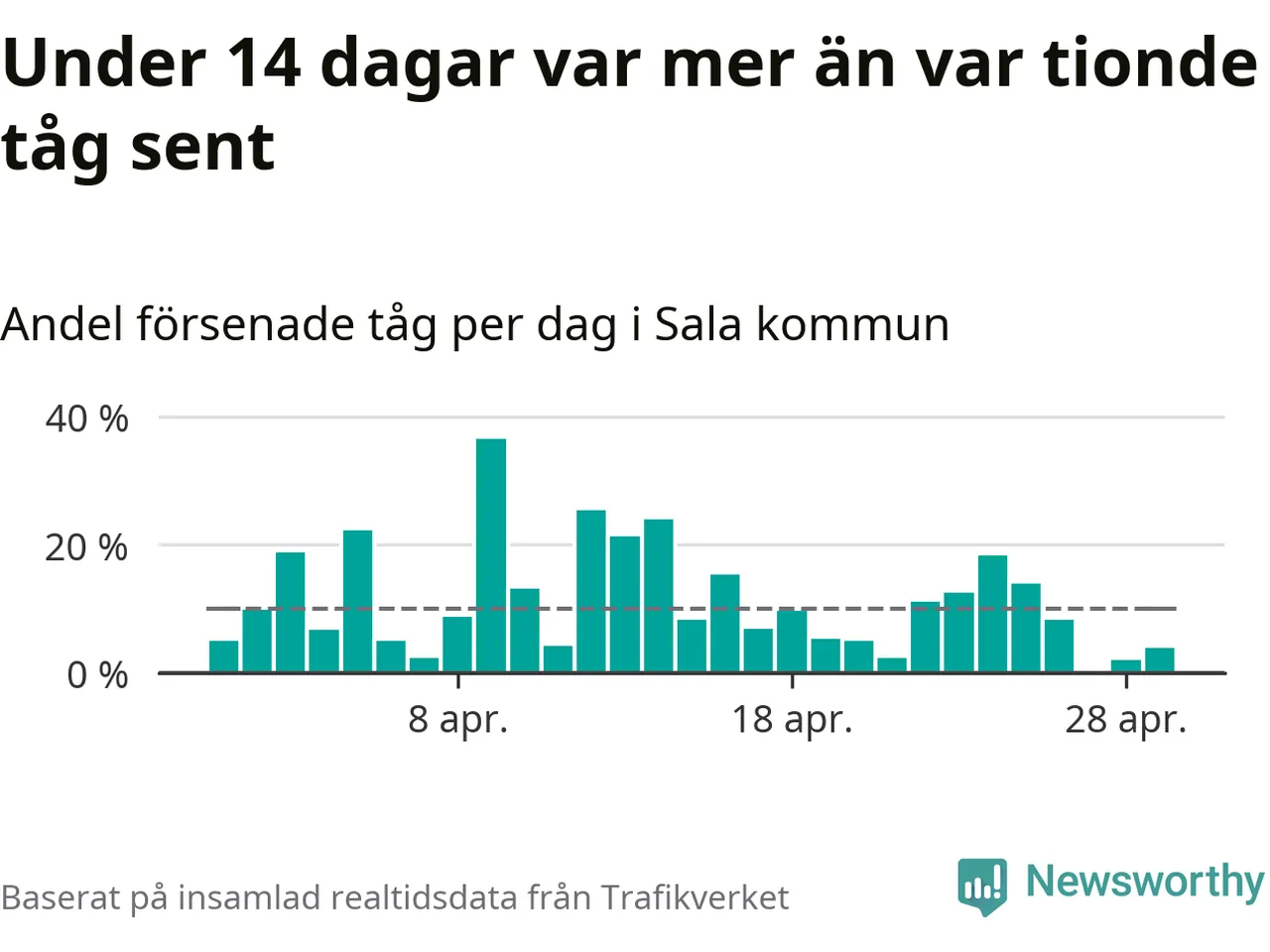 Under 14 av 30 dagar i april var mer än var tionde tåg i Sala kommun försenat. Det visar Newsworthys sammanställning av alla tågförseningar förra månaden.