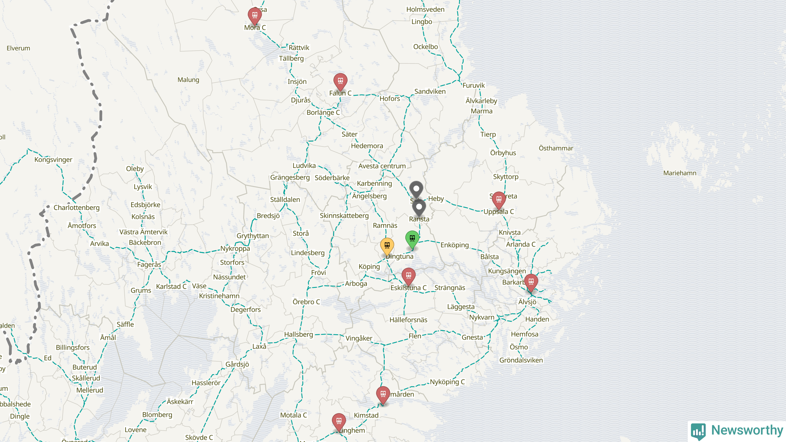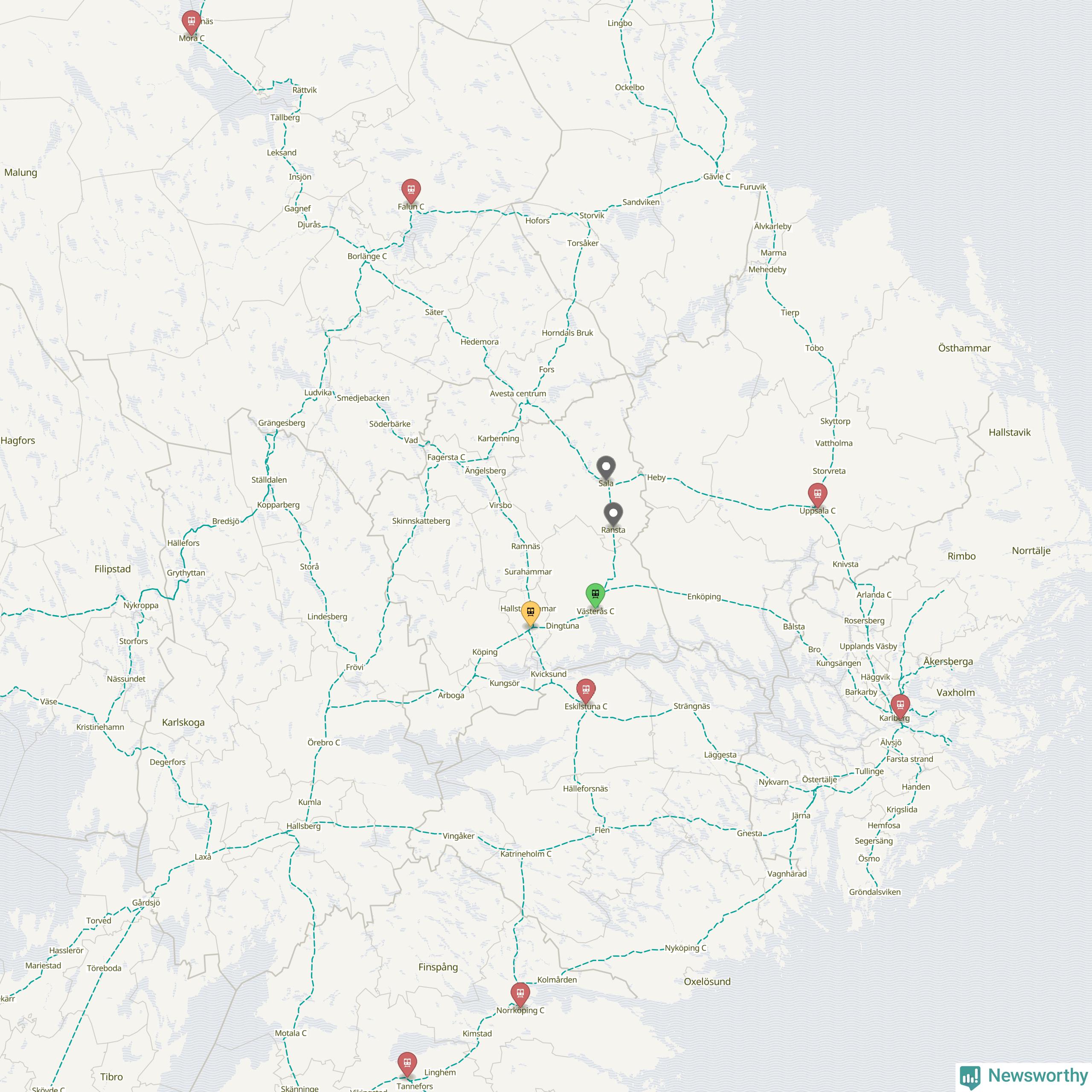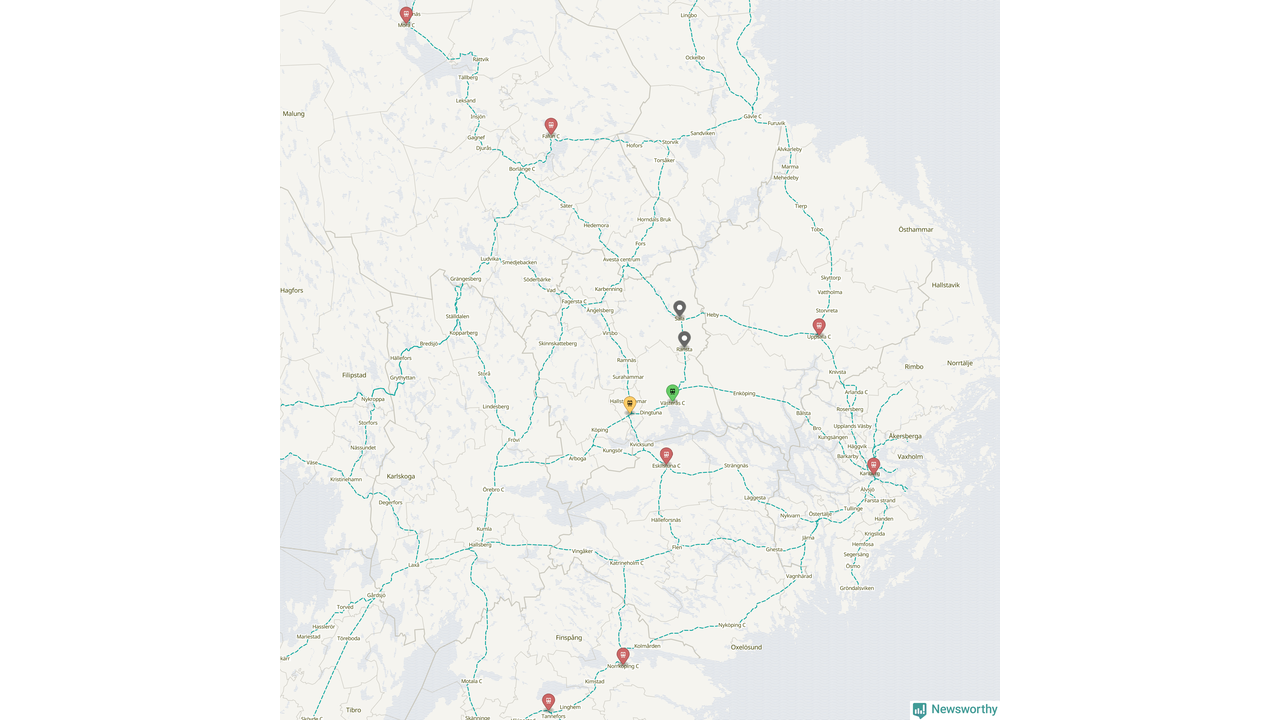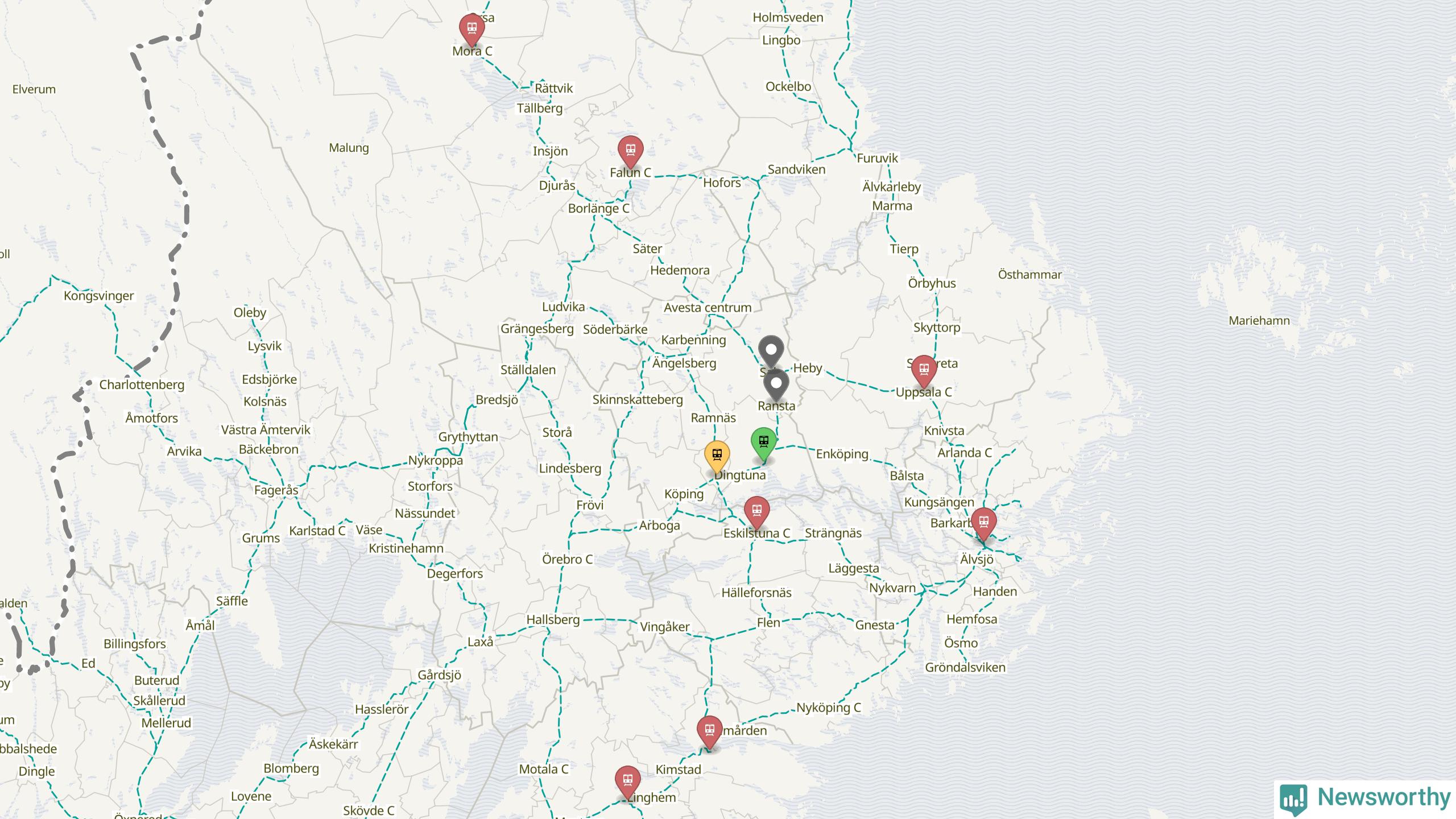 Kartdata från Mapbox, Newsworthy, OpenStreetMap och Trafikverket. Uppgifter om sträckor med passagerartrafik från jarnvag.net.