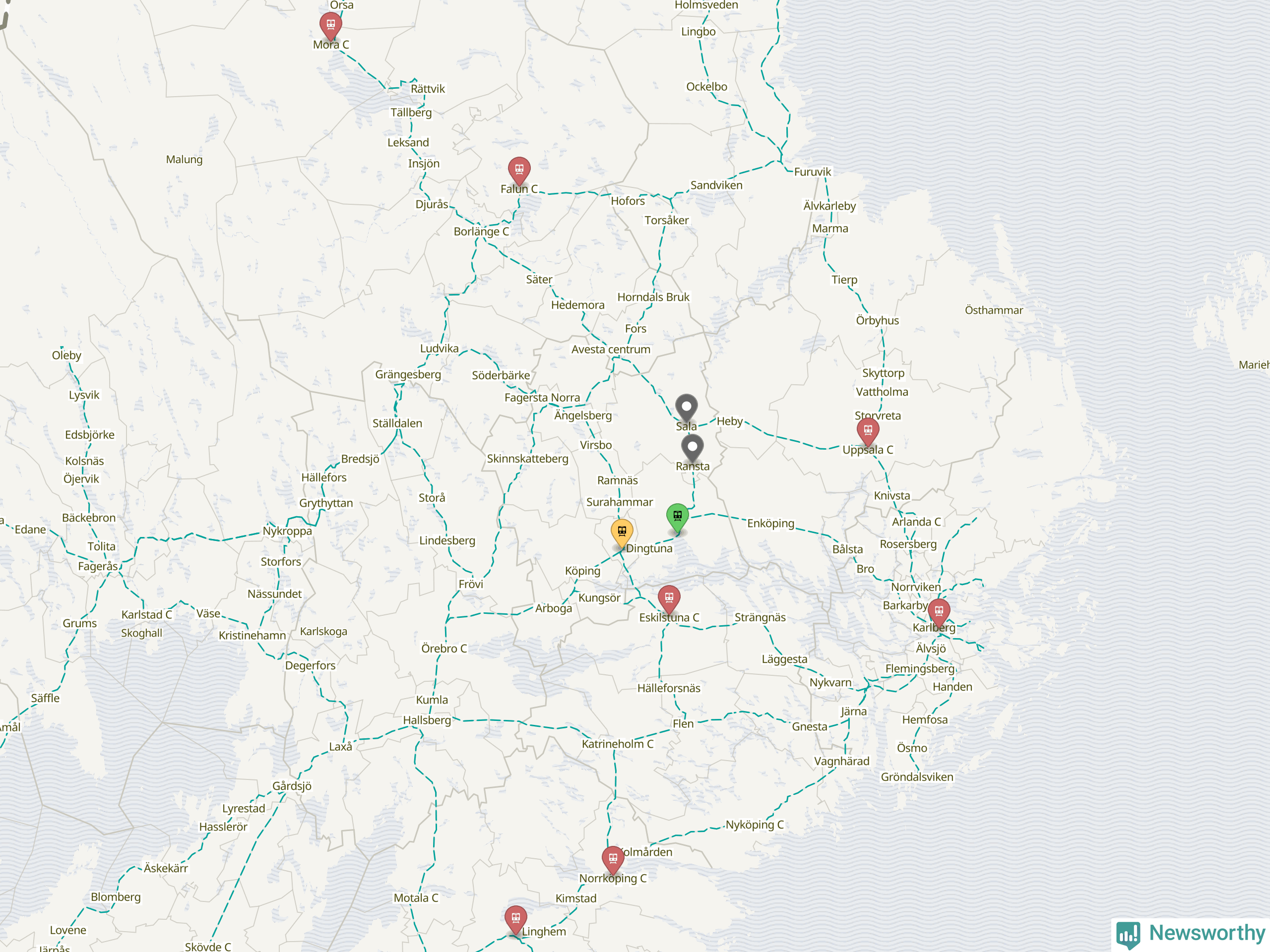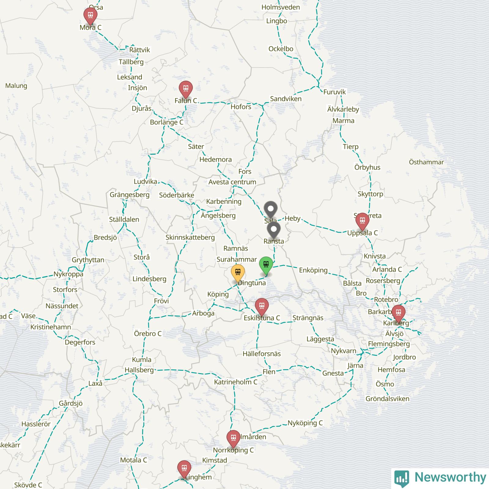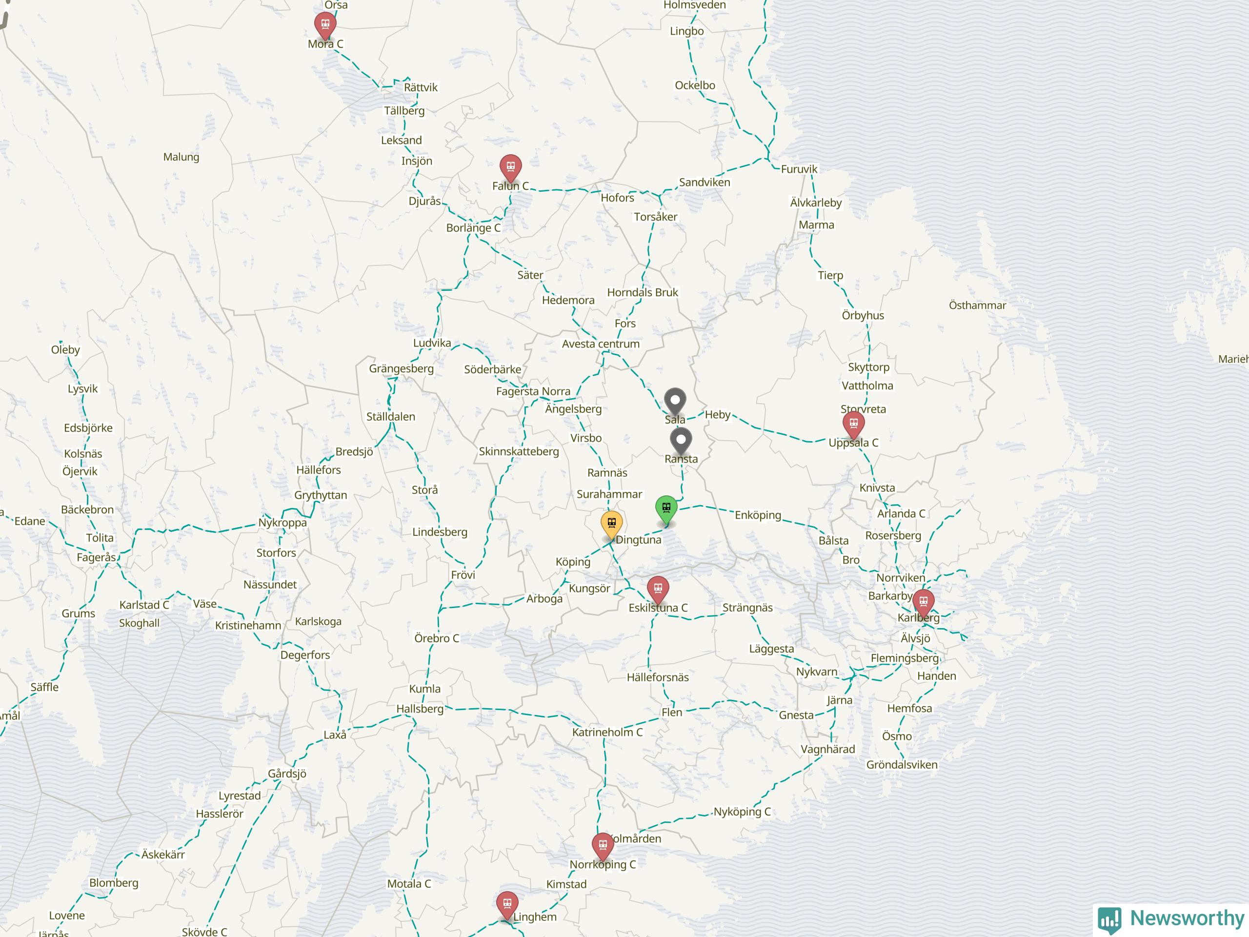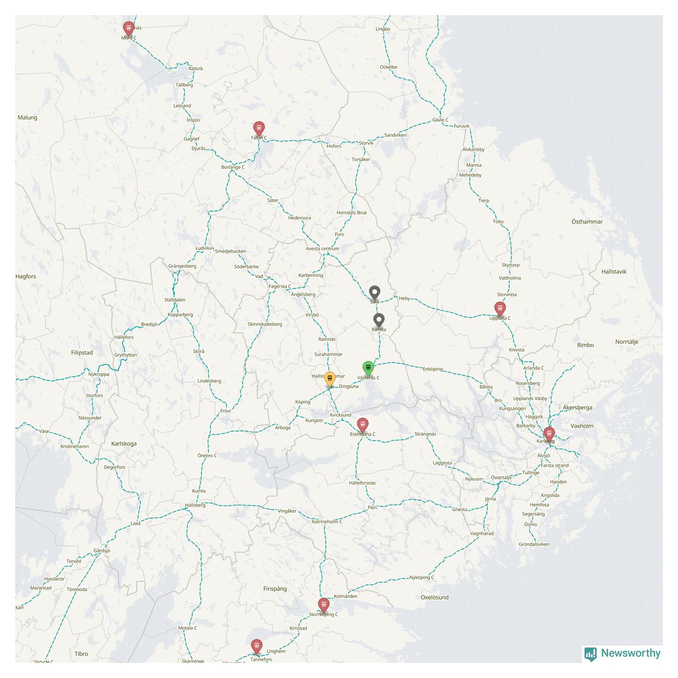 Kartdata från Mapbox, Newsworthy, OpenStreetMap och Trafikverket. Uppgifter om sträckor med passagerartrafik från jarnvag.net.