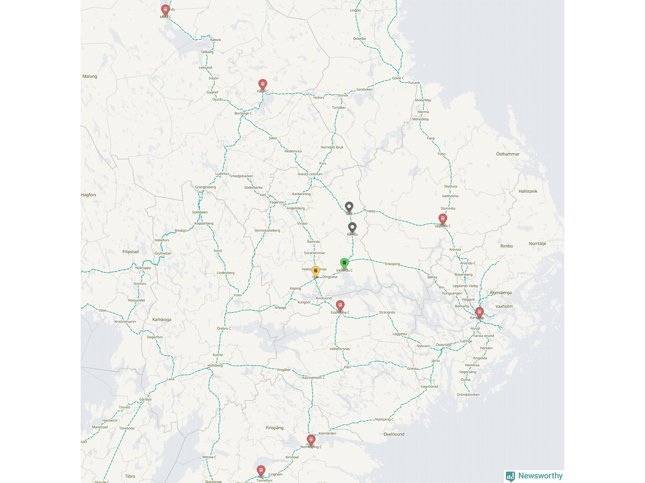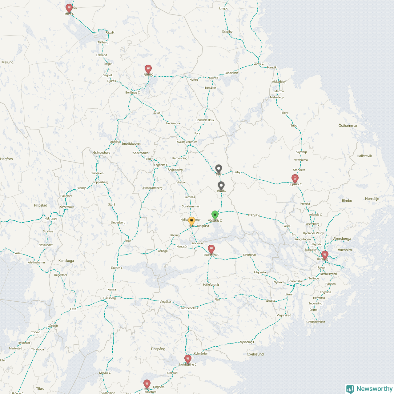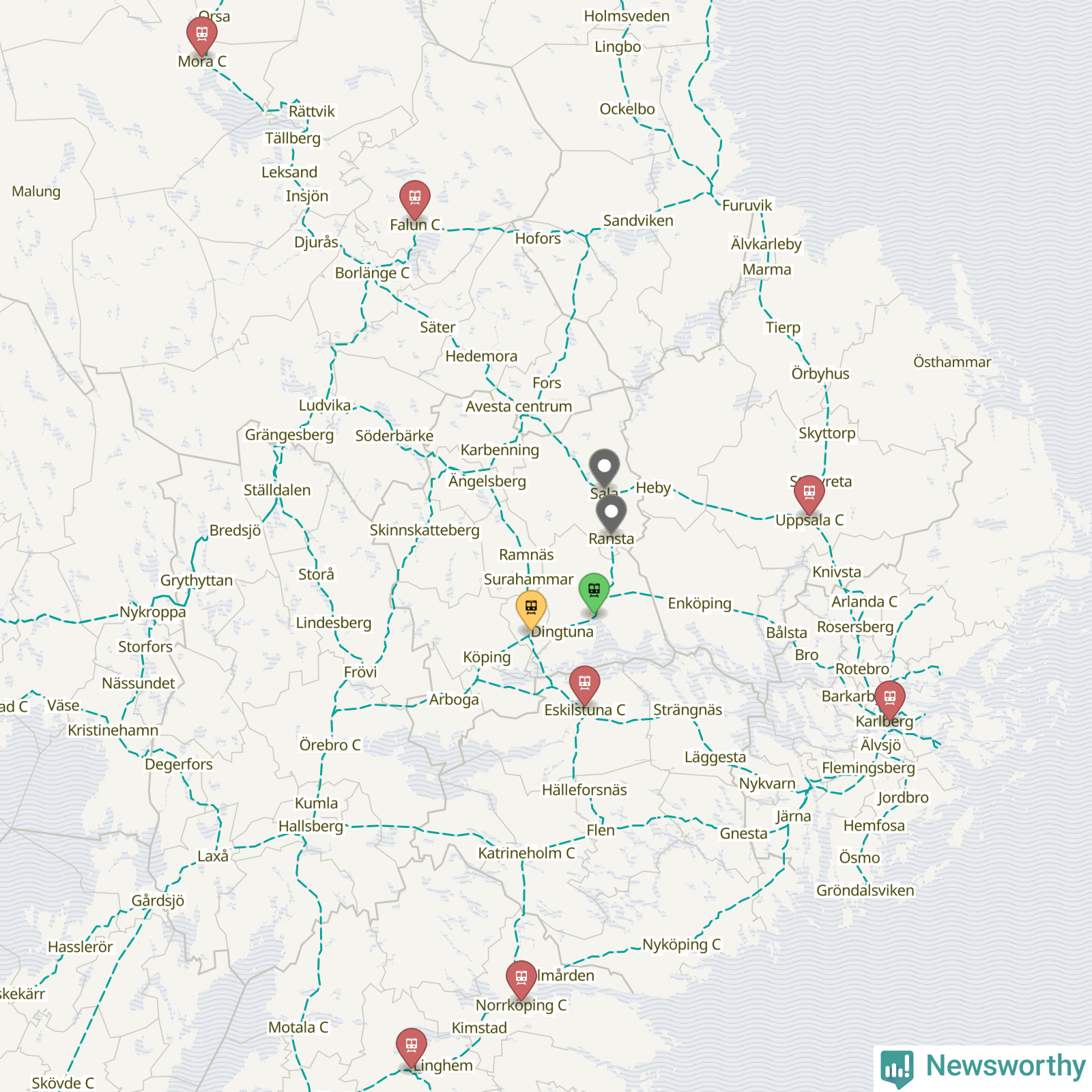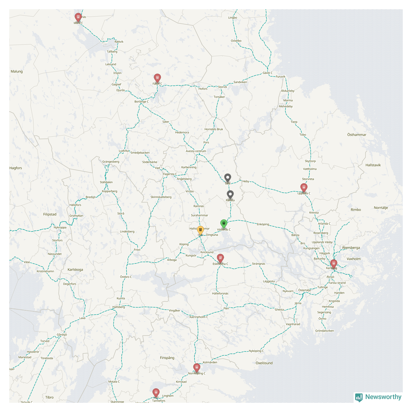 Kartdata från Mapbox, Newsworthy, OpenStreetMap och Trafikverket. Uppgifter om sträckor med passagerartrafik från jarnvag.net.