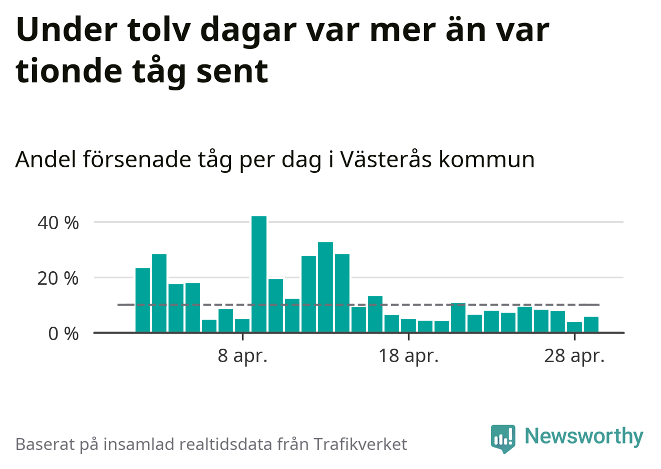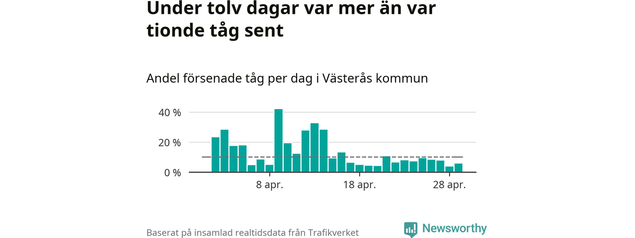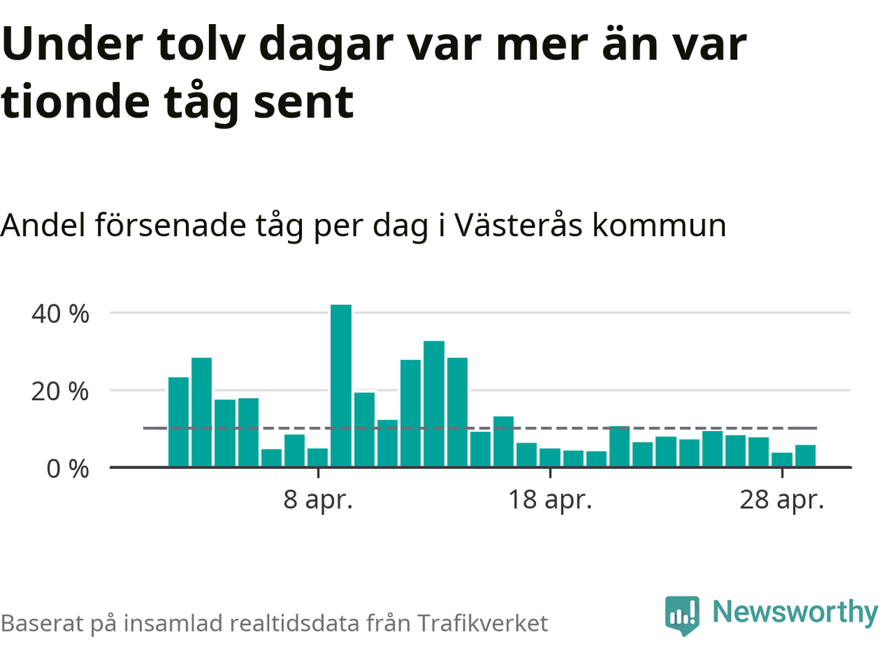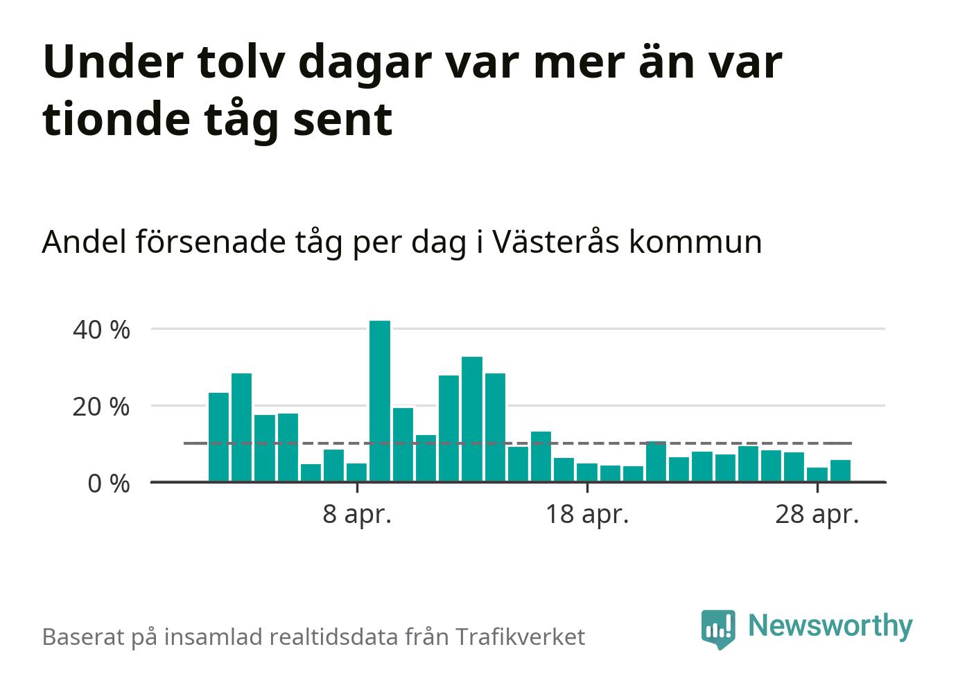 Under tolv av 30 dagar i april var mer än var tionde tåg i Västerås kommun försenat. Det visar Newsworthys sammanställning av alla tågförseningar förra månaden.