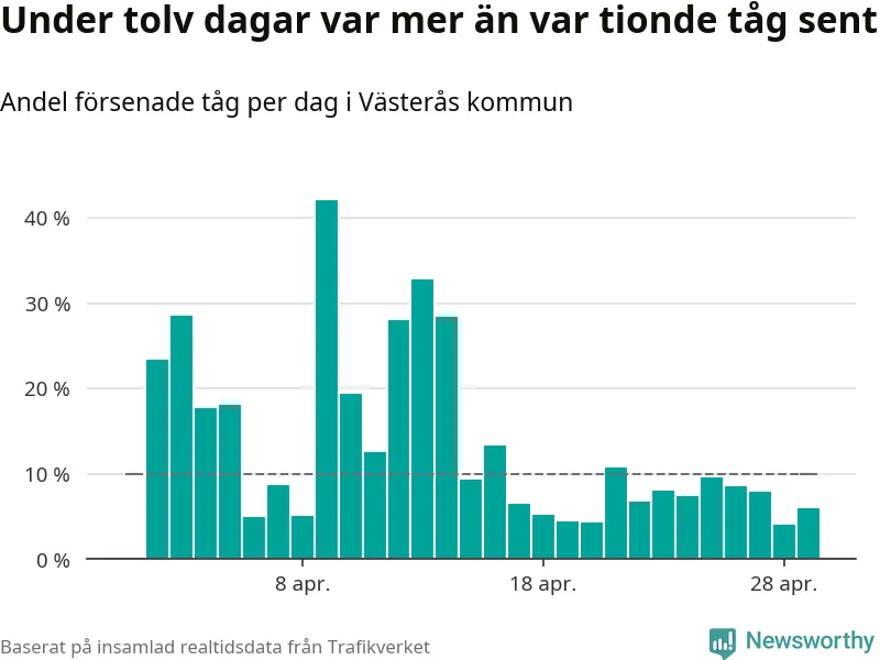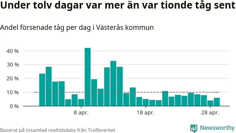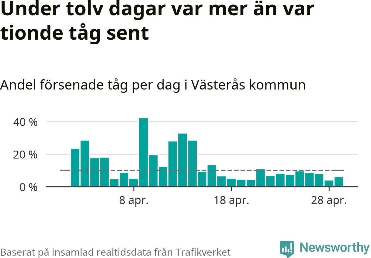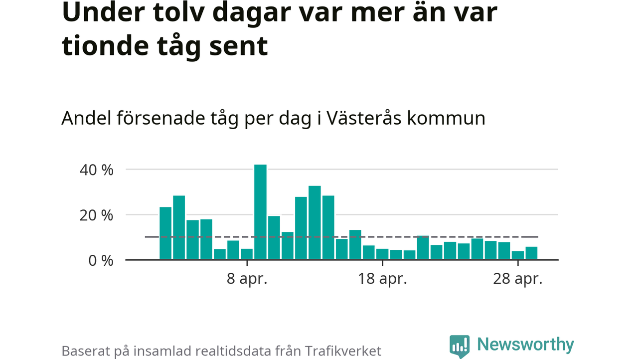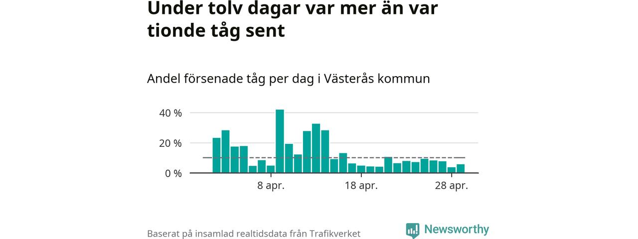 Under tolv av 30 dagar i april var mer än var tionde tåg i Västerås kommun försenat. Det visar Newsworthys sammanställning av alla tågförseningar förra månaden.