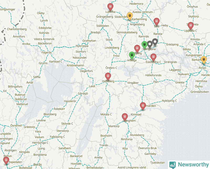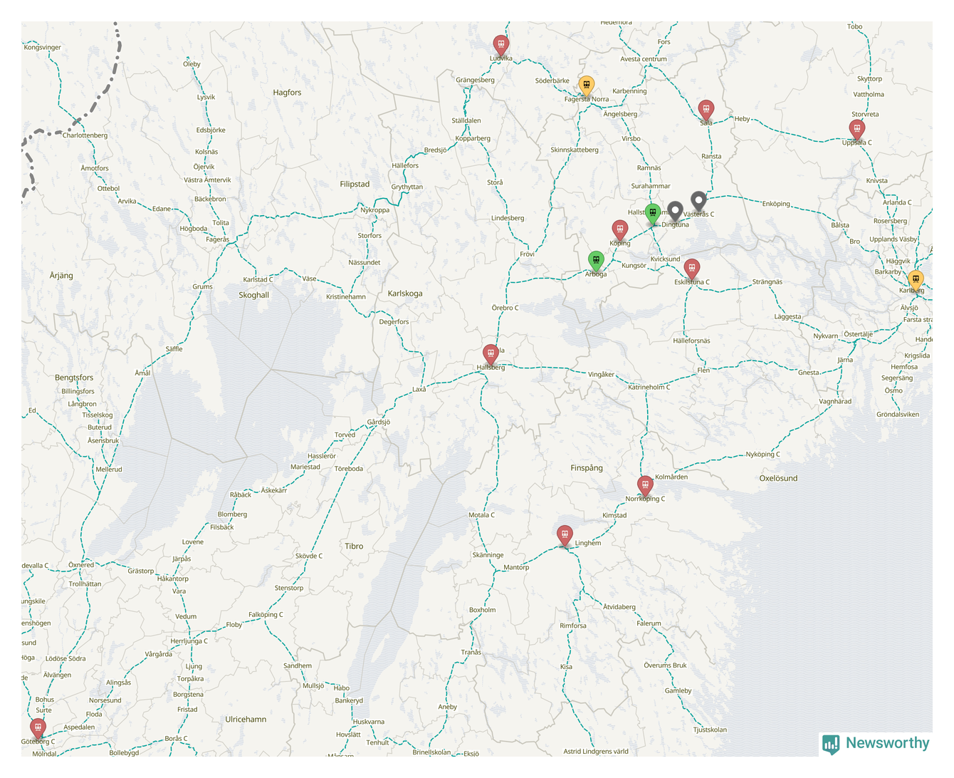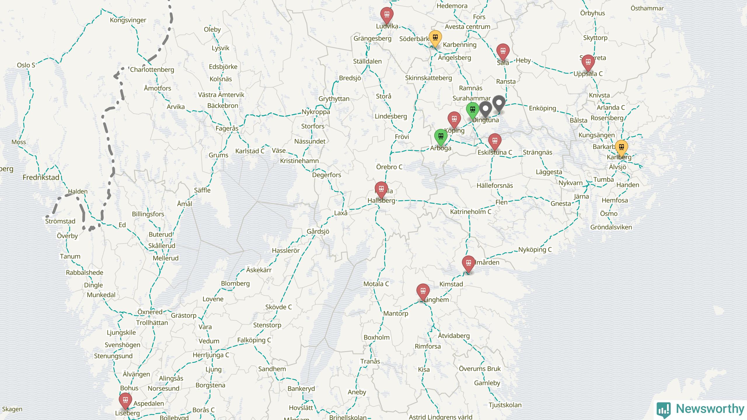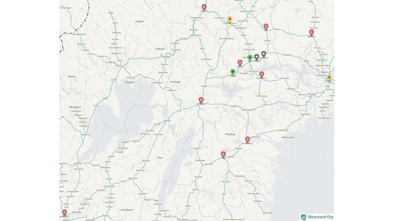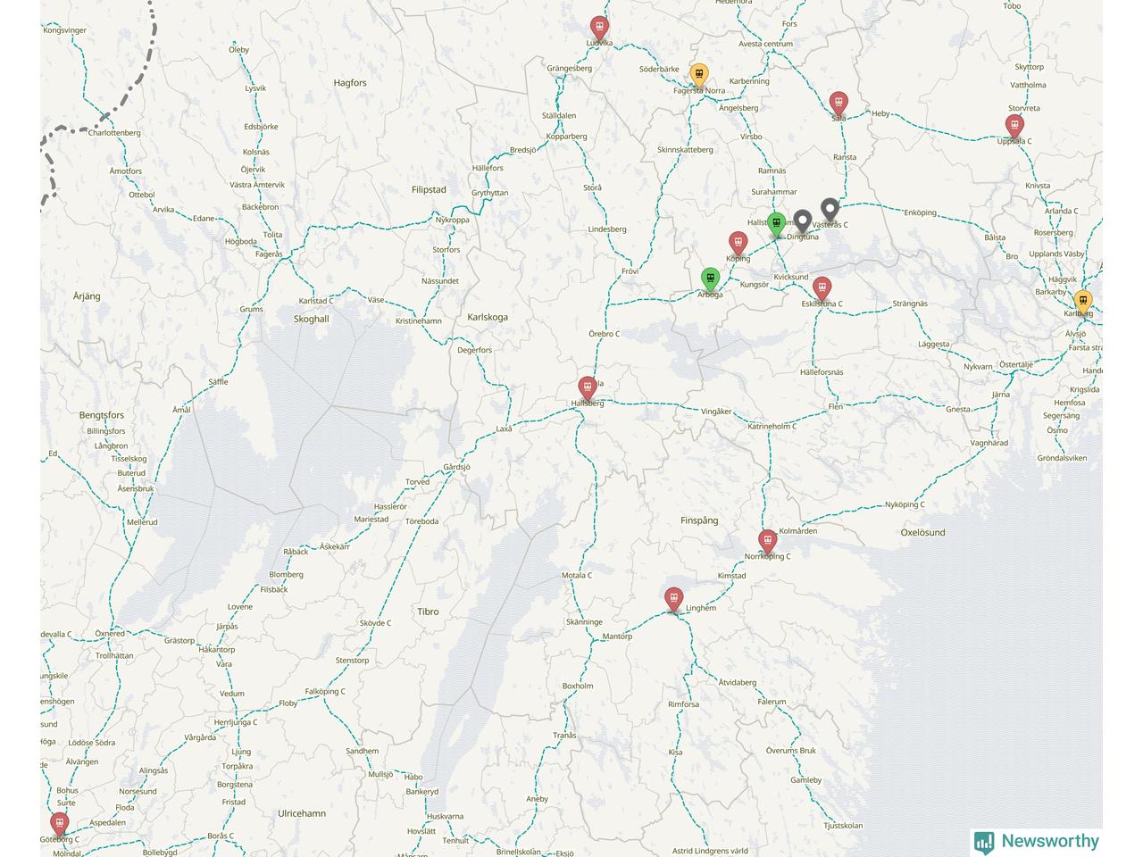 Kartdata från Mapbox, Newsworthy, OpenStreetMap och Trafikverket. Uppgifter om sträckor med passagerartrafik från jarnvag.net.