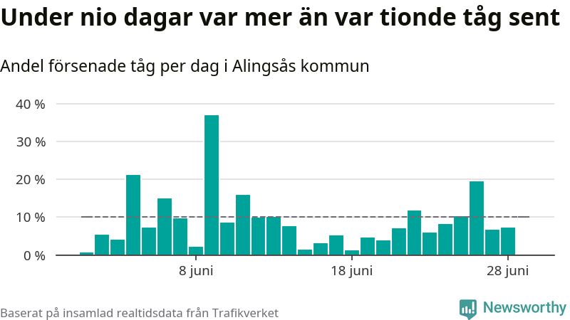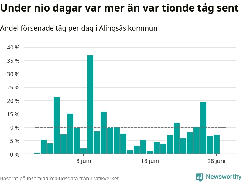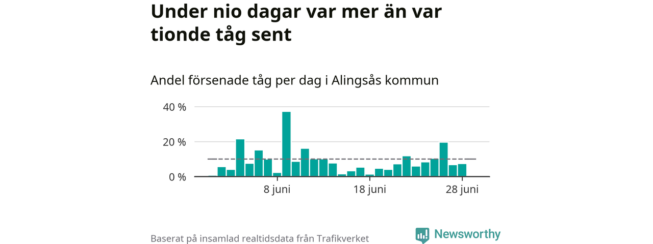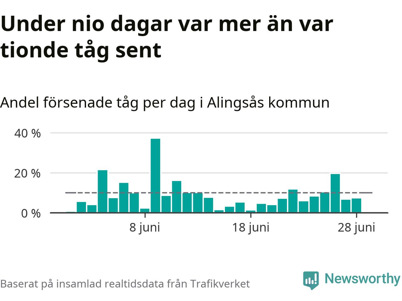 Totalt var nio procent av de ankommande tågen i Alingsås kommun mer än fem minuter försenade under juni bland de tåg som angjorde någon av stationerna Alingsås och Västra Bodarne. Fyra procent var så mycket som en kvart försenade.