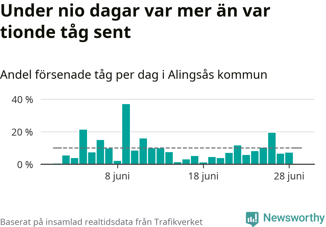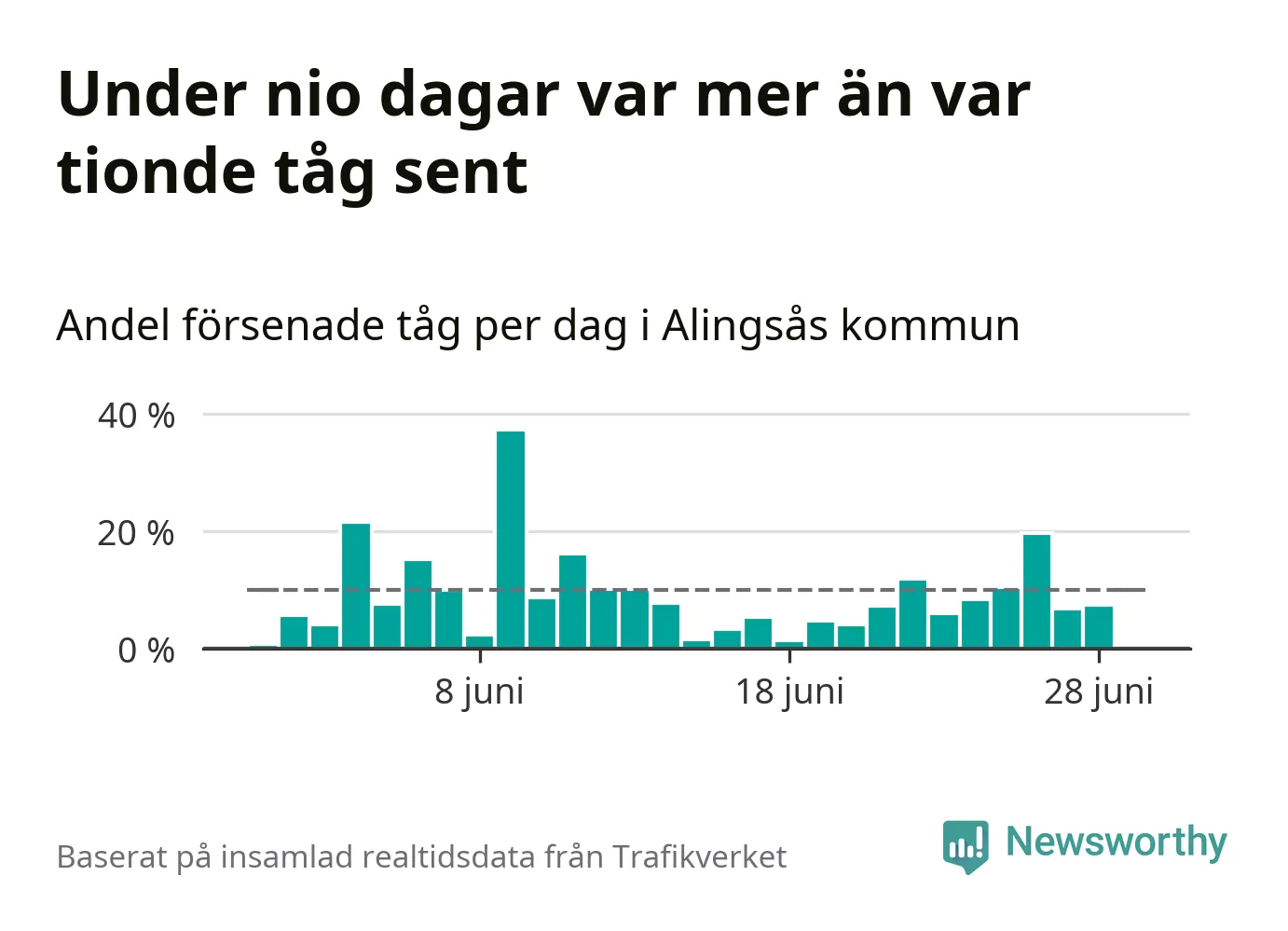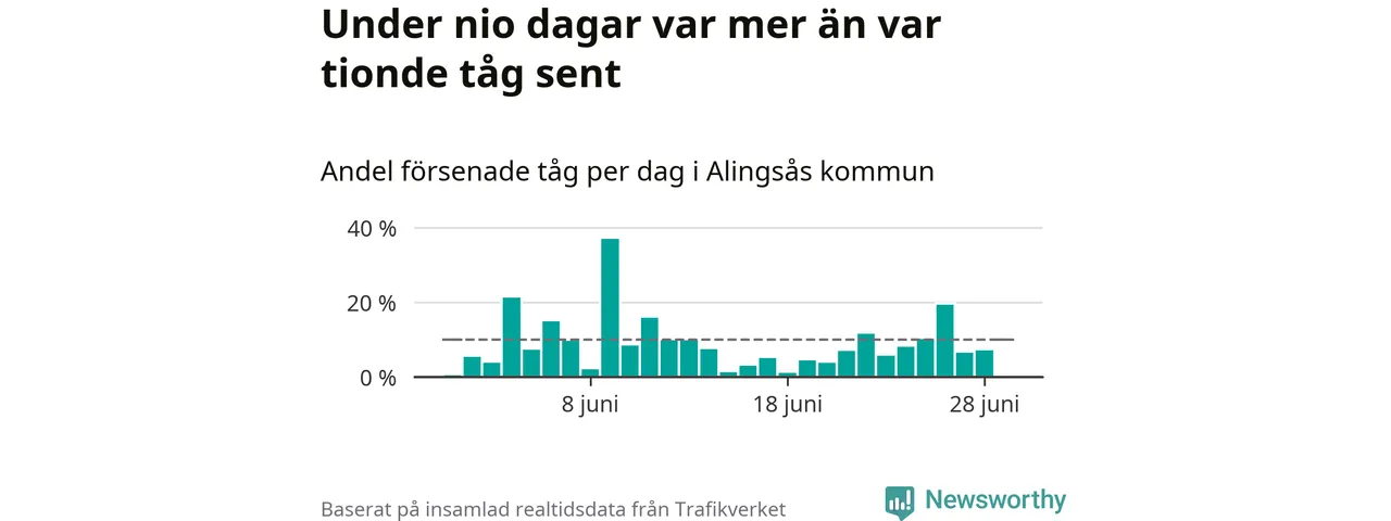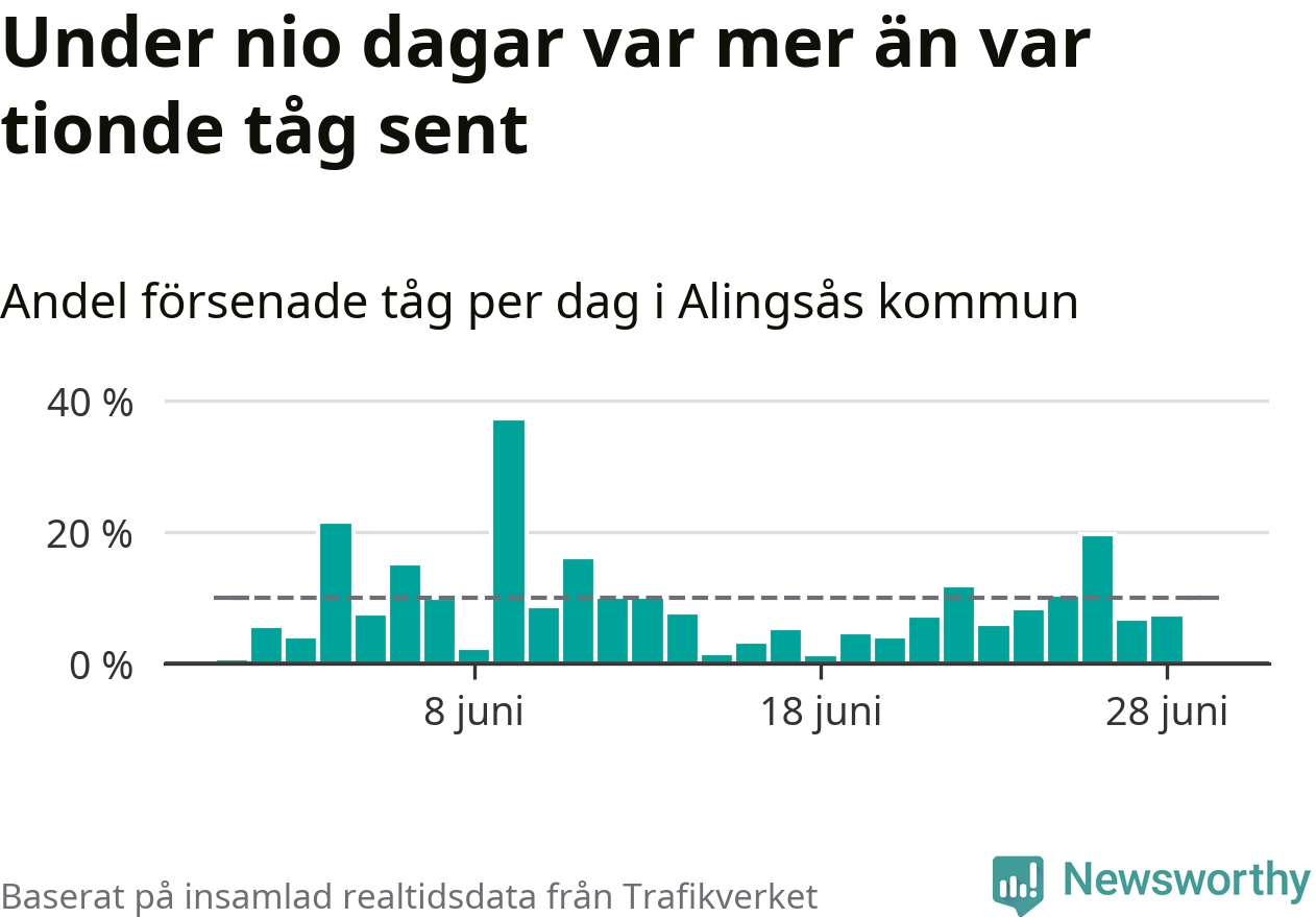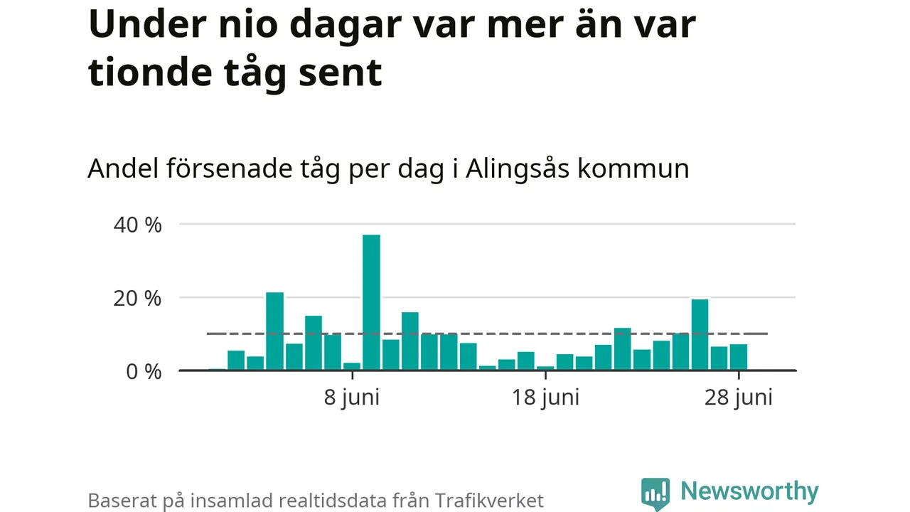 Den svenska tågtrafiken har dragits med historiskt dålig punktlig under första halvan av 2024. Juni månad har dock sett något bättre ut än maj. Newsworthy har samlat in tågens ankomsttider under juni, för att se hur stor andel av tågen till Alingsås kommun som var i tid under den senaste månaden.