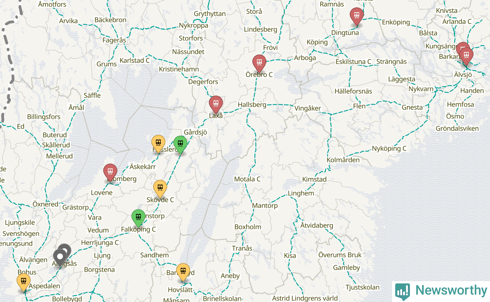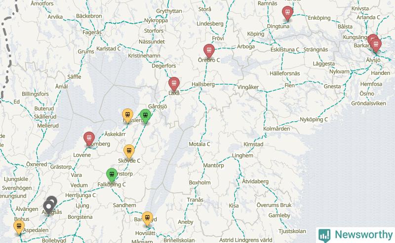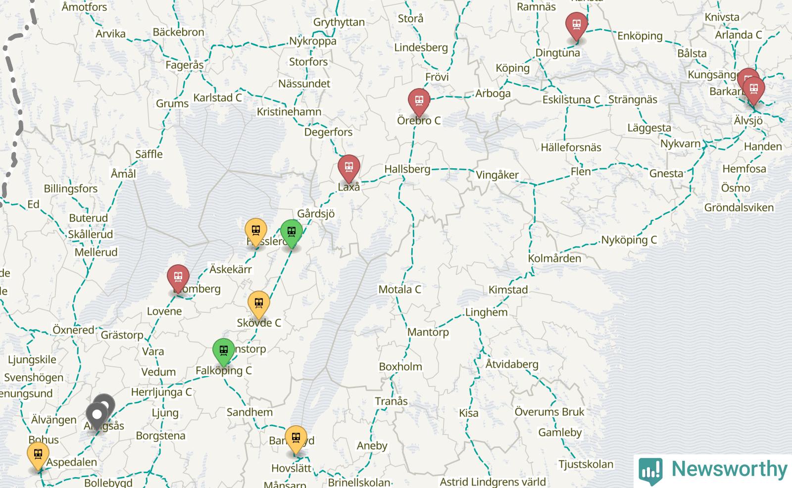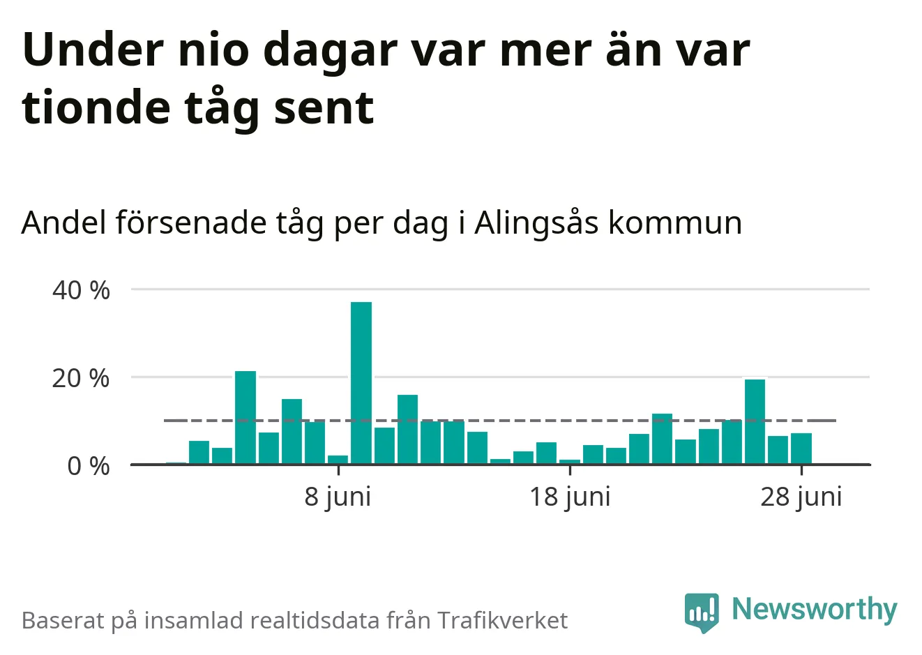 Den svenska tågtrafiken har dragits med historiskt dålig punktlig under första halvan av 2024. Juni månad har dock sett något bättre ut än maj. Newsworthy har samlat in tågens ankomsttider under juni, för att se hur stor andel av tågen till Alingsås kommun som var i tid under den senaste månaden.