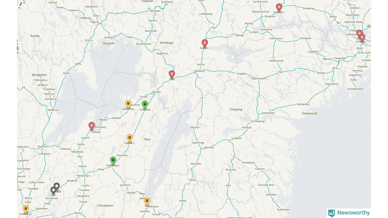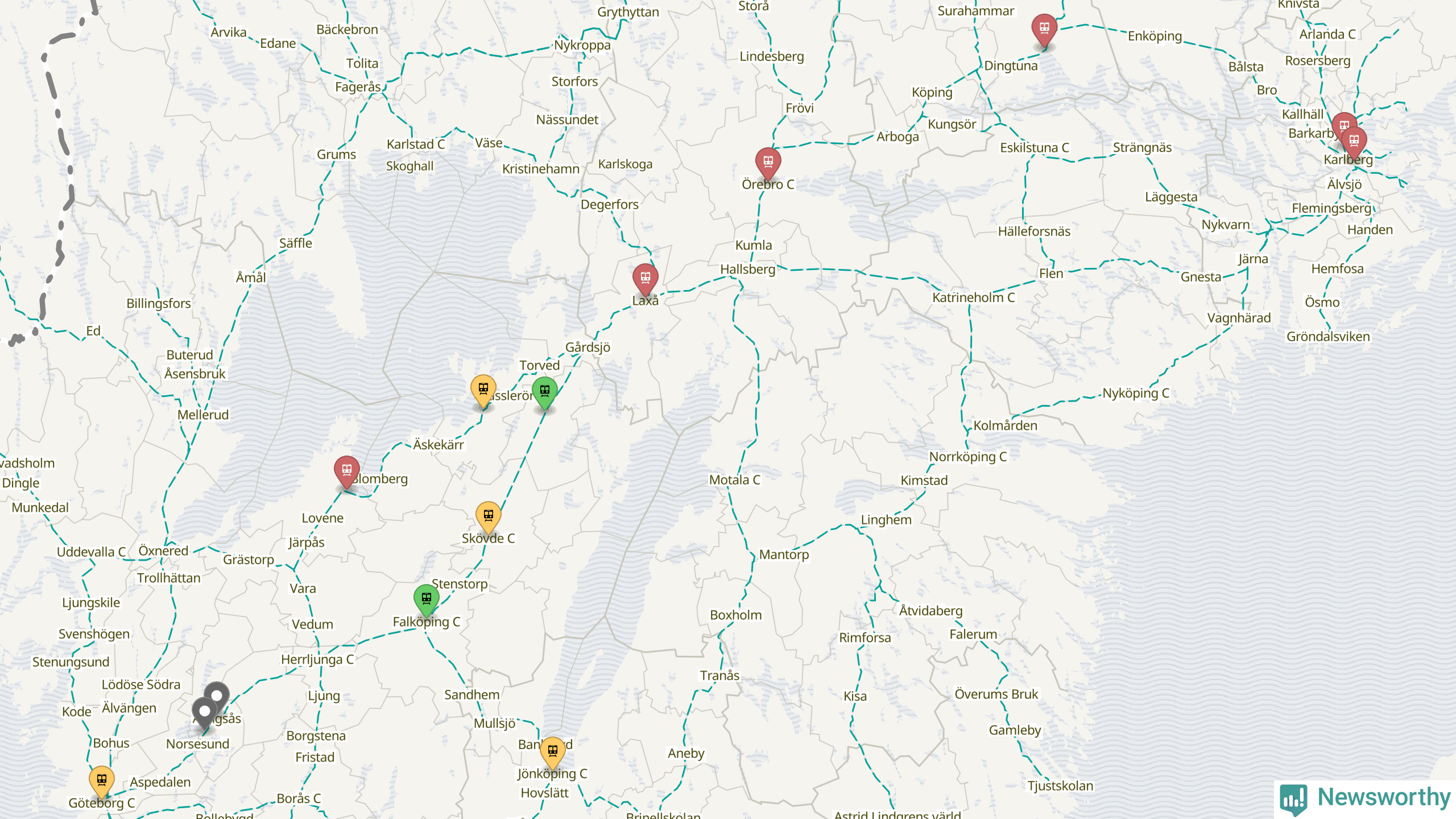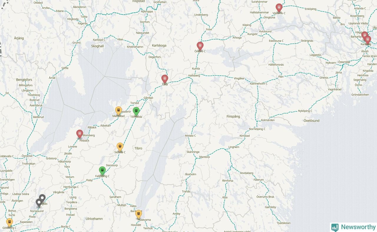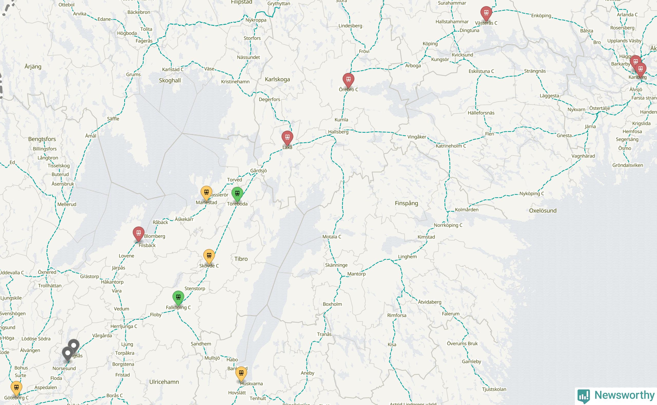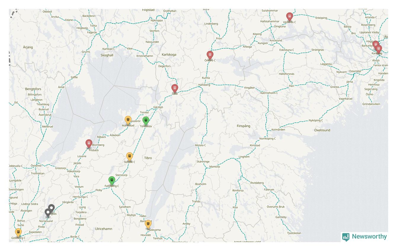 Kartdata från Mapbox, Newsworthy, OpenStreetMap och Trafikverket. Uppgifter om sträckor med passagerartrafik från jarnvag.net.