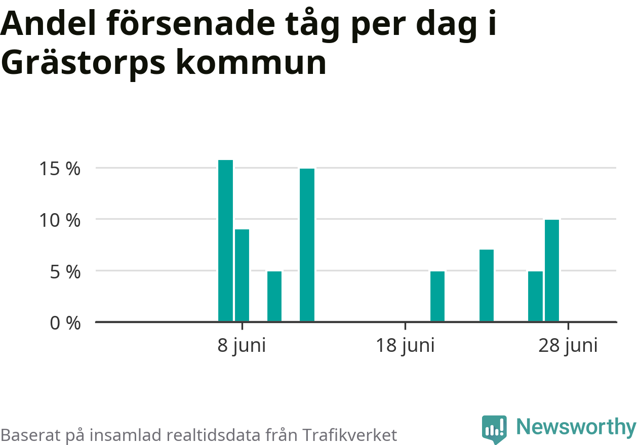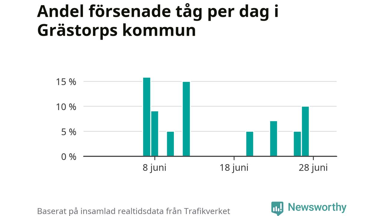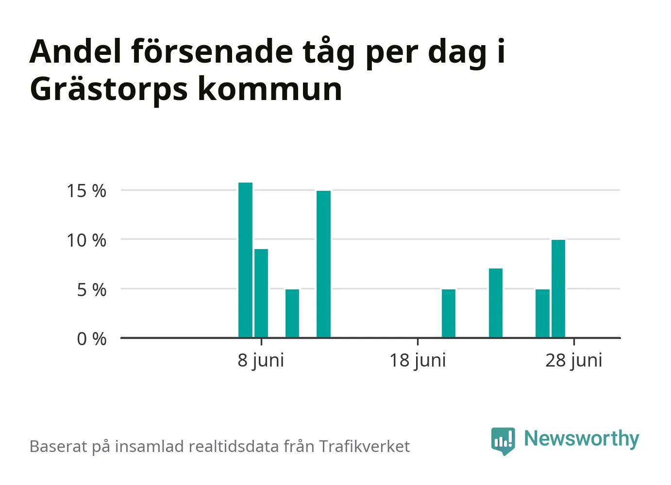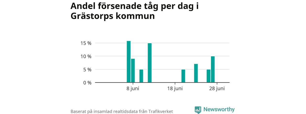 Den svenska tågtrafiken har dragits med historiskt dålig punktlig under första halvan av 2024. Juni månad har dock sett något bättre ut än maj. Newsworthy har samlat in tågens ankomsttider under juni, för att se hur stor andel av tågen till Grästorps kommun som var i tid under den senaste månaden.