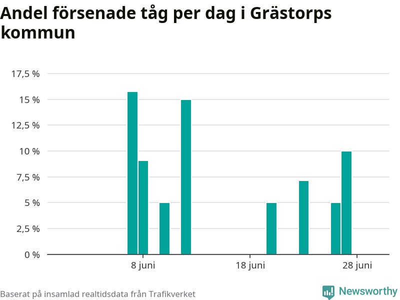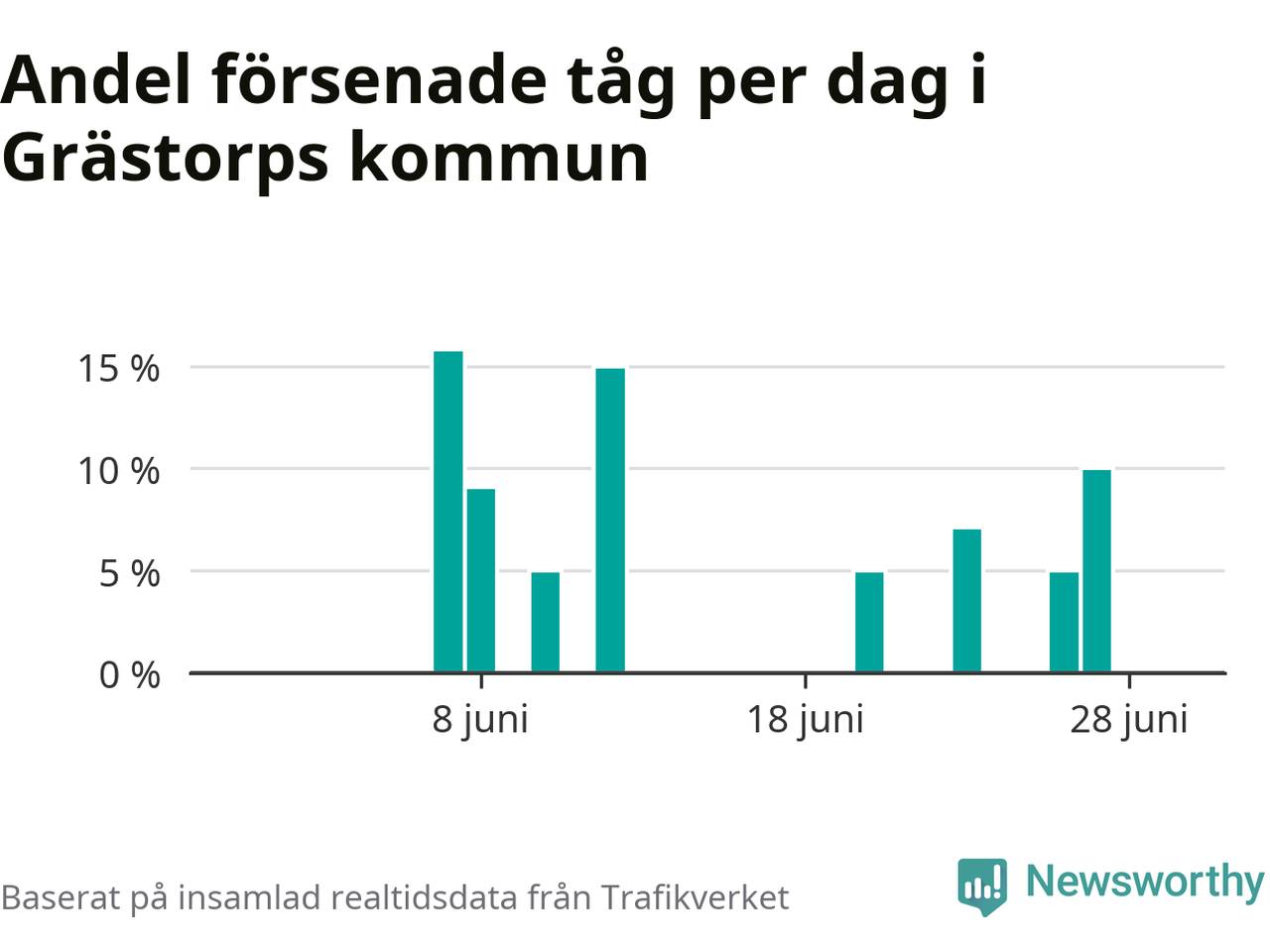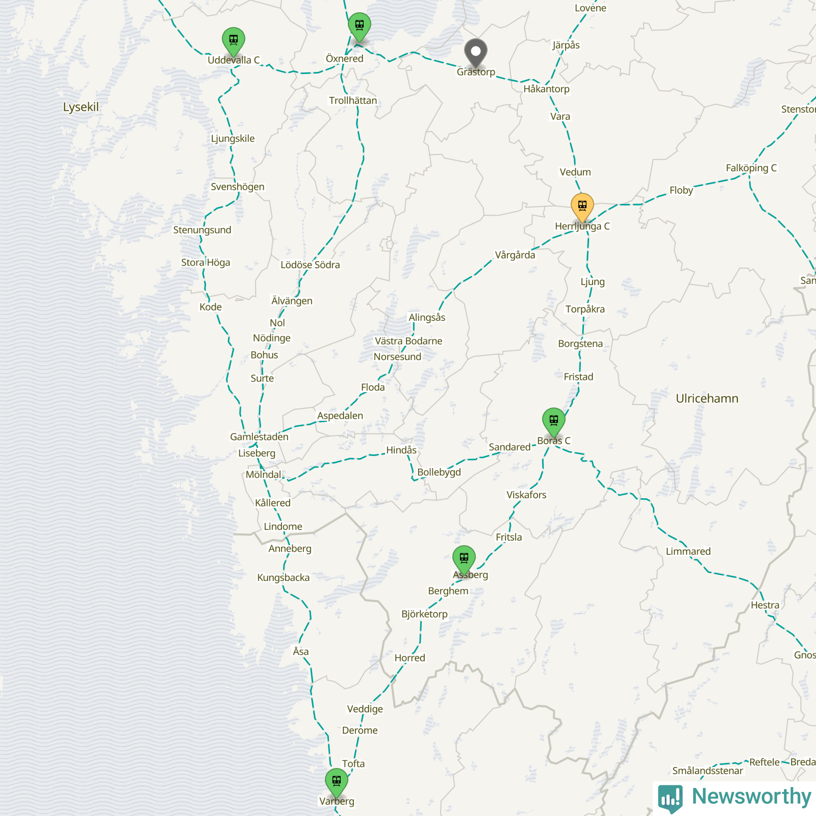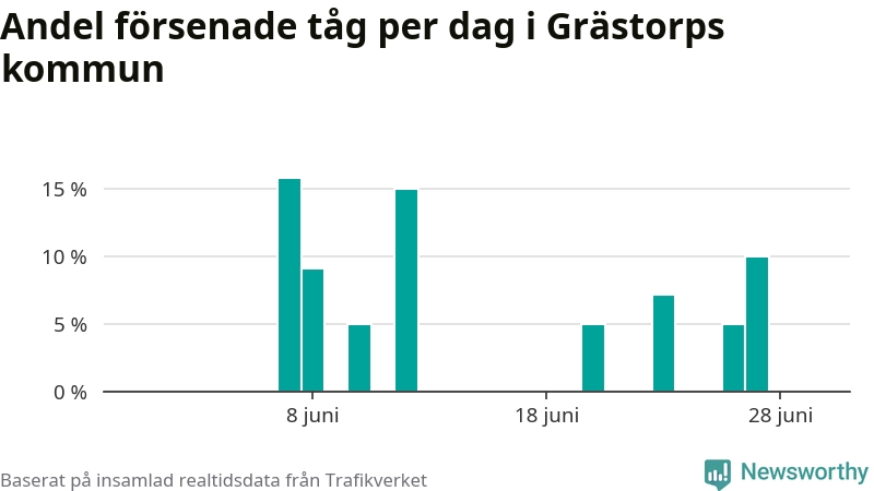 Den svenska tågtrafiken har dragits med historiskt dålig punktlig under första halvan av 2024. Juni månad har dock sett något bättre ut än maj. Newsworthy har samlat in tågens ankomsttider under juni, för att se hur stor andel av tågen till Grästorps kommun som var i tid under den senaste månaden.