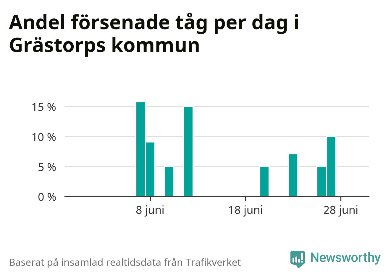 Totalt var tre procent av de ankommande tågen vid Grästorp mer än fem minuter försenade under juni. En procent var så mycket som en kvart försenade.