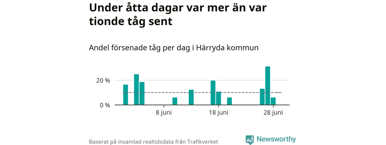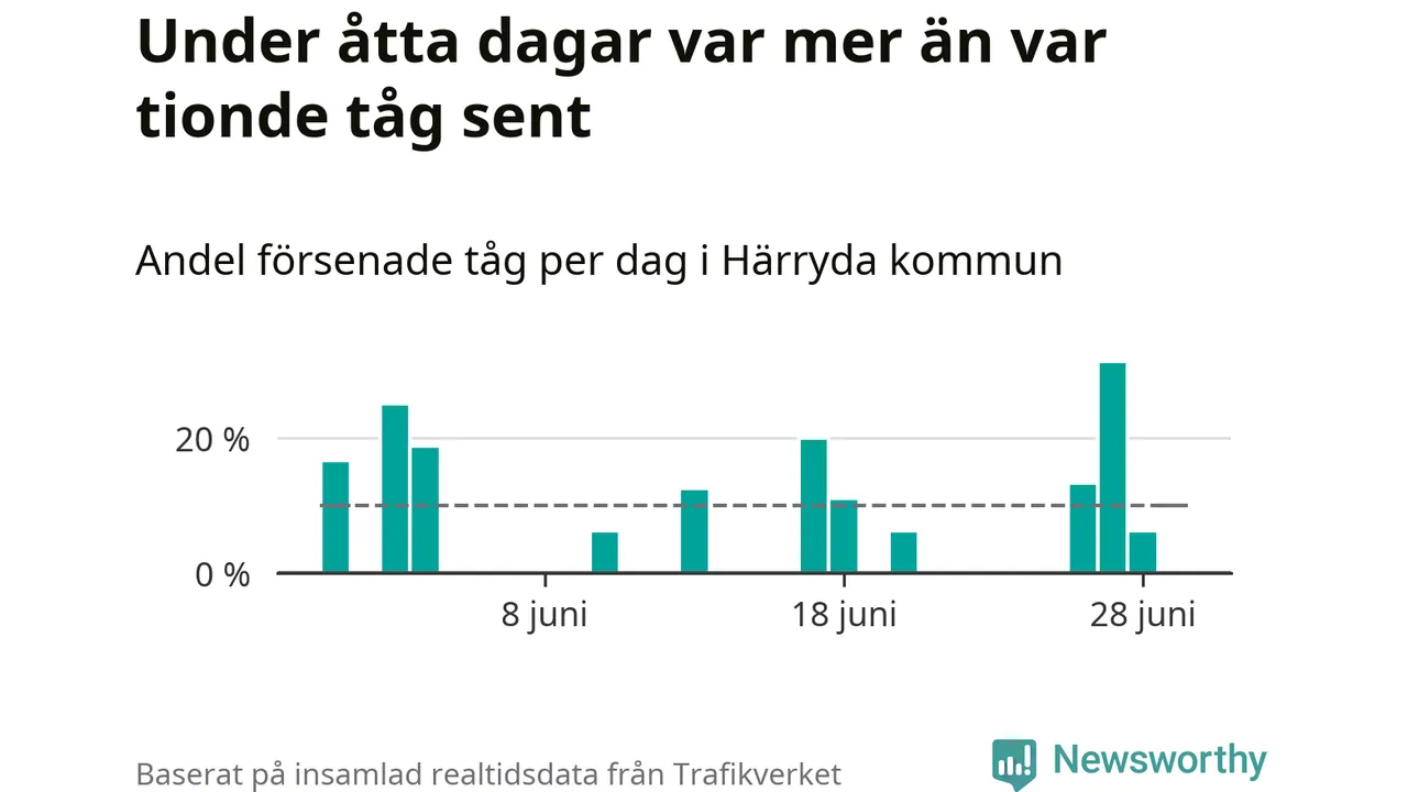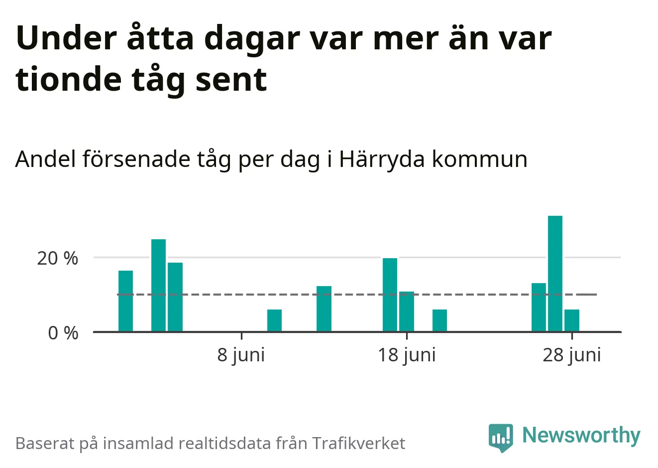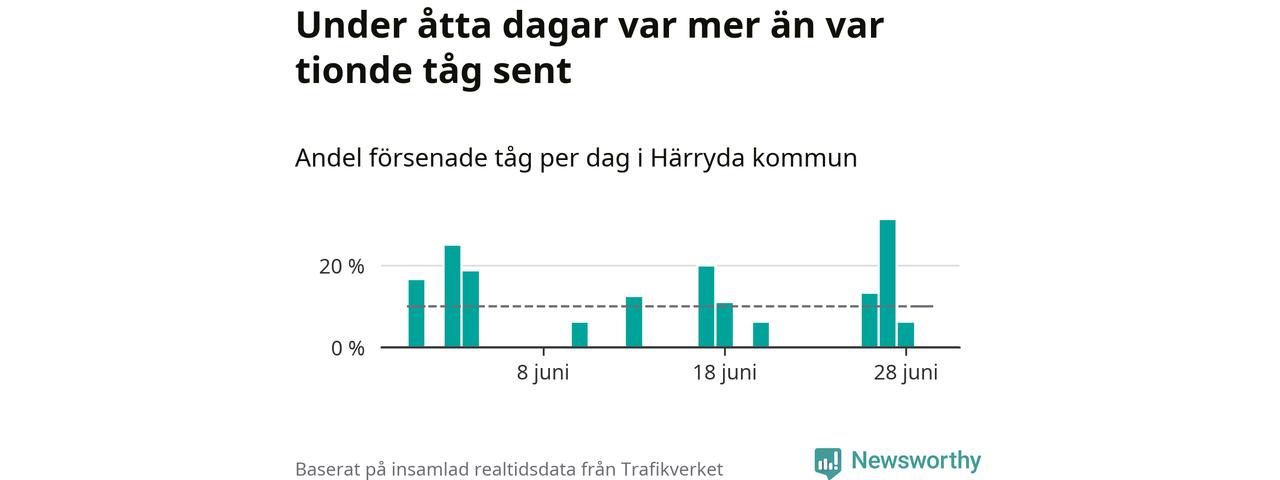 Den svenska tågtrafiken har dragits med historiskt dålig punktlig under första halvan av 2024. Juni månad har dock sett något bättre ut än maj. Newsworthy har samlat in tågens ankomsttider under juni, för att se hur stor andel av tågen till Härryda kommun som var i tid under den senaste månaden.