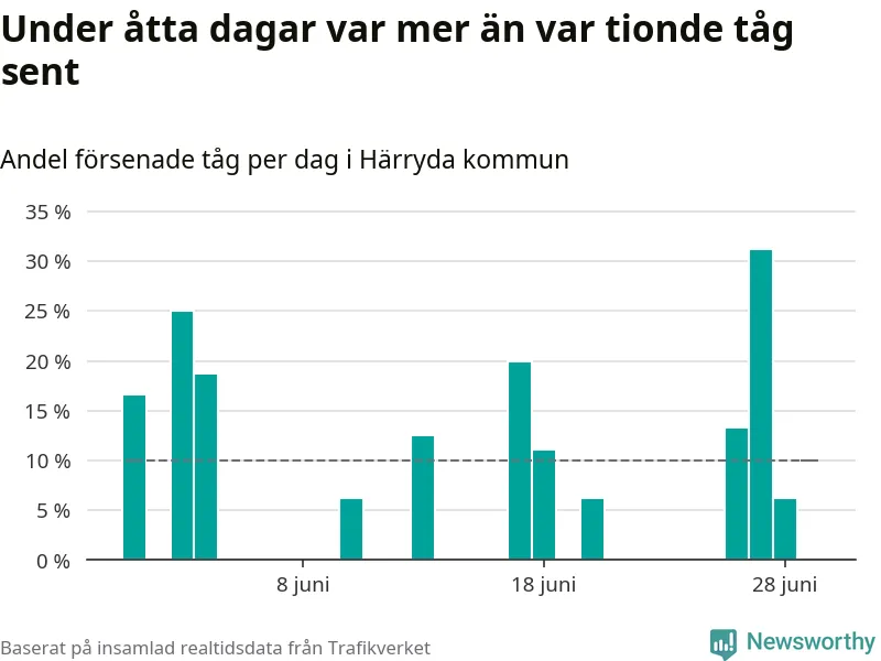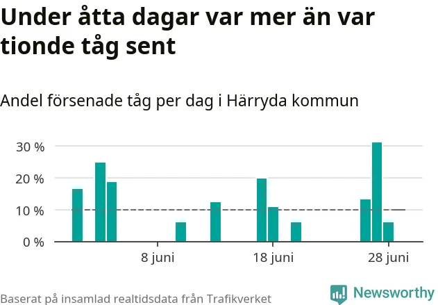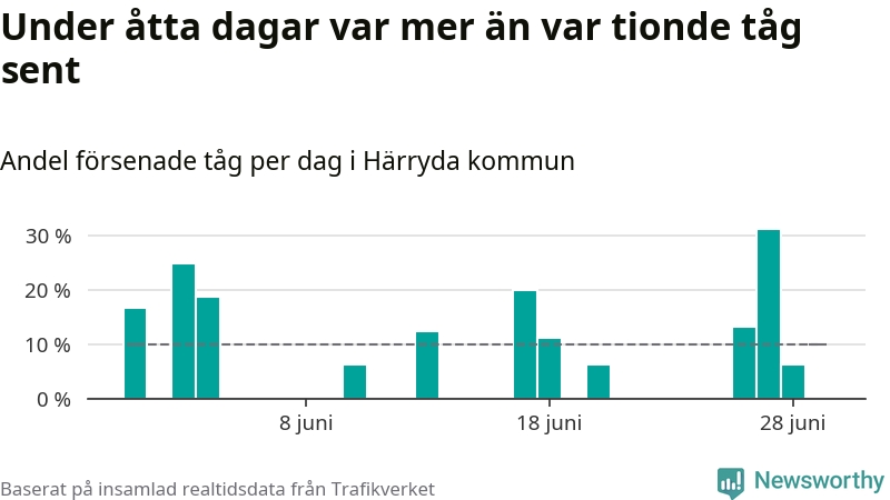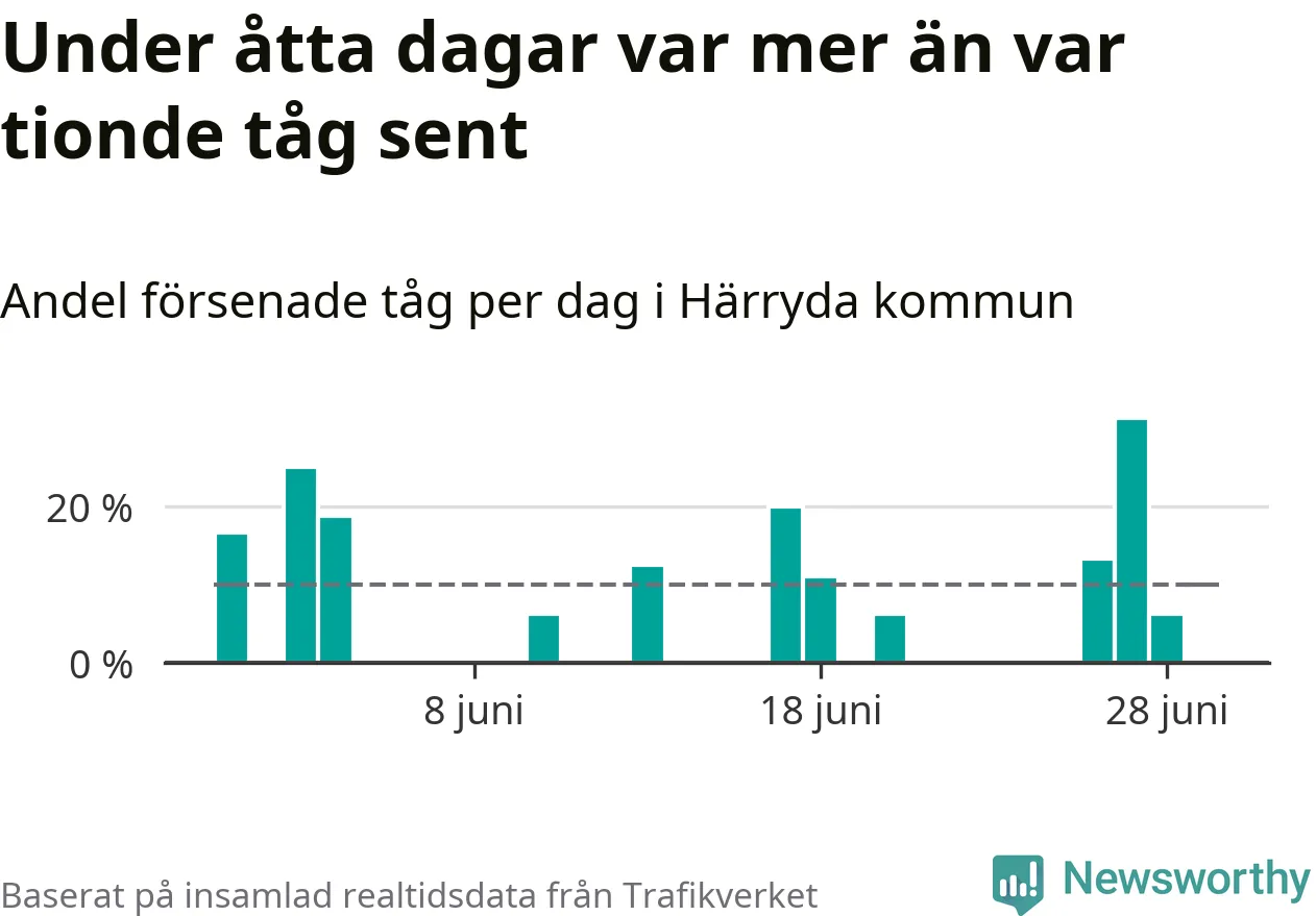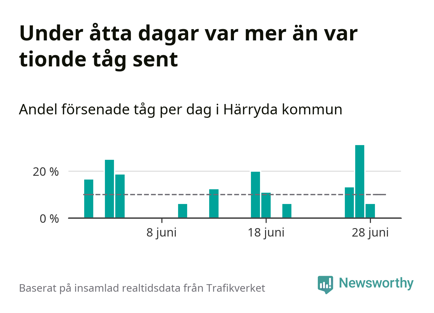 Den svenska tågtrafiken har dragits med historiskt dålig punktlig under första halvan av 2024. Juni månad har dock sett något bättre ut än maj. Newsworthy har samlat in tågens ankomsttider under juni, för att se hur stor andel av tågen till Härryda kommun som var i tid under den senaste månaden.