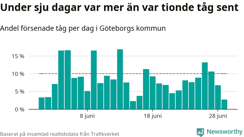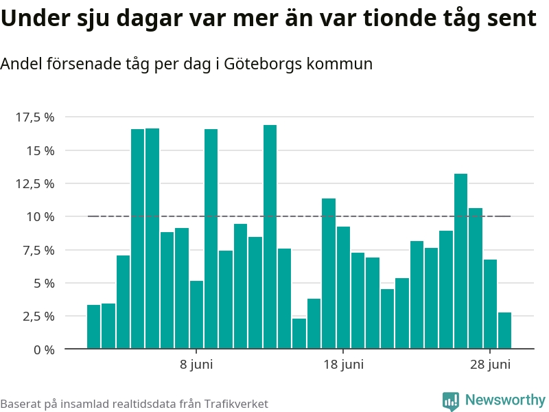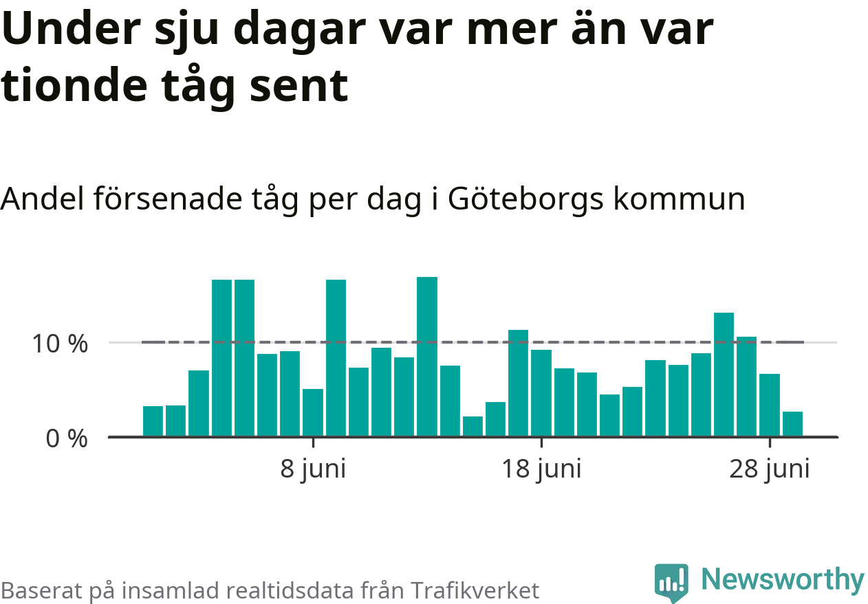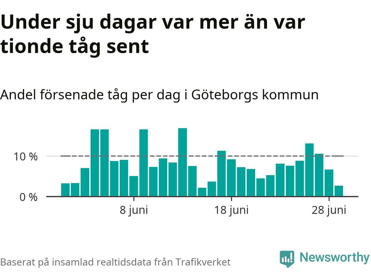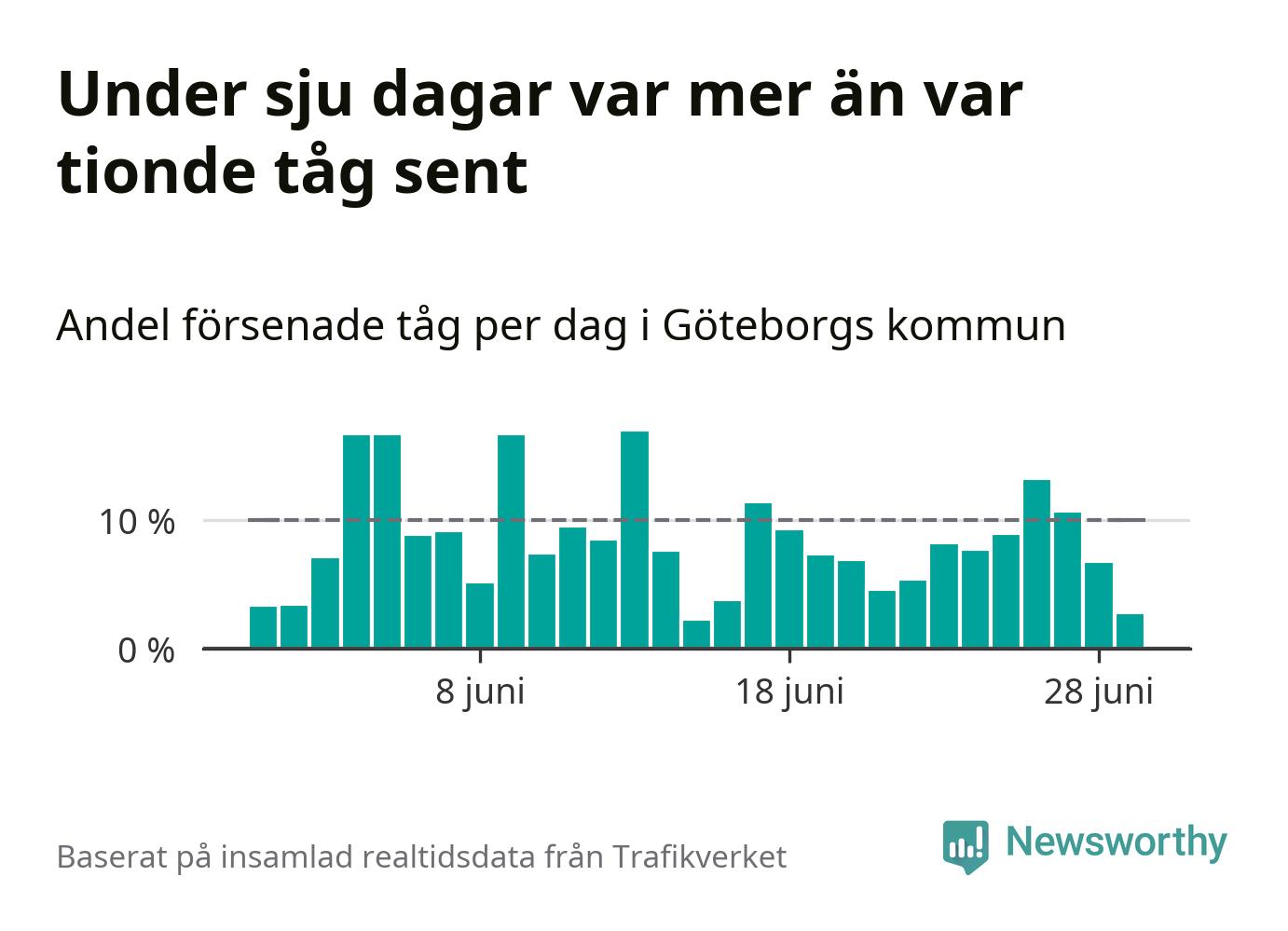 Dagen med flest sena tåg var torsdag den 13 juni, när 17 procent av tågen var mer än fem minuter försenade. Under sju dagar var mer än var tionde tåg sent.