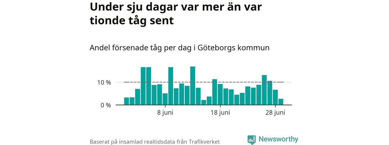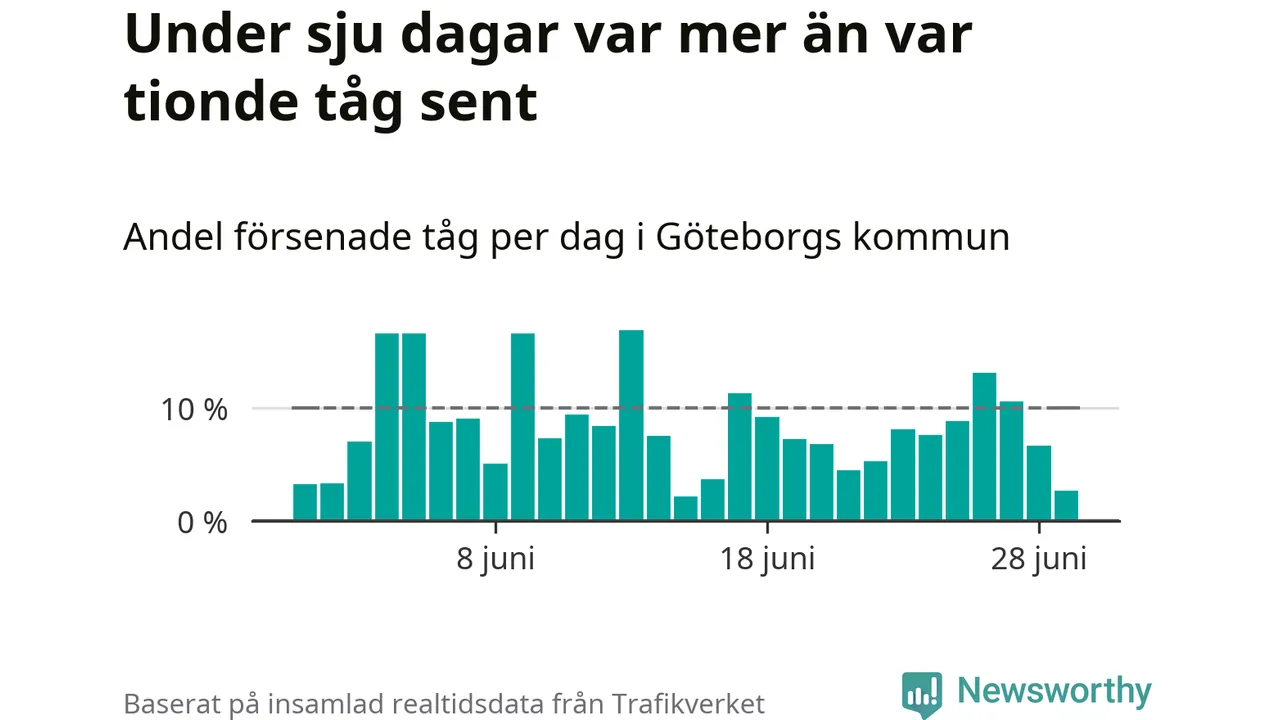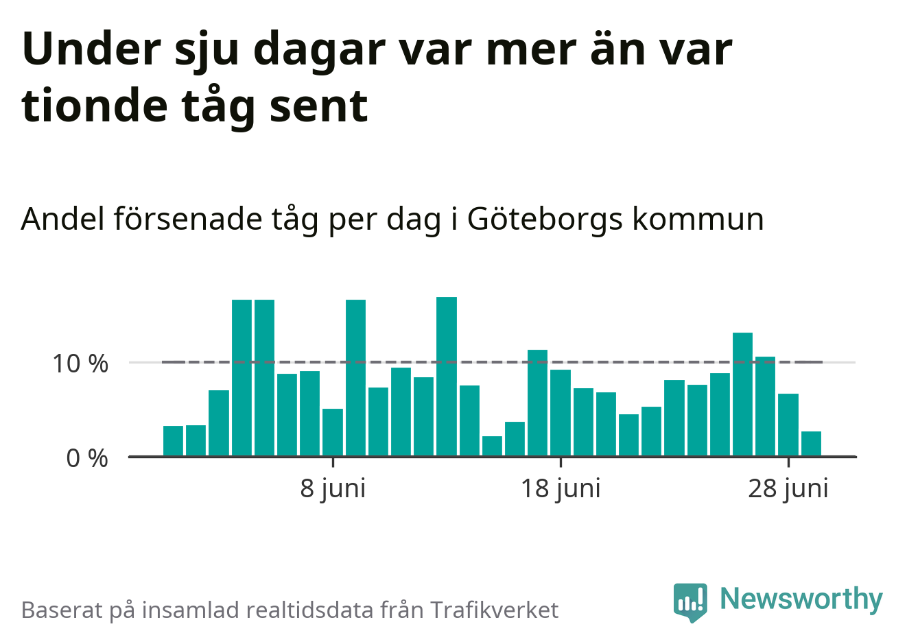 Nio procent av tågen i Göteborg var sena under juni, och sträckan Göteborg–Solna var extra drabbad. Det visar Newsworthys sammanställning av alla sena och inställda förra månaden.