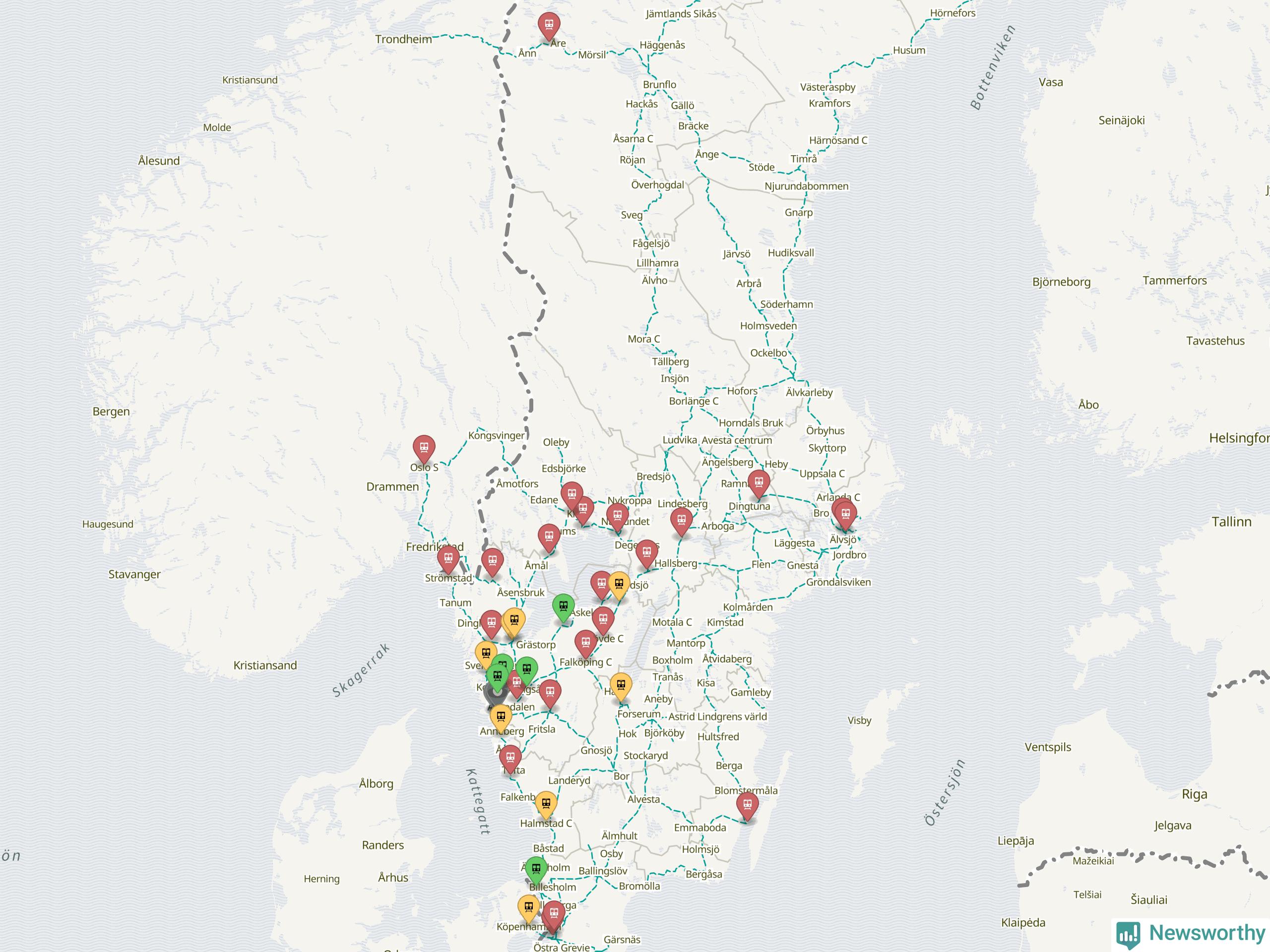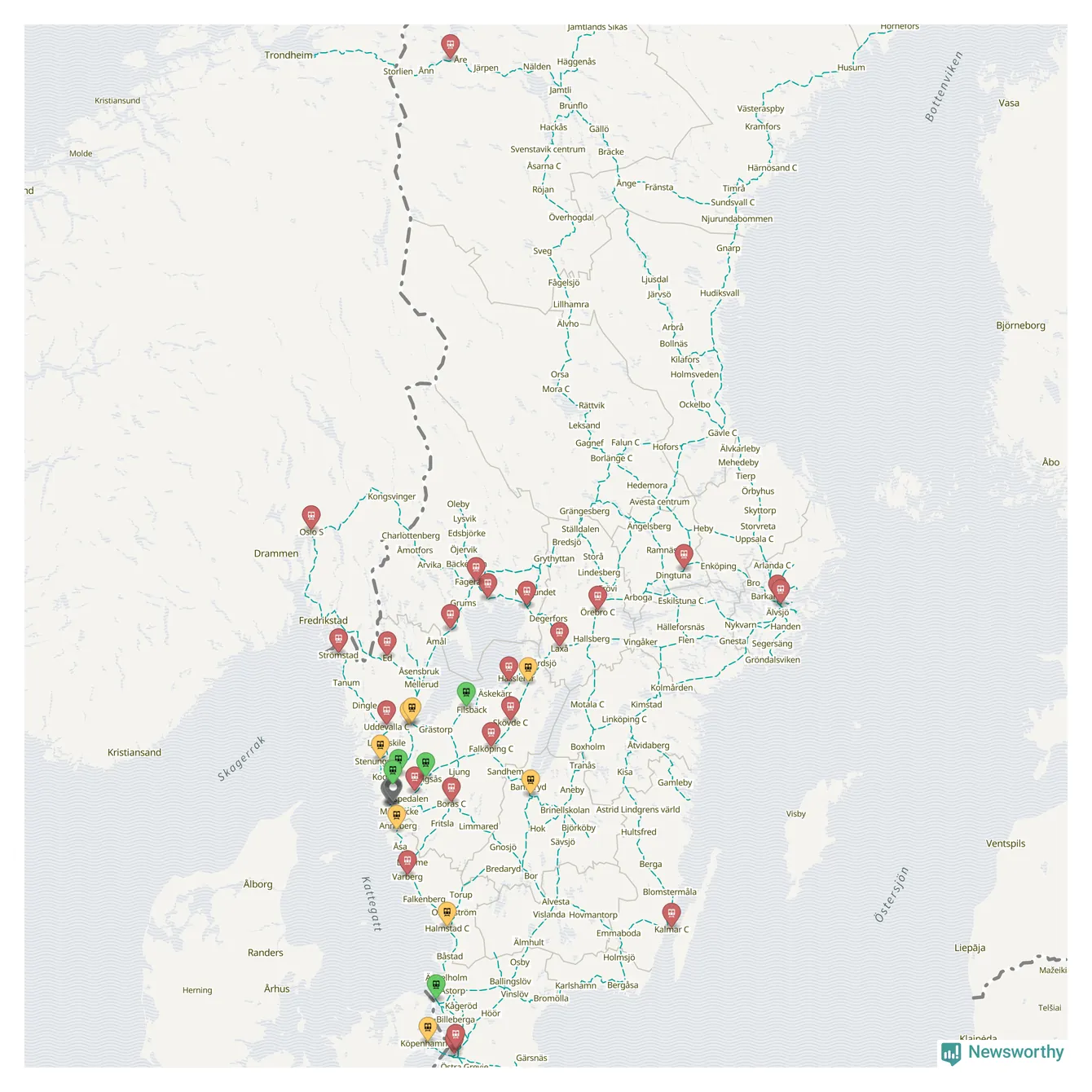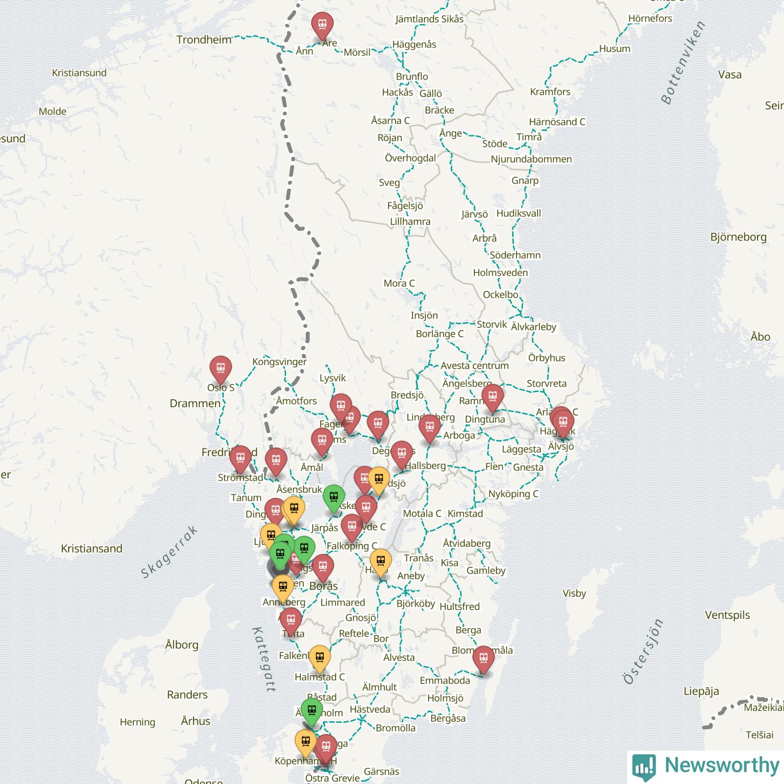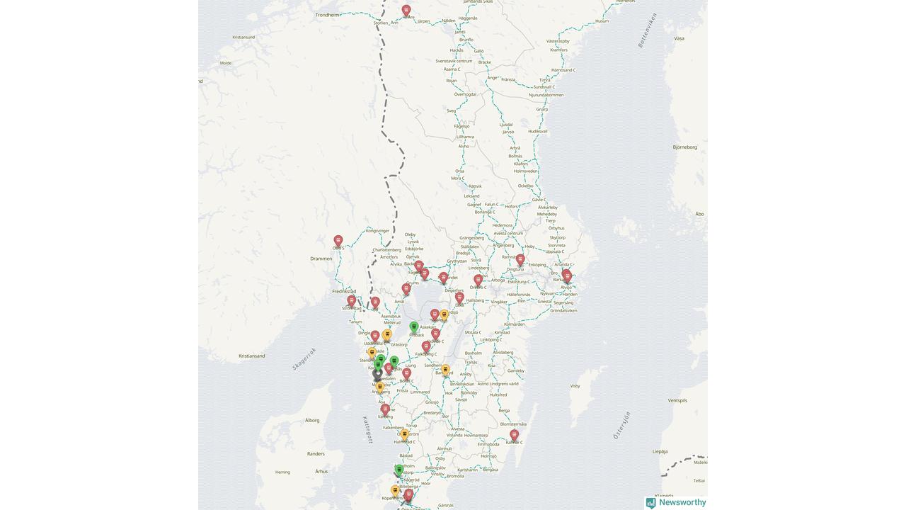 Kartdata från Mapbox, Newsworthy, OpenStreetMap och Trafikverket. Uppgifter om sträckor med passagerartrafik från jarnvag.net.