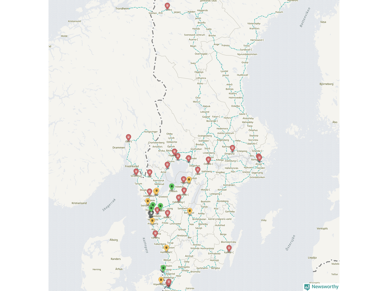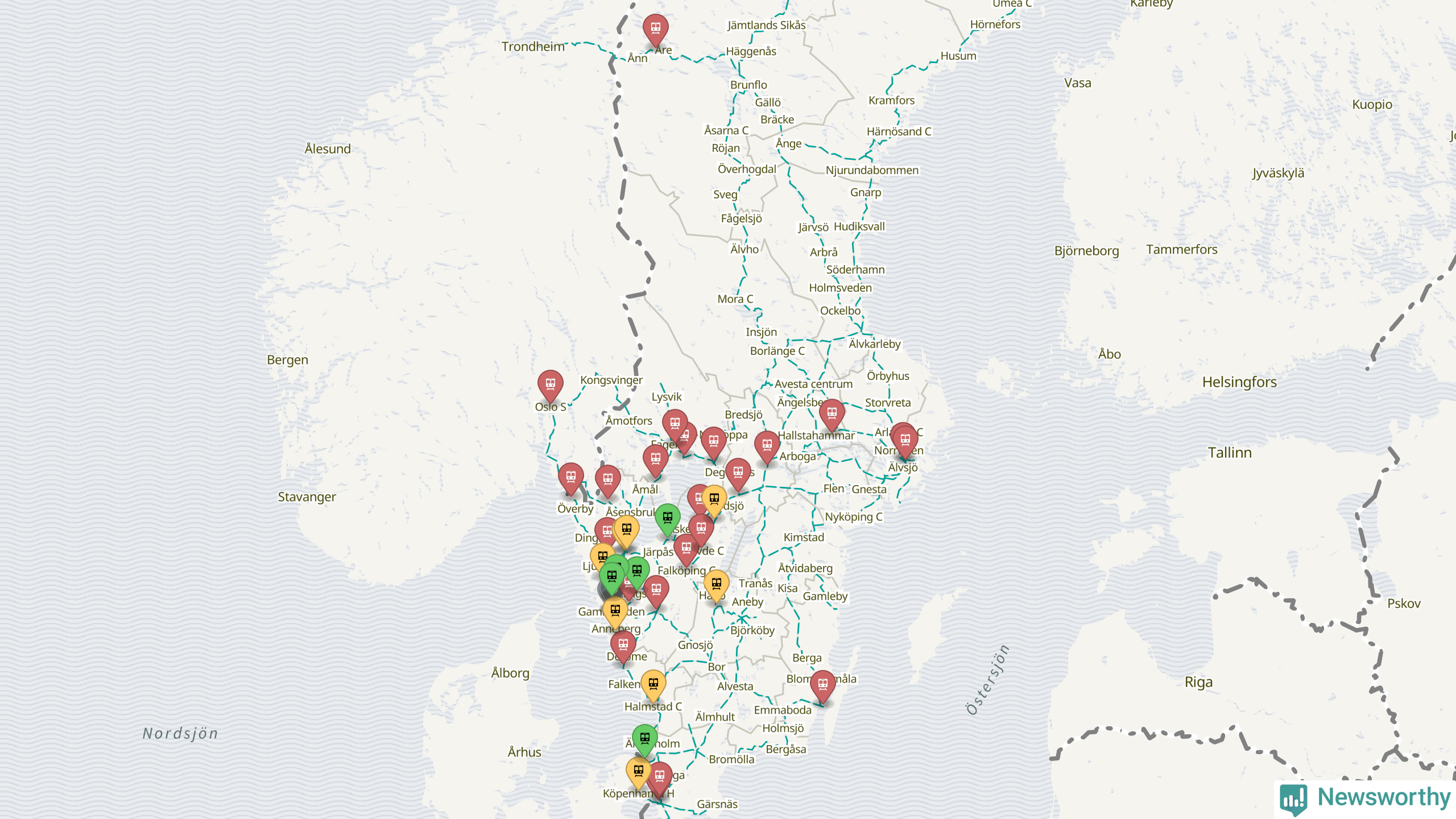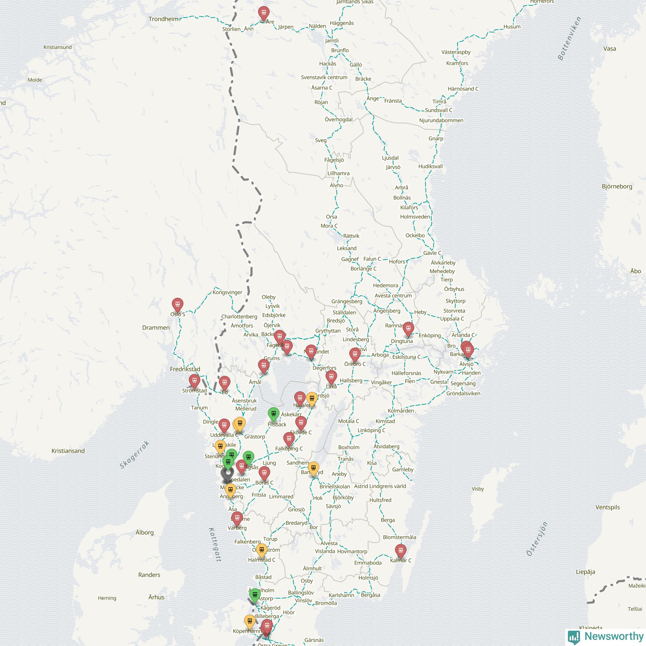Kartdata från Mapbox, Newsworthy, OpenStreetMap och Trafikverket. Uppgifter om sträckor med passagerartrafik från jarnvag.net.