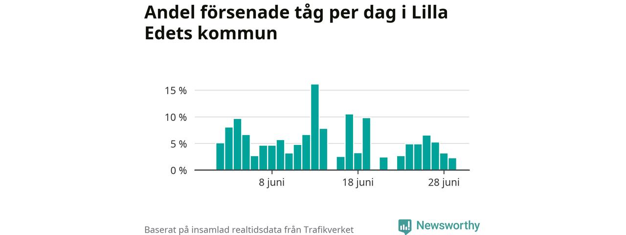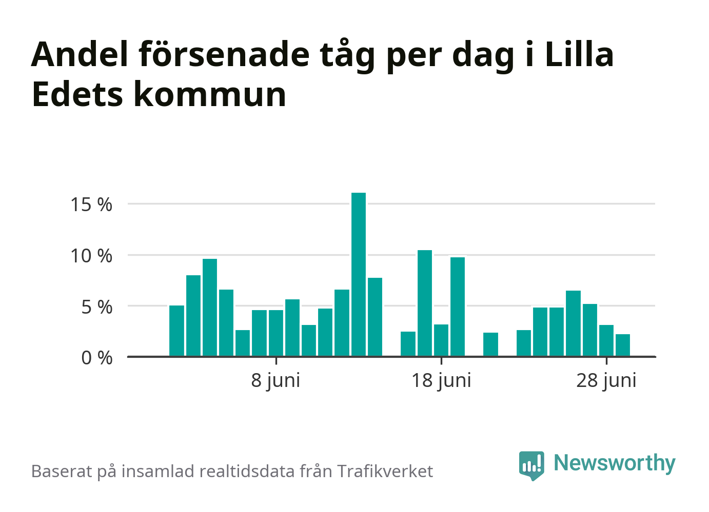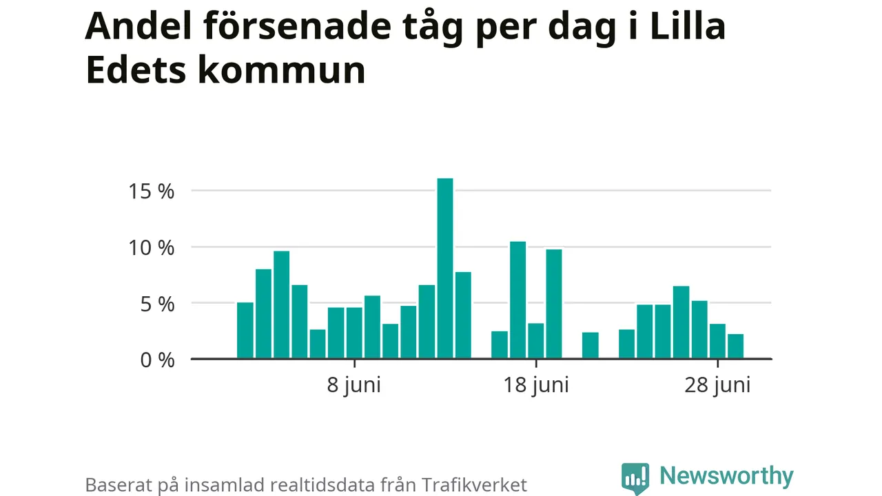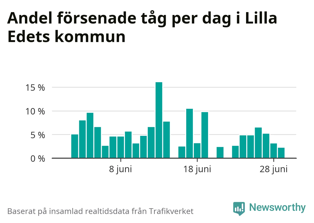 Den svenska tågtrafiken har dragits med historiskt dålig punktlig under första halvan av 2024. Juni månad har dock sett något bättre ut än maj. Newsworthy har samlat in tågens ankomsttider under juni, för att se hur stor andel av tågen till Lilla Edets kommun som var i tid under den senaste månaden.