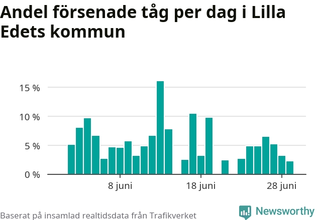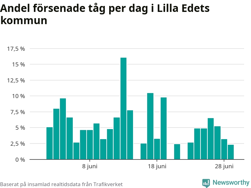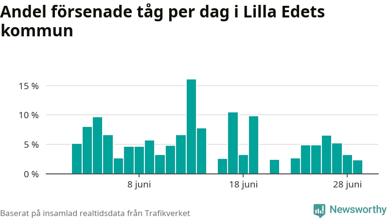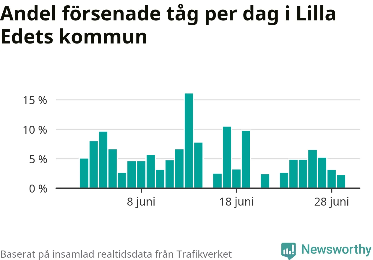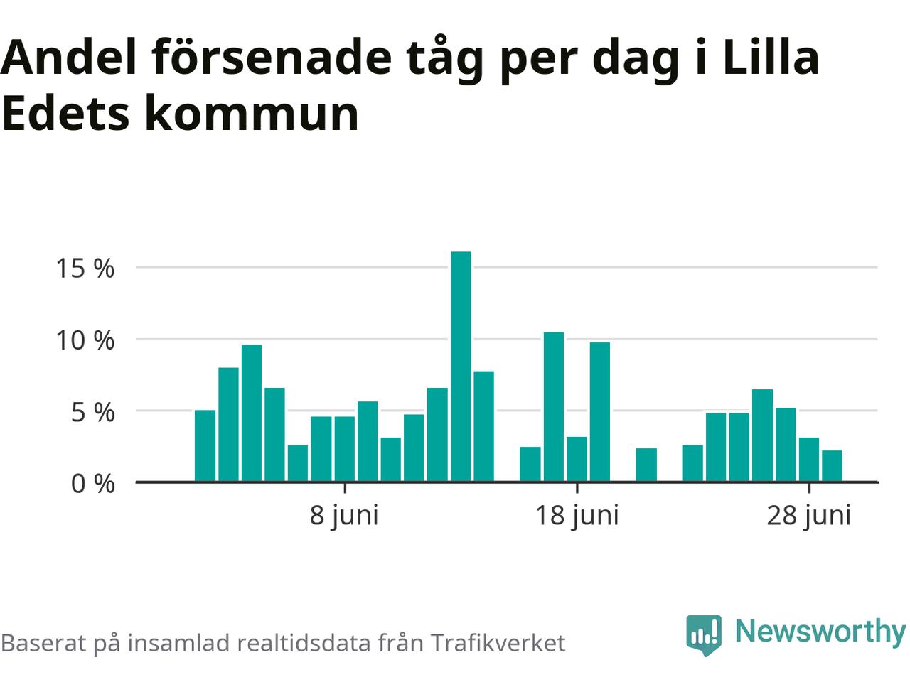 Den svenska tågtrafiken har dragits med historiskt dålig punktlig under första halvan av 2024. Juni månad har dock sett något bättre ut än maj. Newsworthy har samlat in tågens ankomsttider under juni, för att se hur stor andel av tågen till Lilla Edets kommun som var i tid under den senaste månaden.