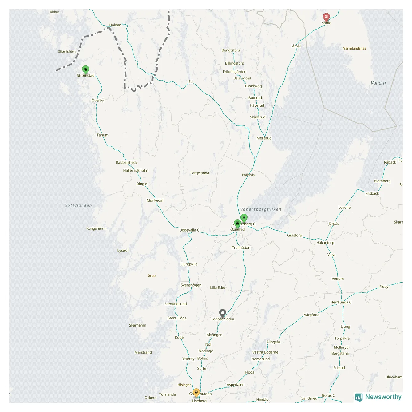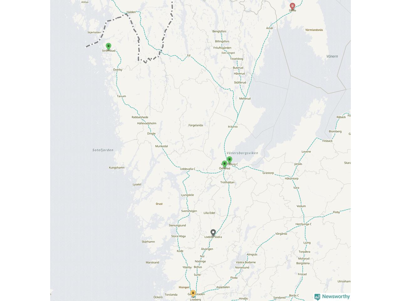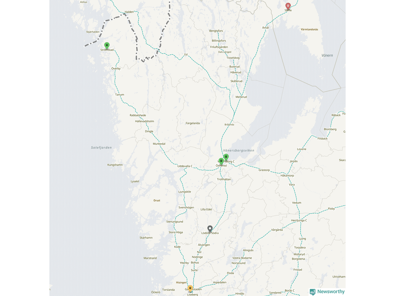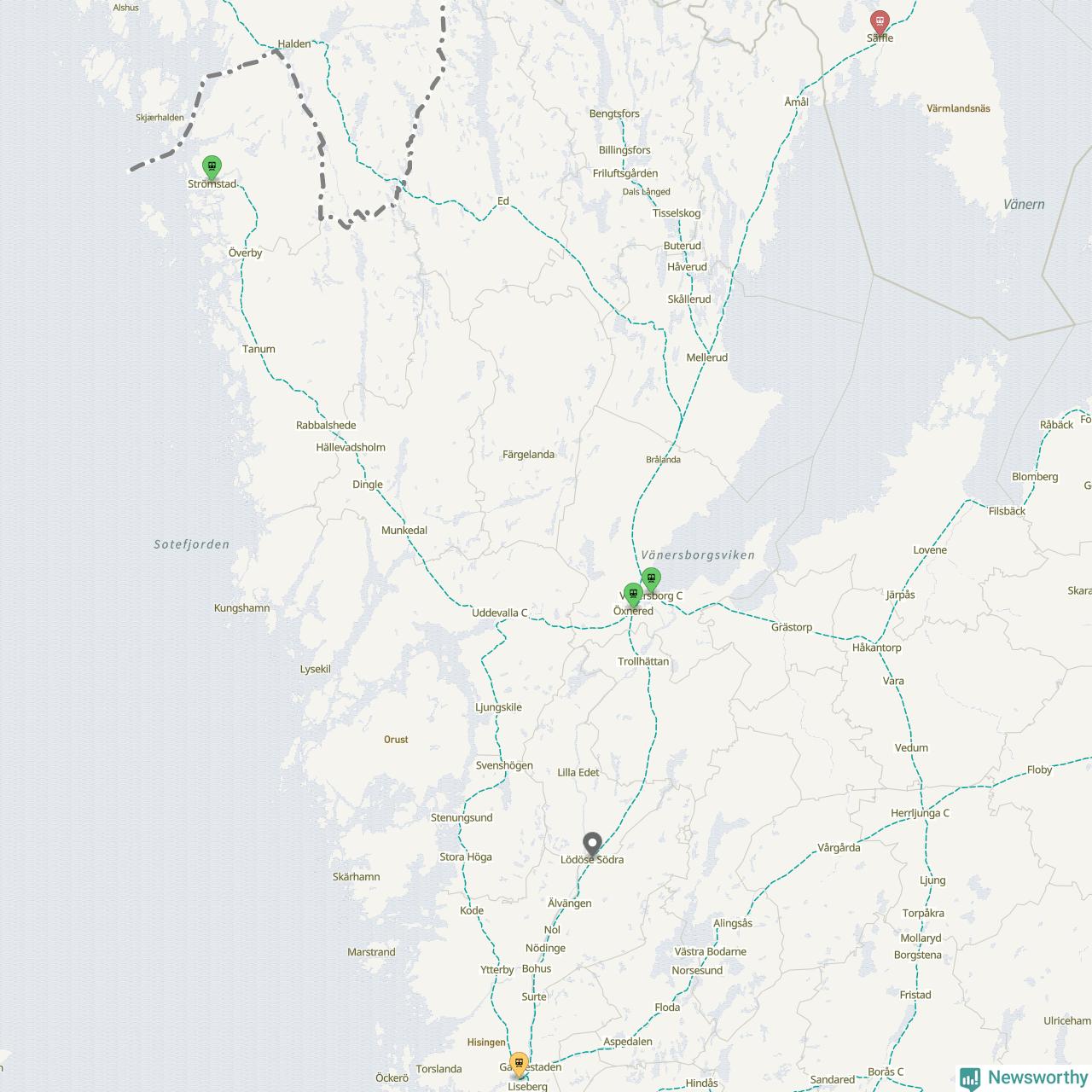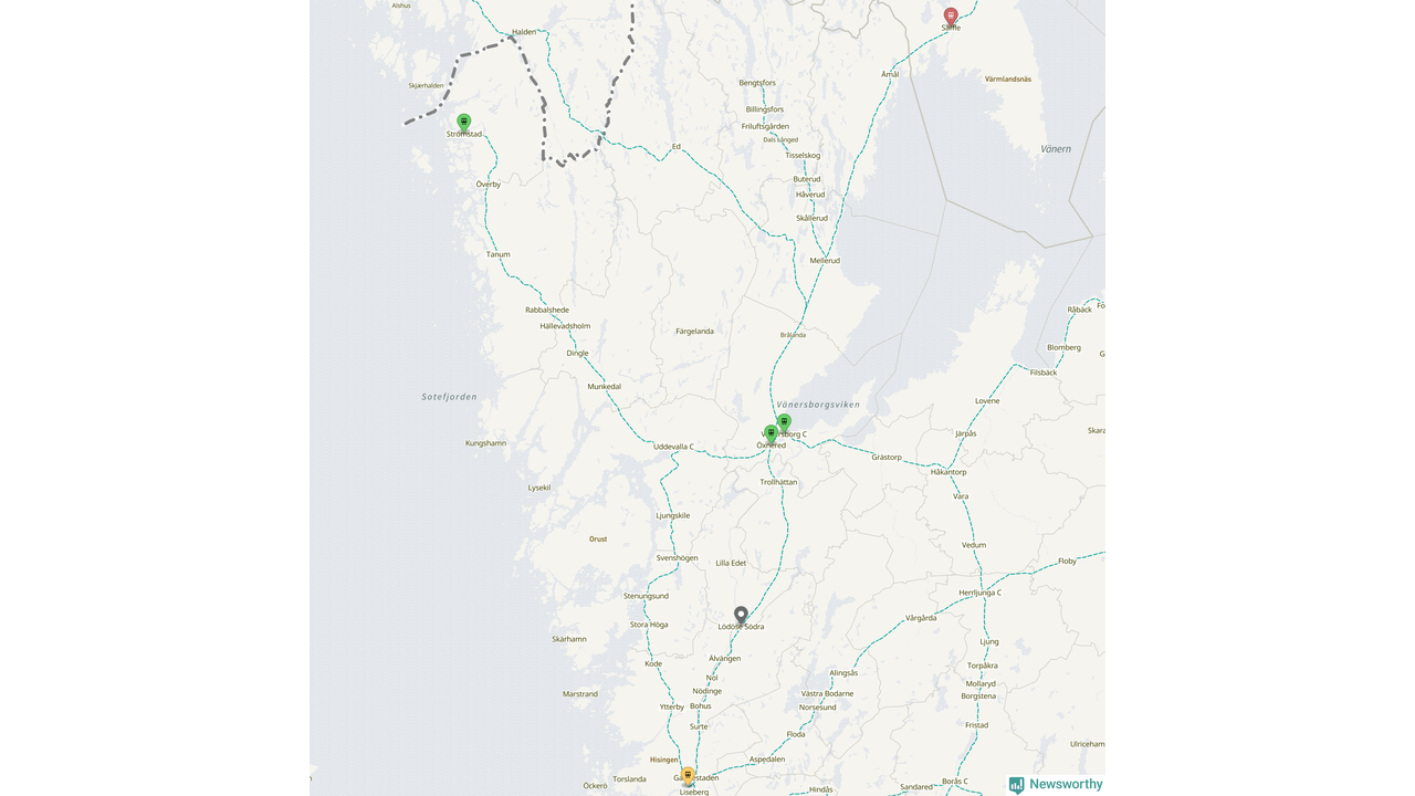 Kartdata från Mapbox, Newsworthy, OpenStreetMap och Trafikverket. Uppgifter om sträckor med passagerartrafik från jarnvag.net.