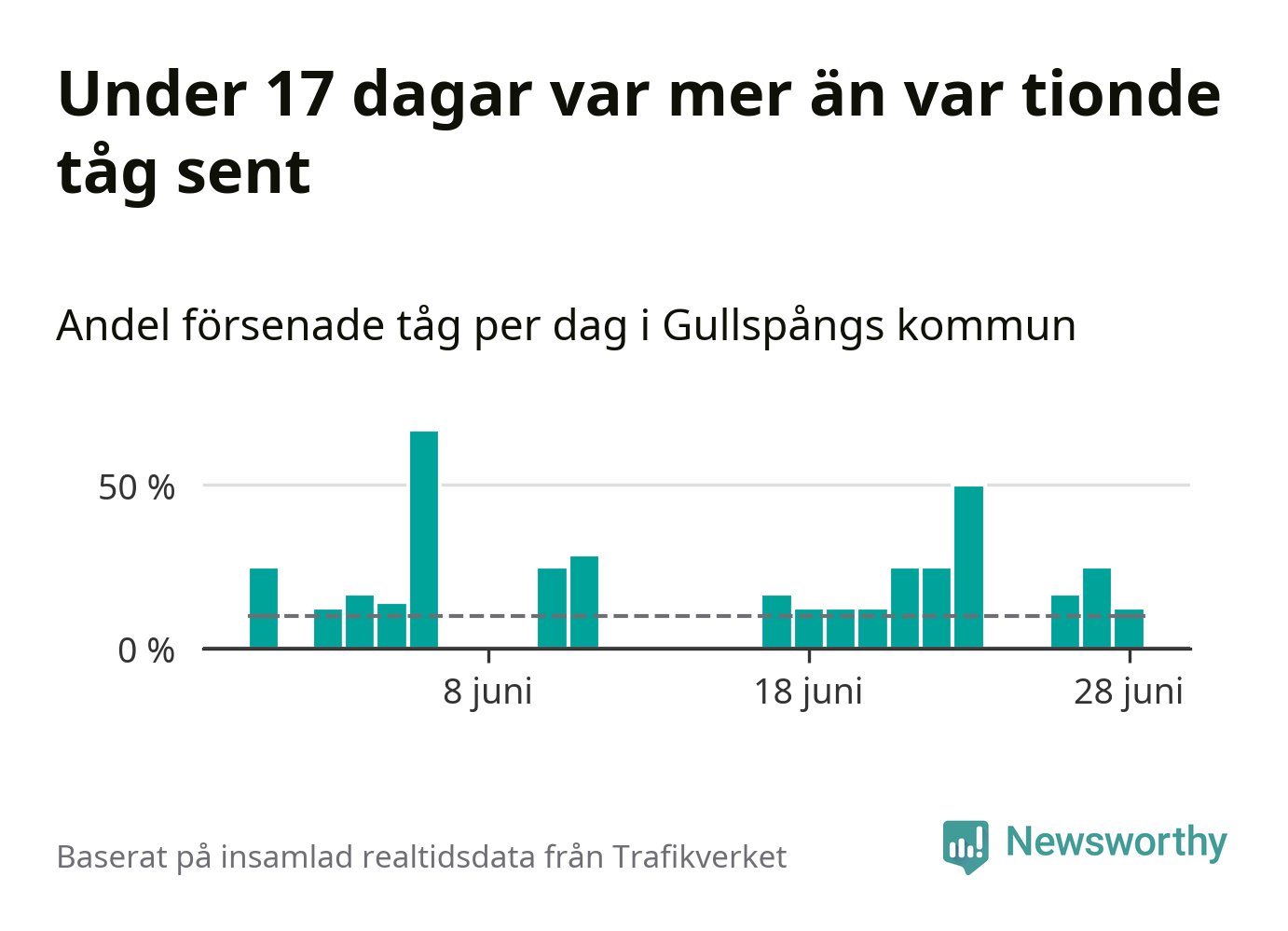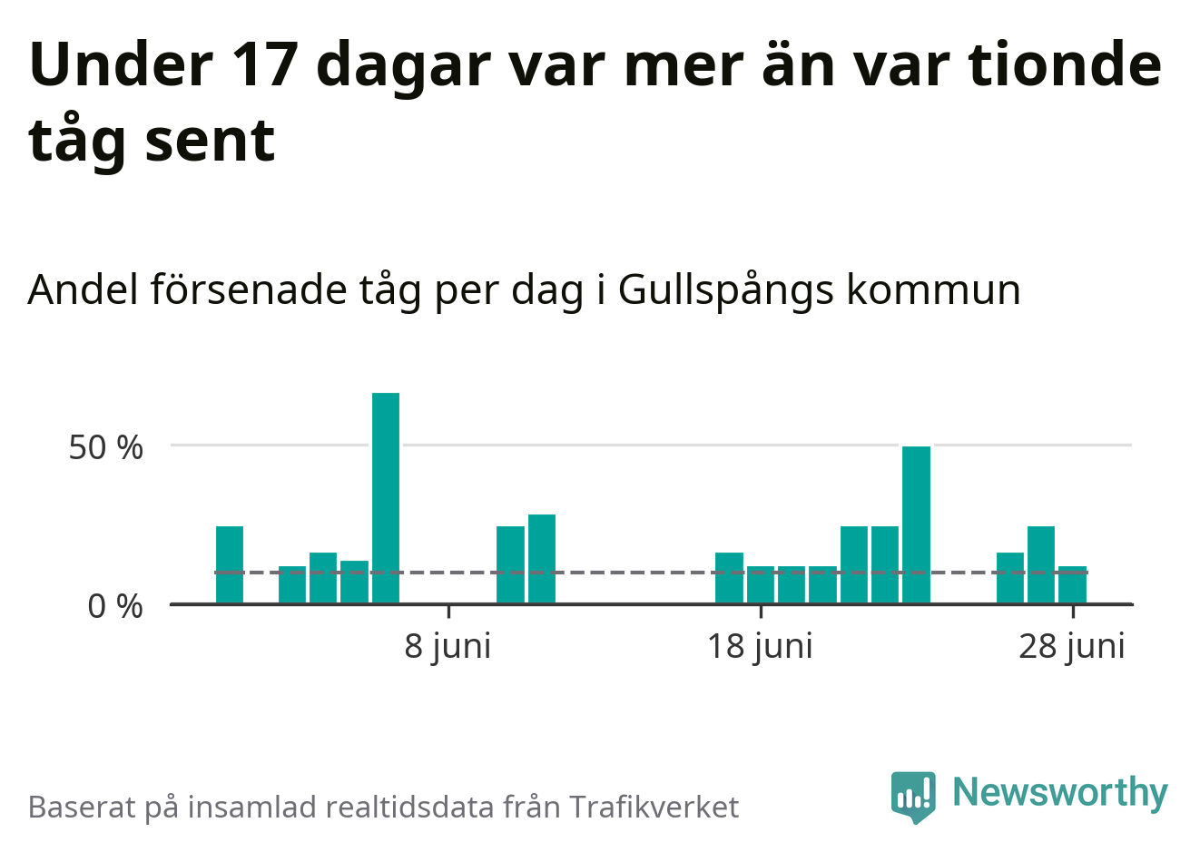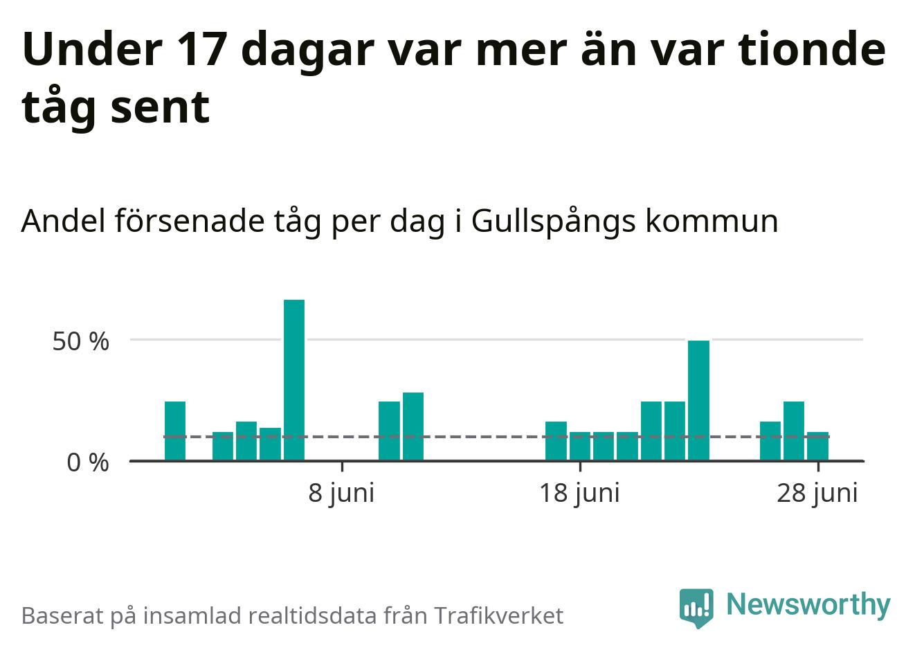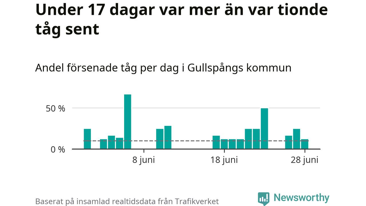 Under 17 av 30 dagar i juni var mer än var tionde tåg i Gullspångs kommun försenat. Det visar Newsworthys sammanställning av alla tågförseningar förra månaden.