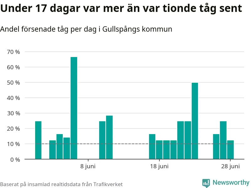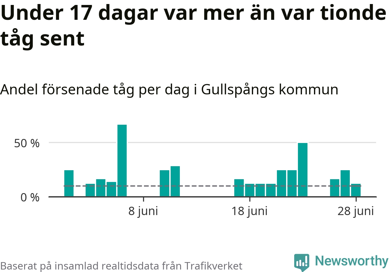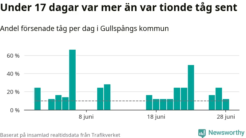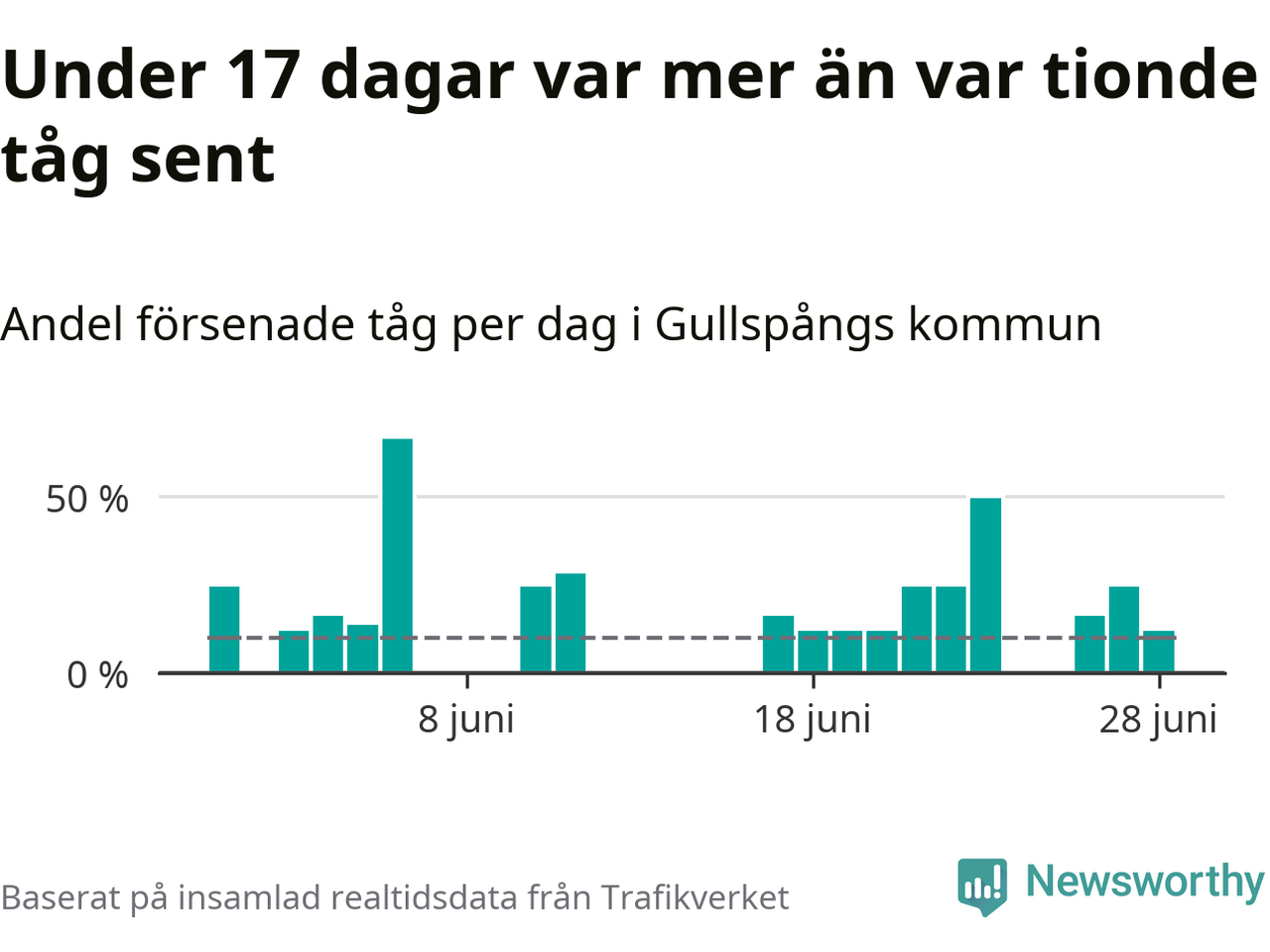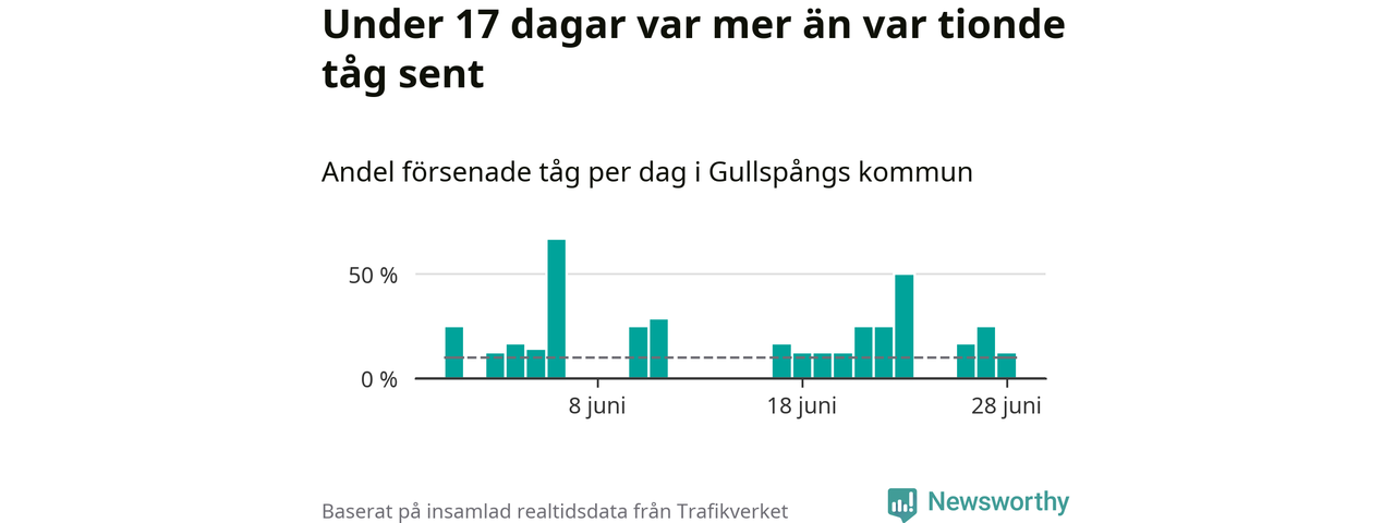 Under 17 av 30 dagar i juni var mer än var tionde tåg i Gullspångs kommun försenat. Det visar Newsworthys sammanställning av alla tågförseningar förra månaden.