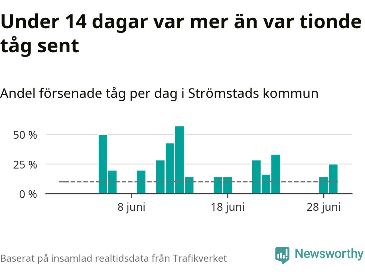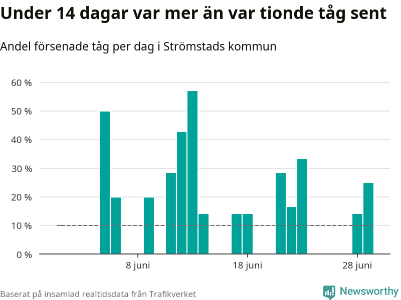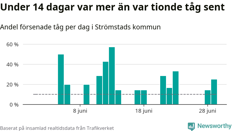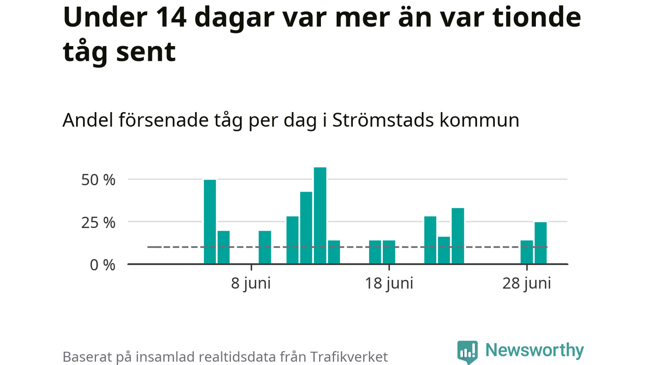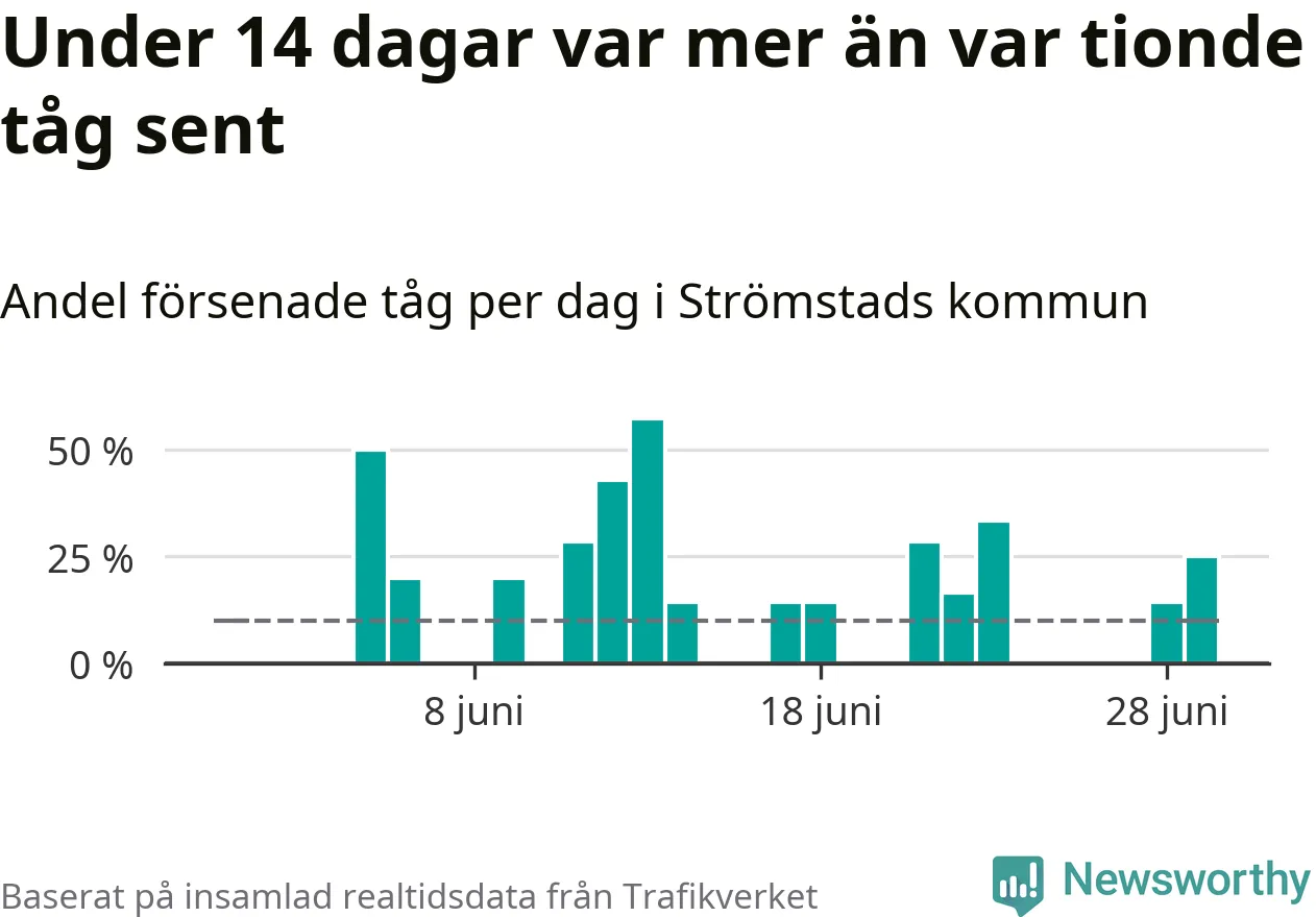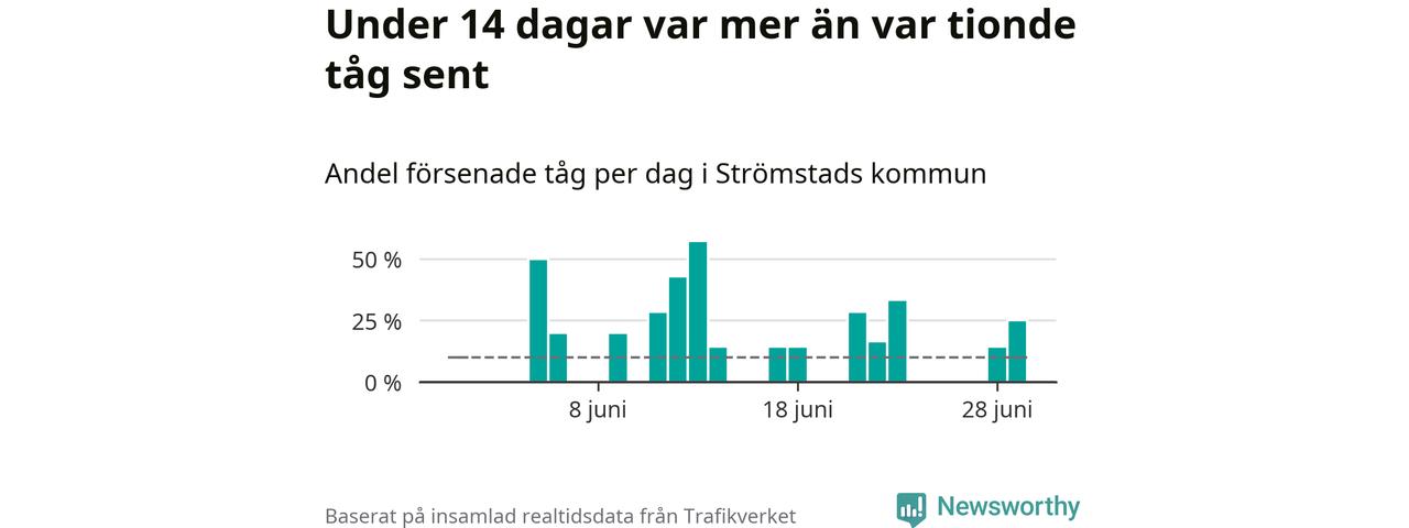 Så många som 13 procent av tågen i Strömstads kommun var mer än fem minuter försenade under juni. Det visar Newsworthys sammanställning av alla tågförseningar förra månaden.