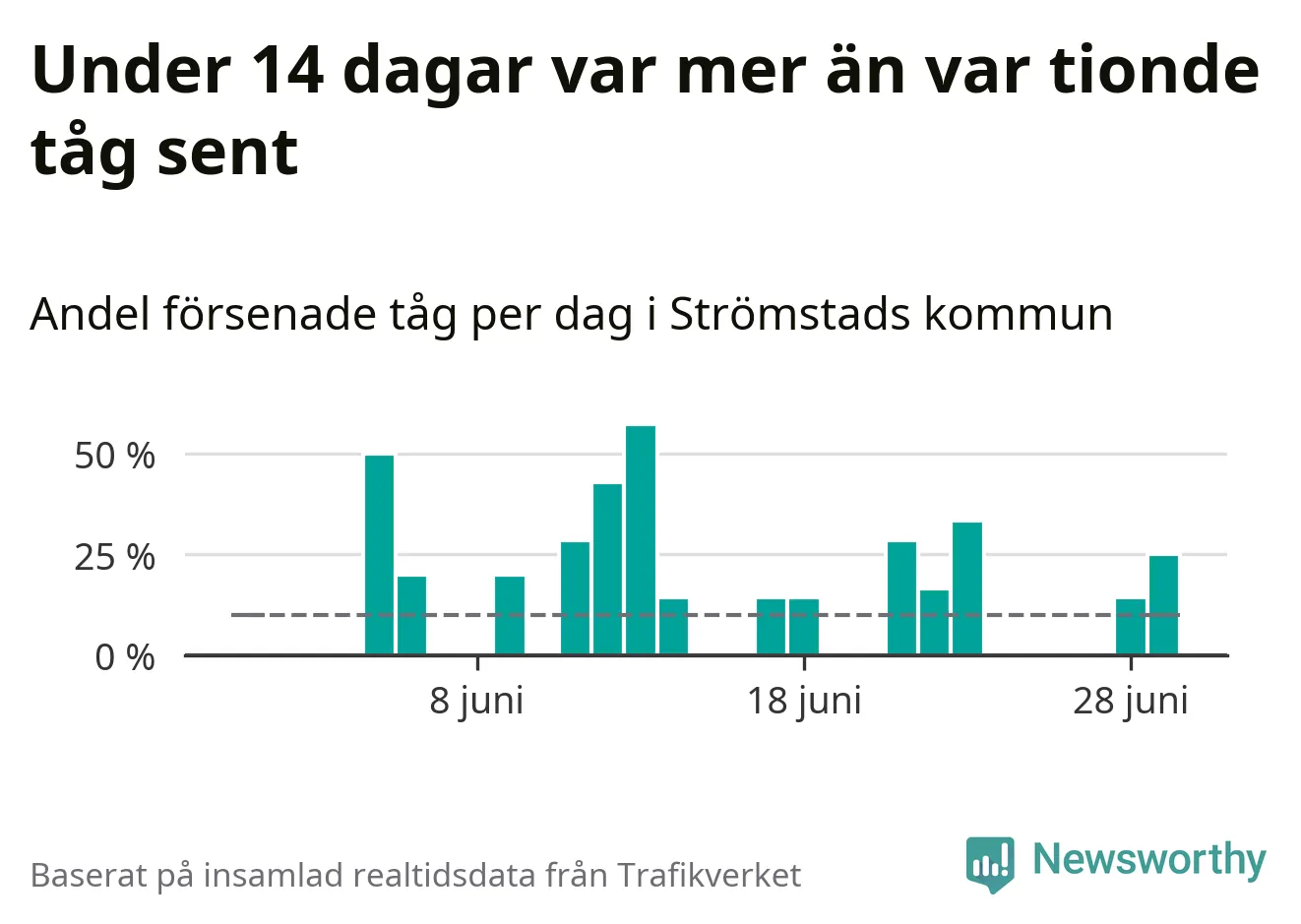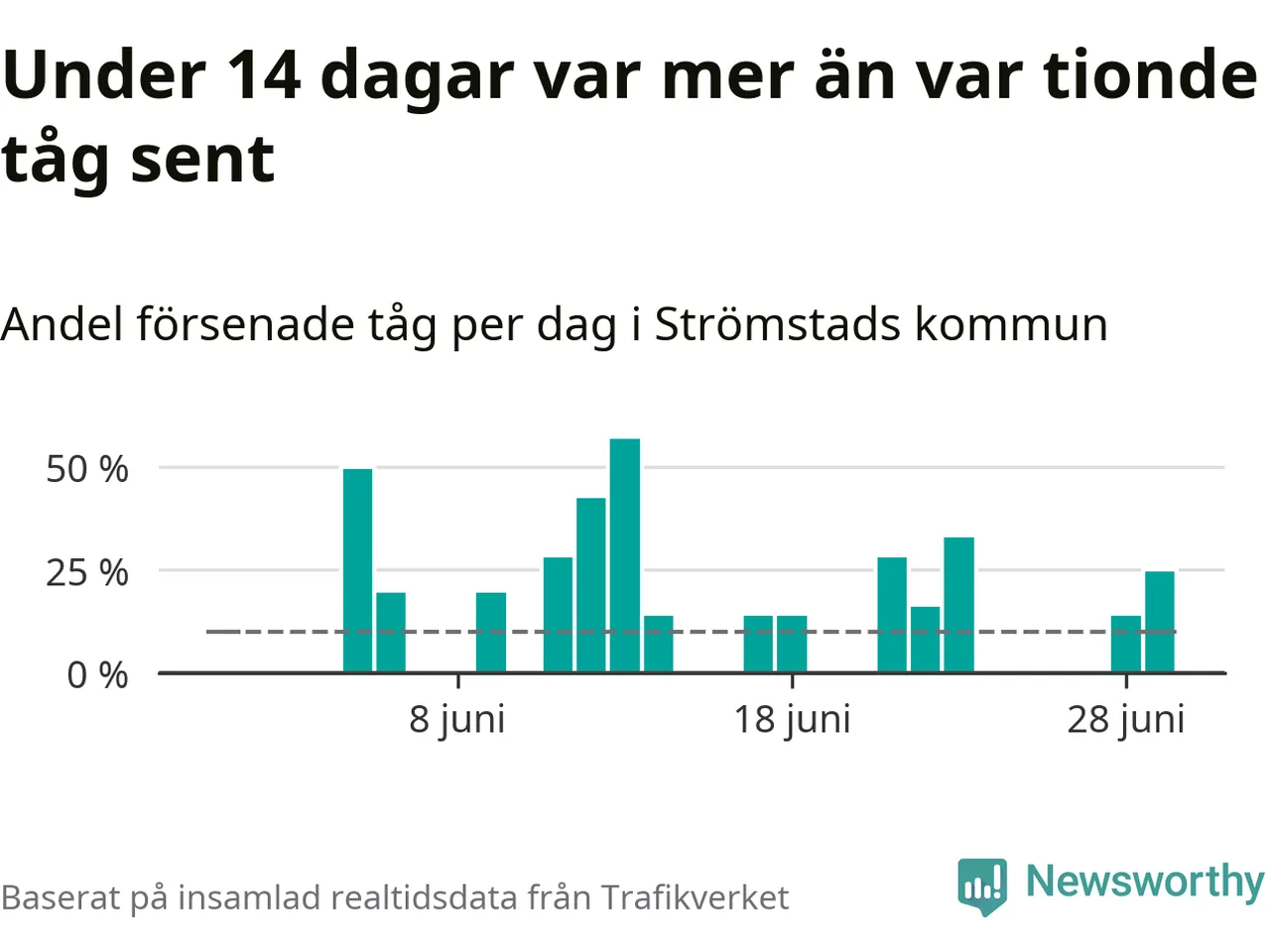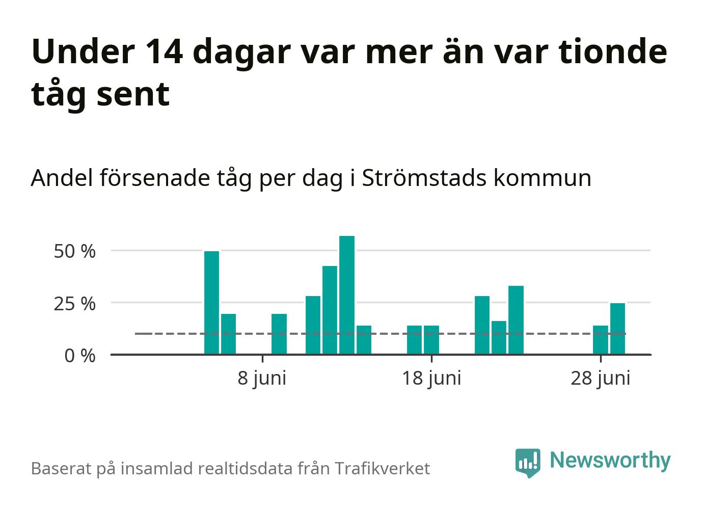 Så många som 13 procent av tågen i Strömstads kommun var mer än fem minuter försenade under juni. Det visar Newsworthys sammanställning av alla tågförseningar förra månaden.