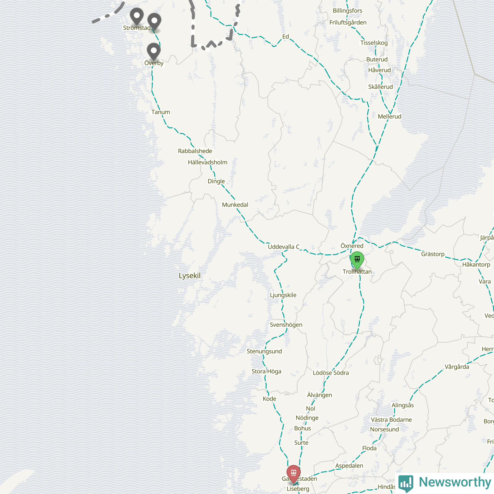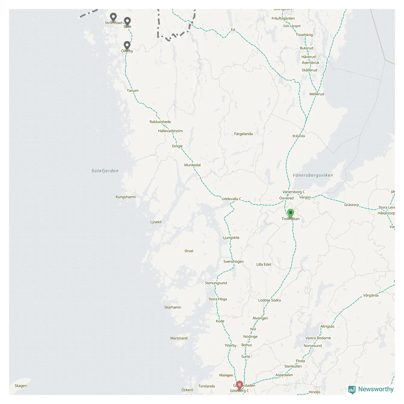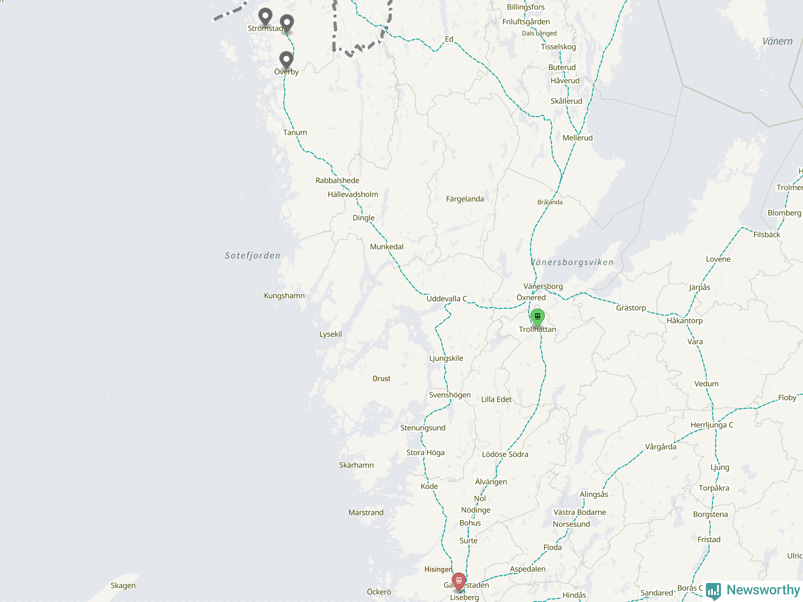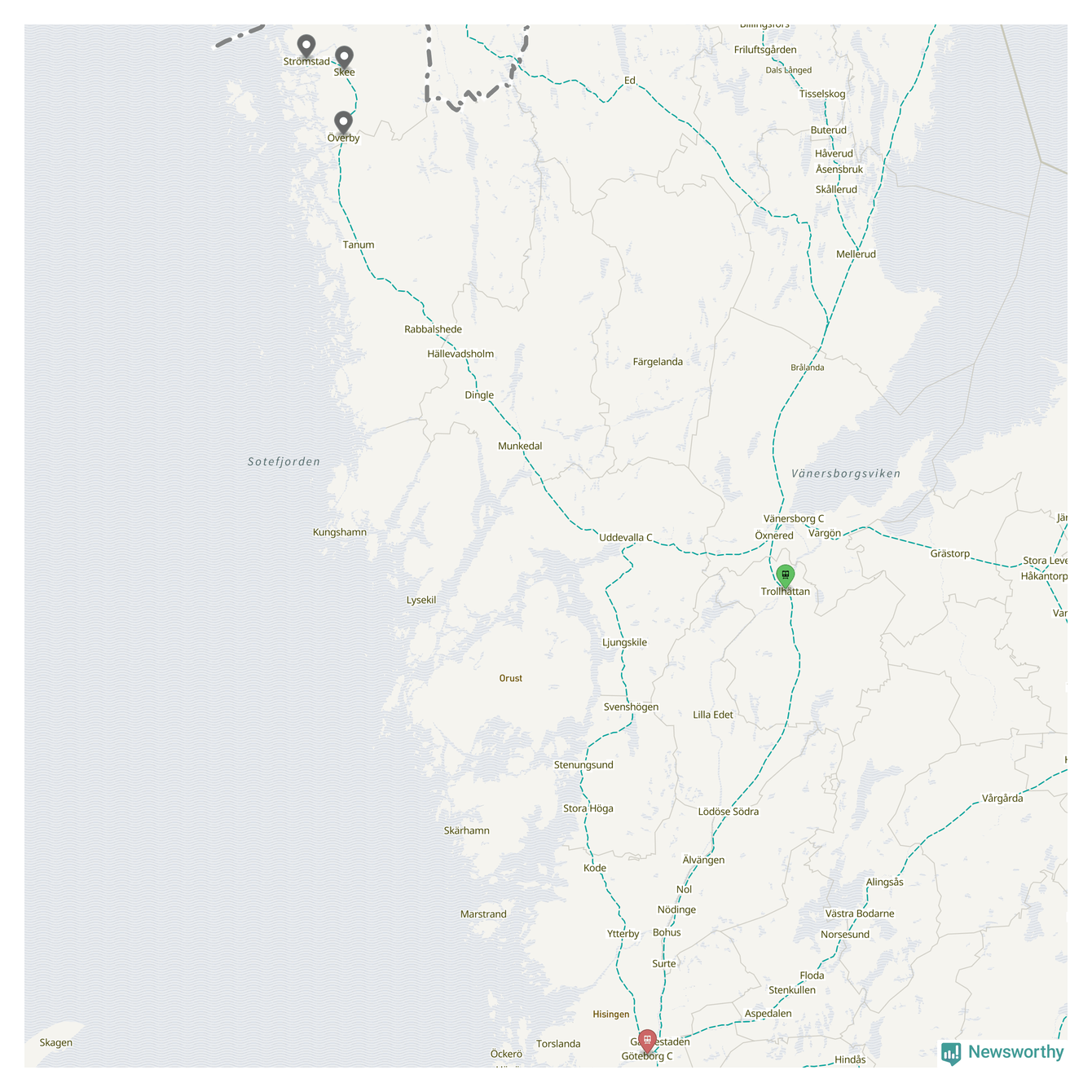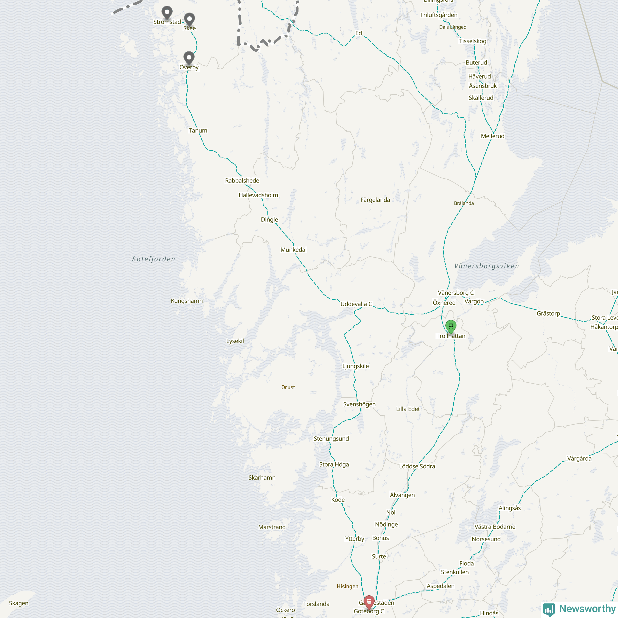 Kartdata från Mapbox, Newsworthy, OpenStreetMap och Trafikverket. Uppgifter om sträckor med passagerartrafik från jarnvag.net.