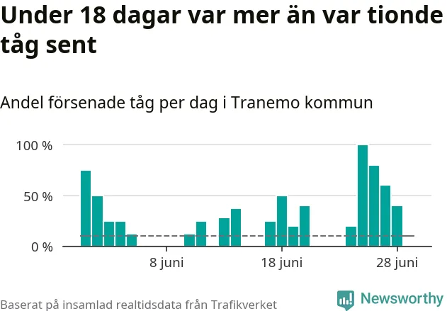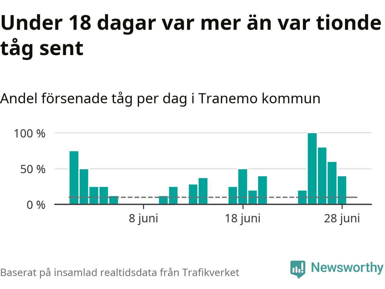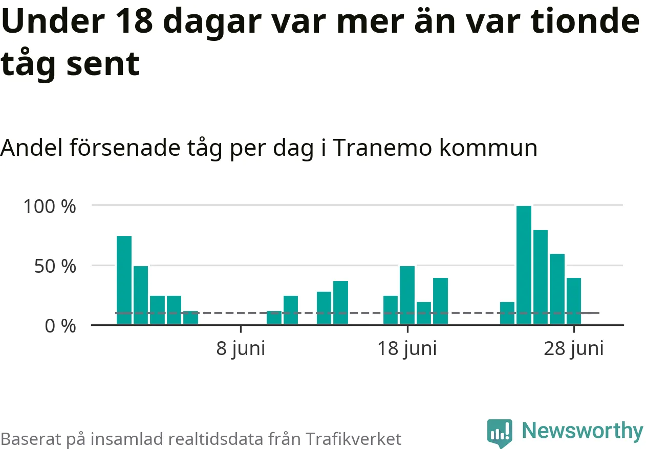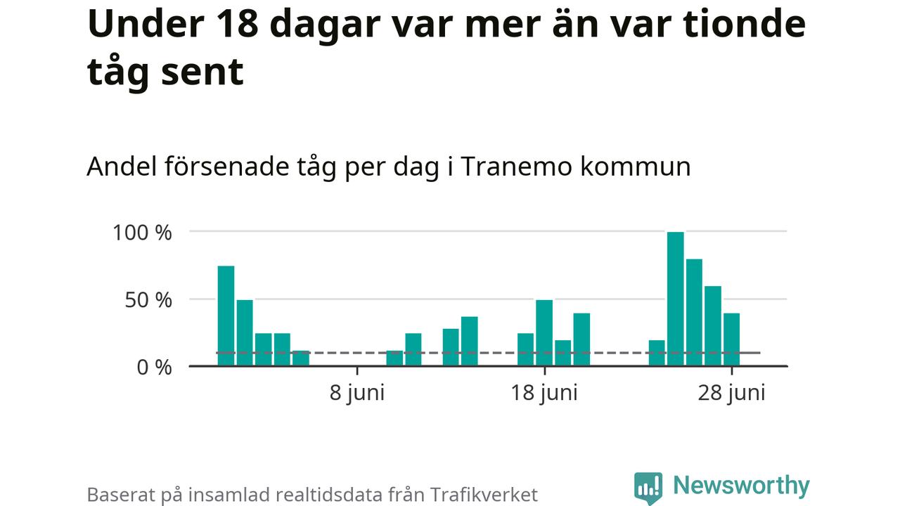 Så många som 23 procent av Göteborgs–Kalmar-tågen var mer än fem minuter försenade under juni. Det visar Newsworthys sammanställning av alla tågförseningar förra månaden.