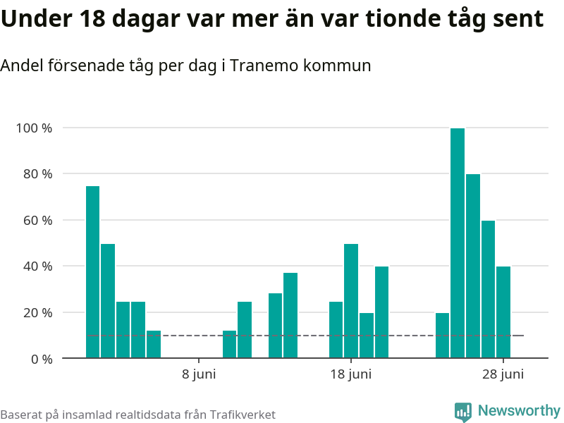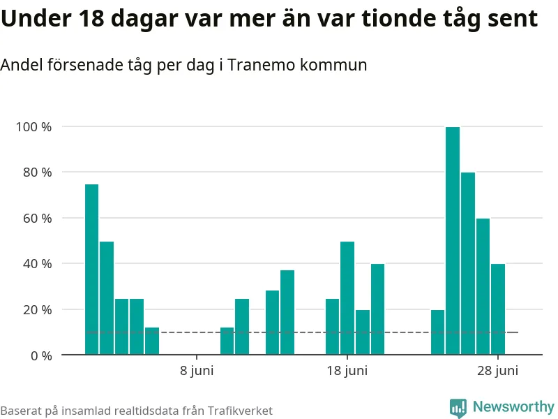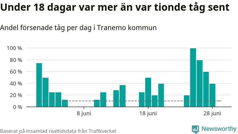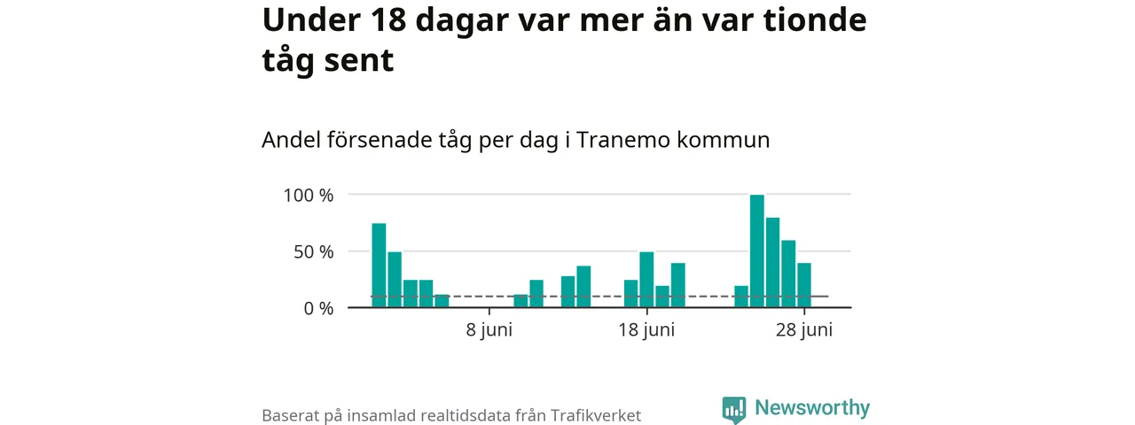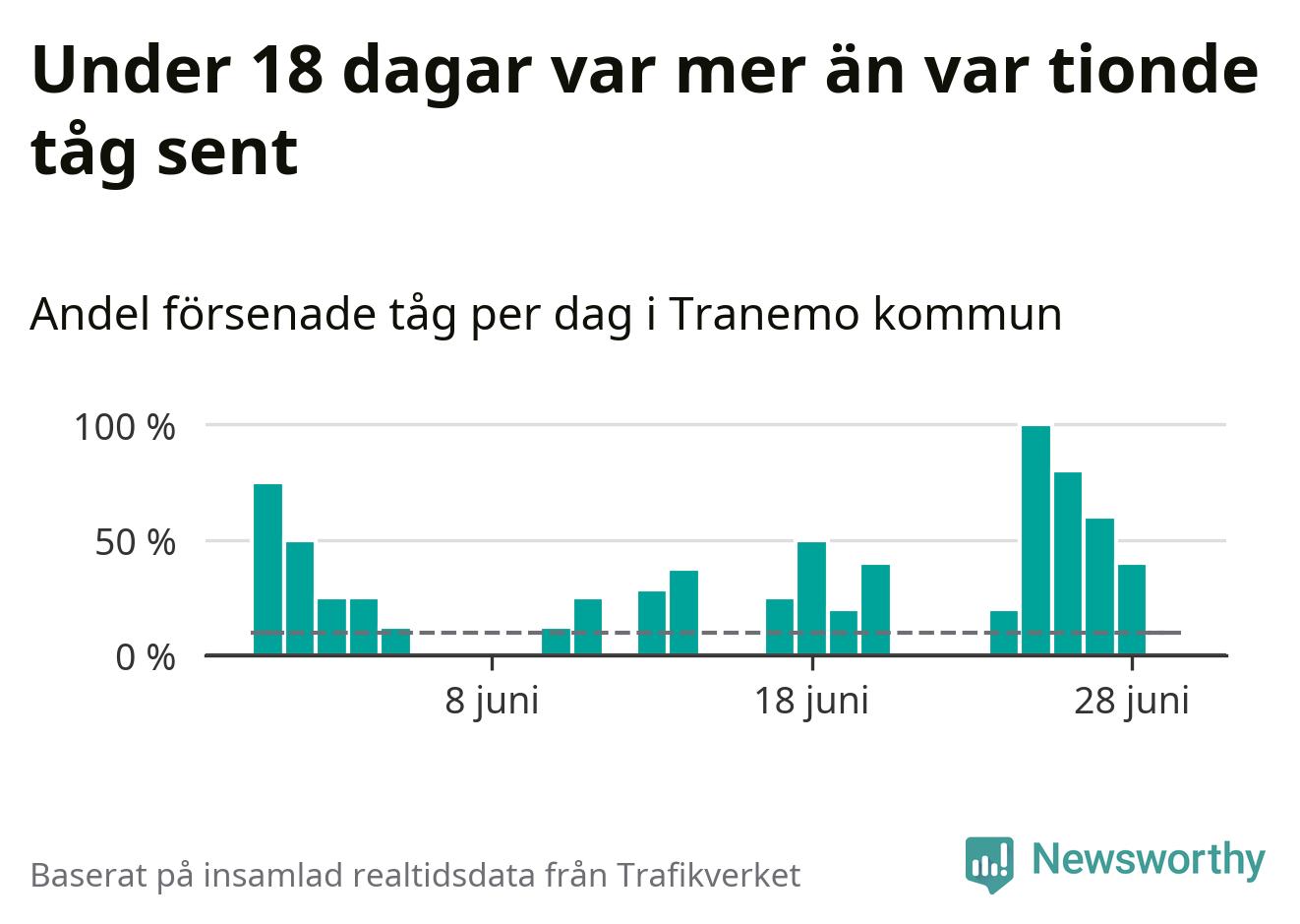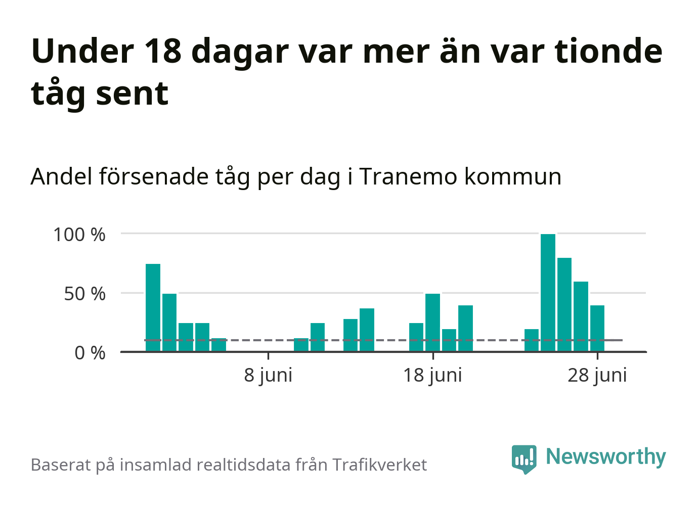 Så många som 23 procent av Göteborgs–Kalmar-tågen var mer än fem minuter försenade under juni. Det visar Newsworthys sammanställning av alla tågförseningar förra månaden.