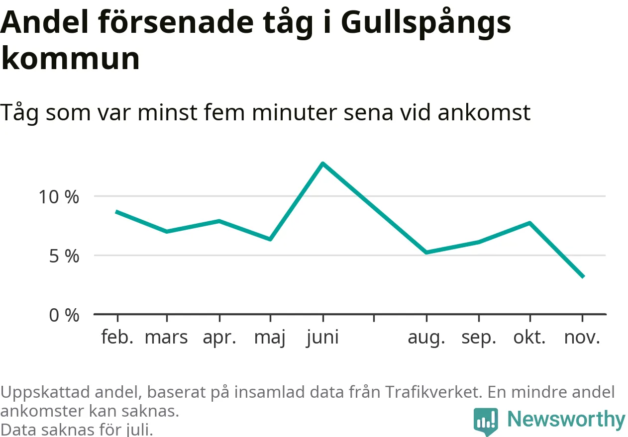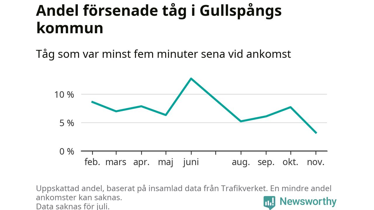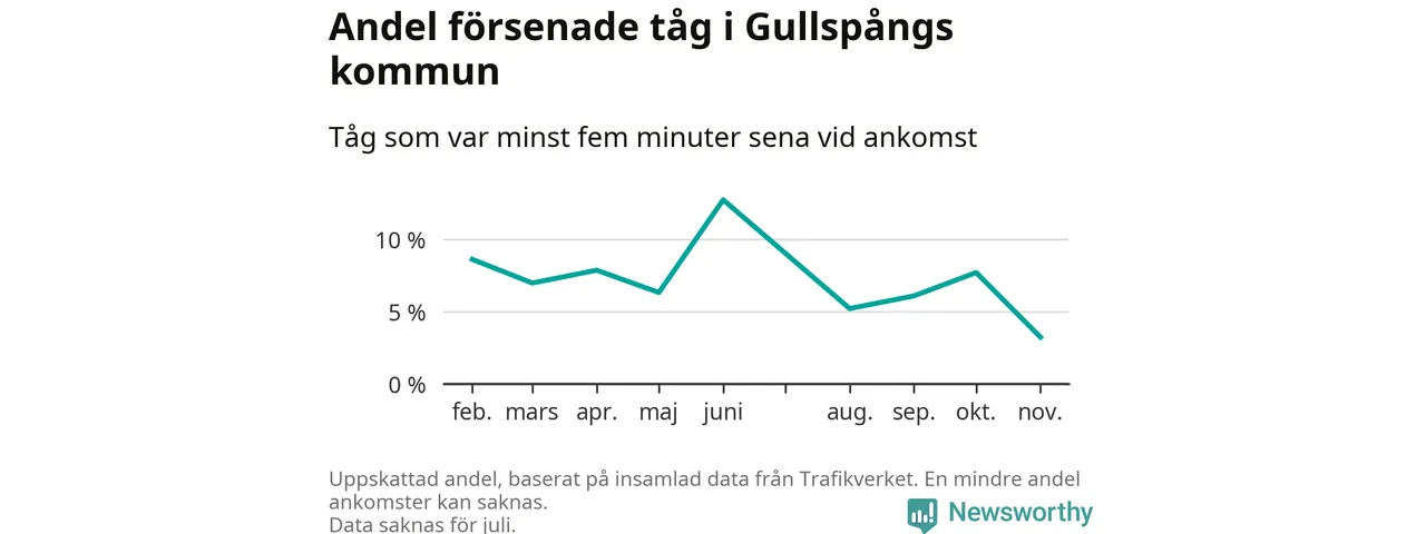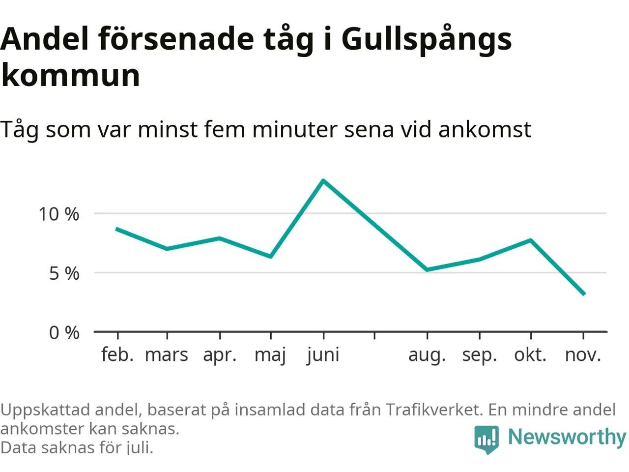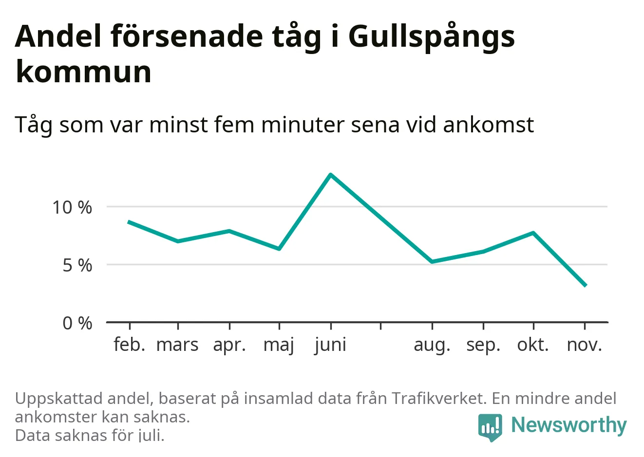 Den svenska tågtrafiken har dragits med historiskt dålig punktlig under första halvan av 2024. Juni månad har dock sett något bättre ut än maj. Newsworthy har samlat in tågens ankomsttider under november, för att se hur stor andel av tågen till Gullspångs kommun som var i tid under den senaste månaden.