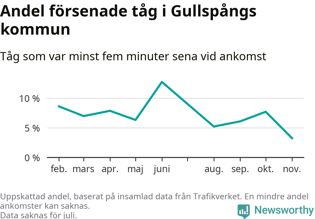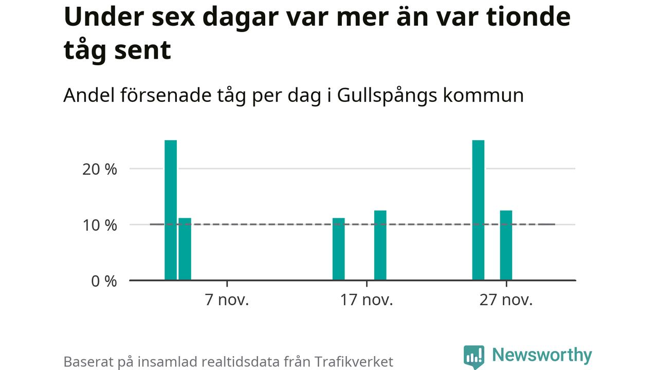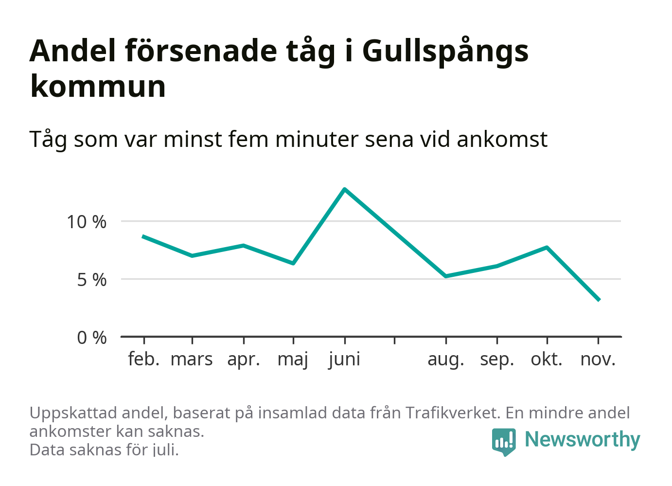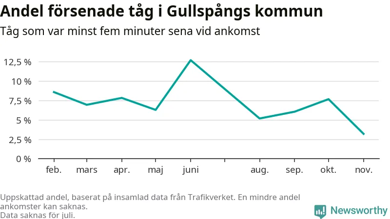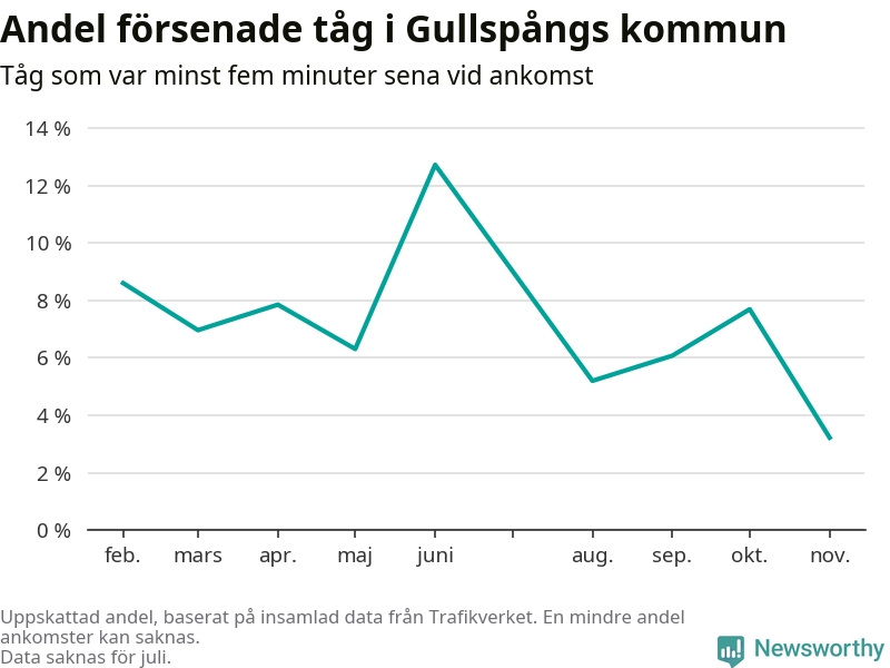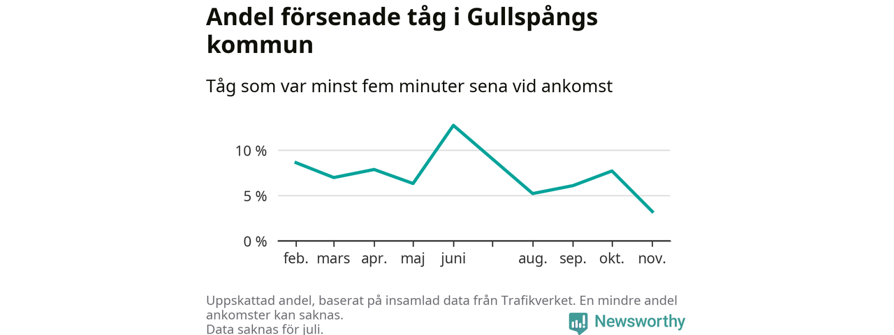 Den svenska tågtrafiken har dragits med historiskt dålig punktlig under första halvan av 2024. Juni månad har dock sett något bättre ut än maj. Newsworthy har samlat in tågens ankomsttider under november, för att se hur stor andel av tågen till Gullspångs kommun som var i tid under den senaste månaden.