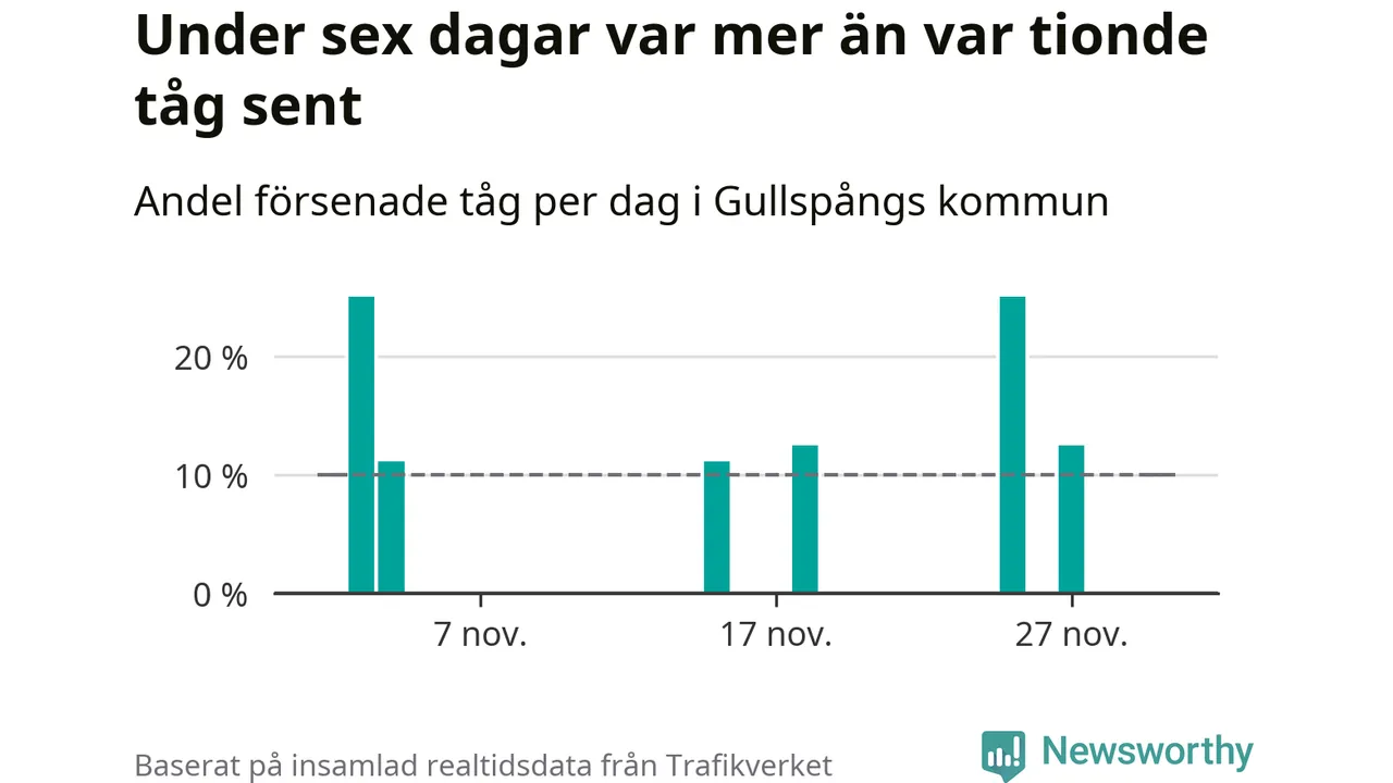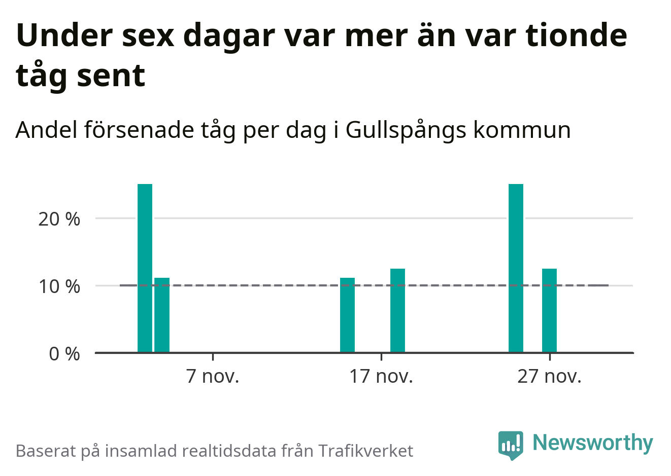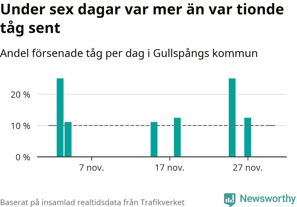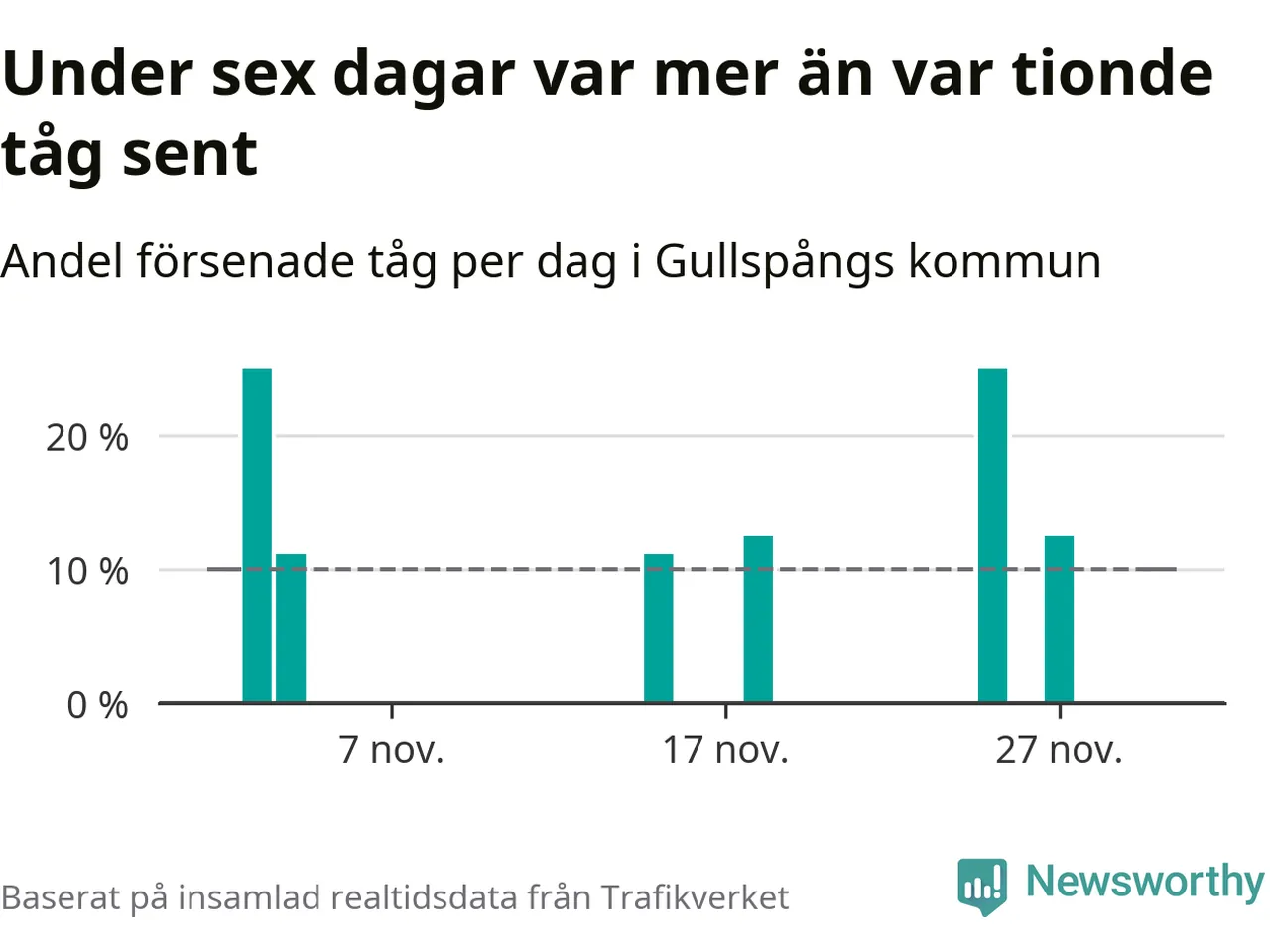 Den svenska tågtrafiken har dragits med historiskt dålig punktlig under första halvan av 2024. Juni månad har dock sett något bättre ut än maj. Newsworthy har samlat in tågens ankomsttider under november, för att se hur stor andel av tågen till Gullspångs kommun som var i tid under den senaste månaden.