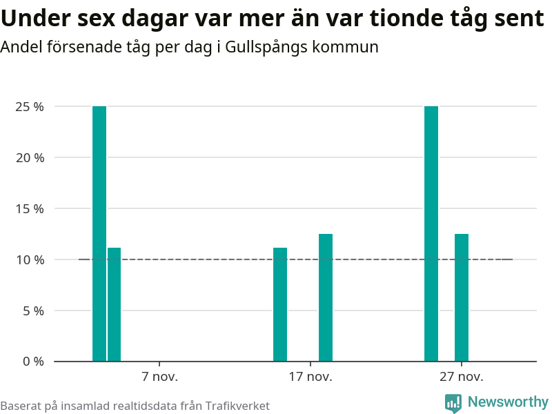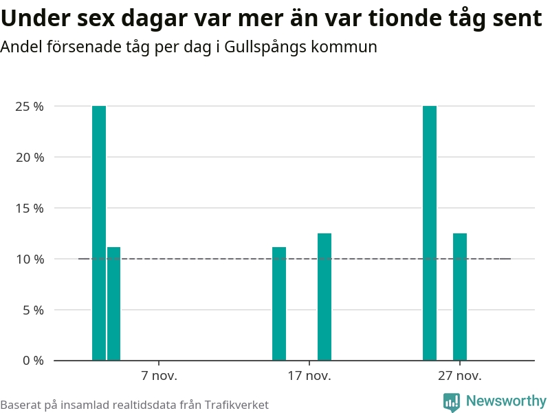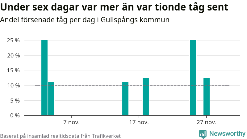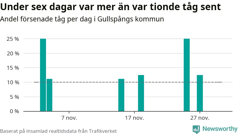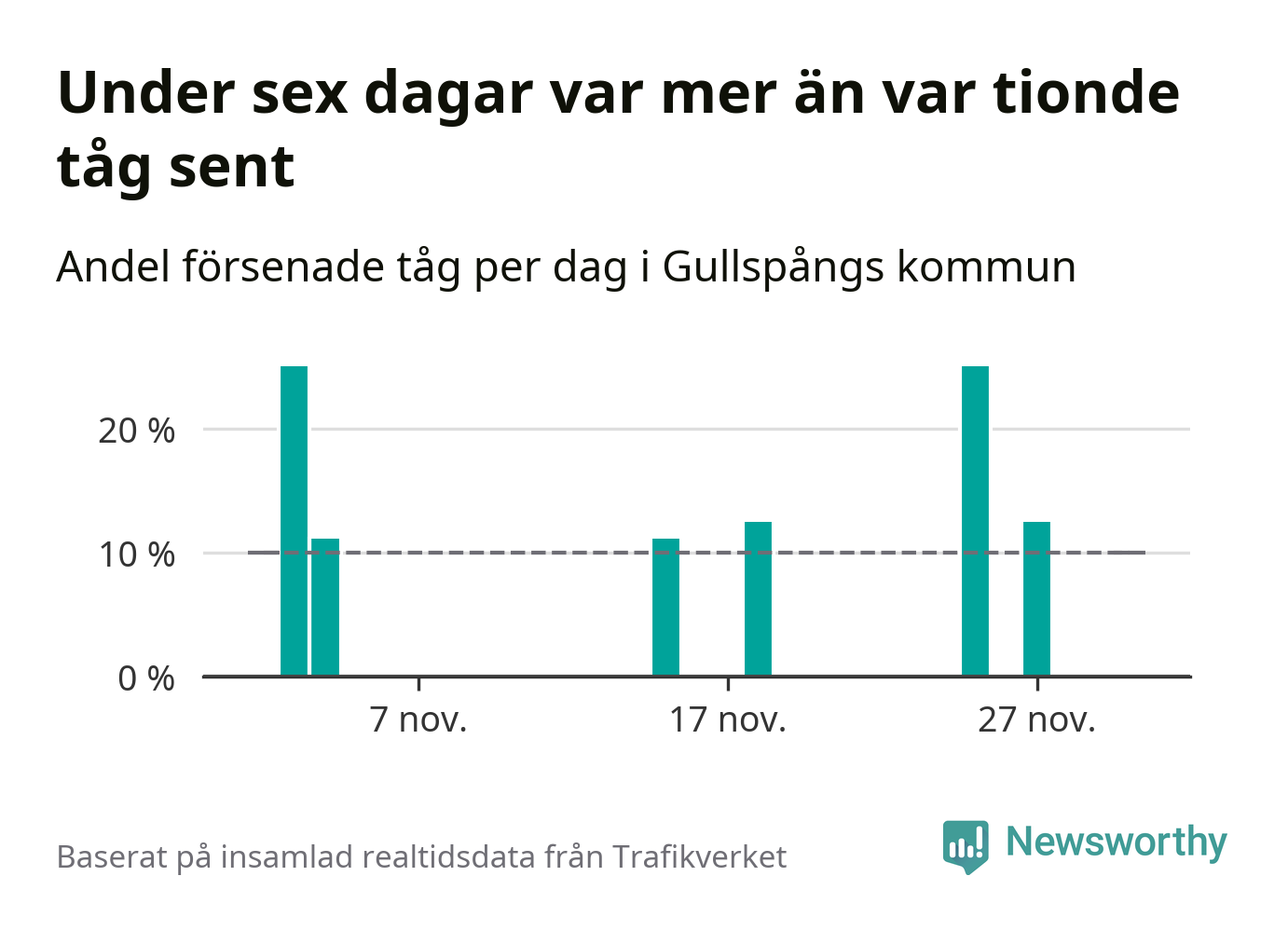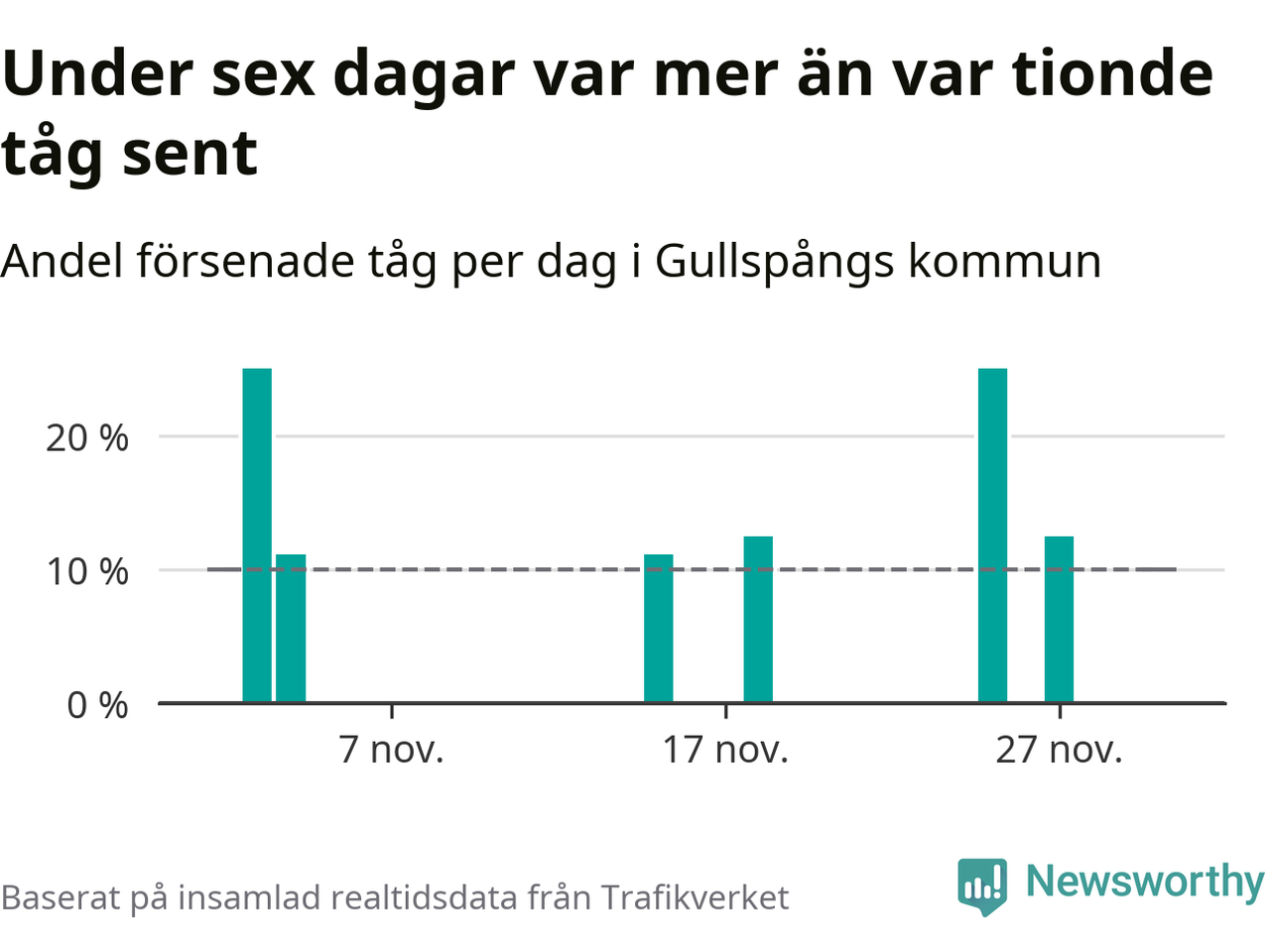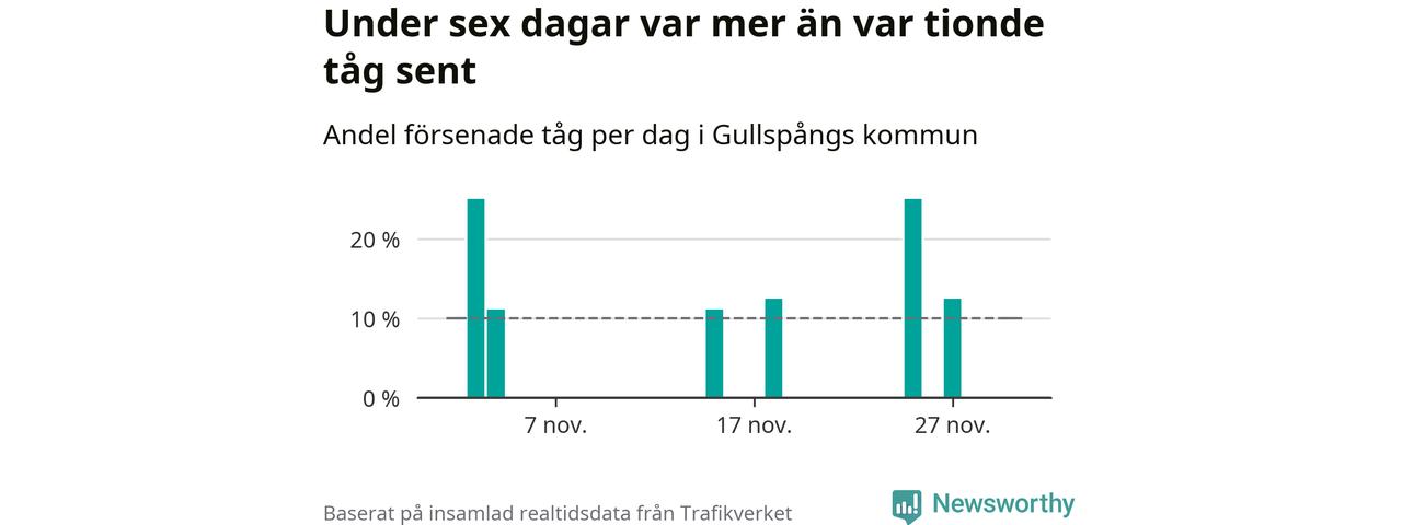 Den svenska tågtrafiken har dragits med historiskt dålig punktlig under första halvan av 2024. Juni månad har dock sett något bättre ut än maj. Newsworthy har samlat in tågens ankomsttider under november, för att se hur stor andel av tågen till Gullspångs kommun som var i tid under den senaste månaden.
