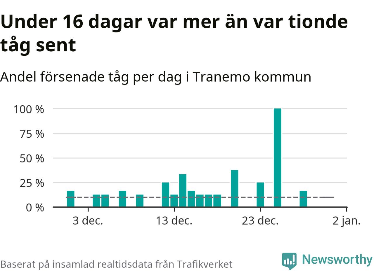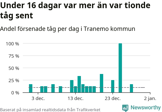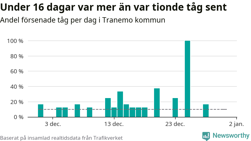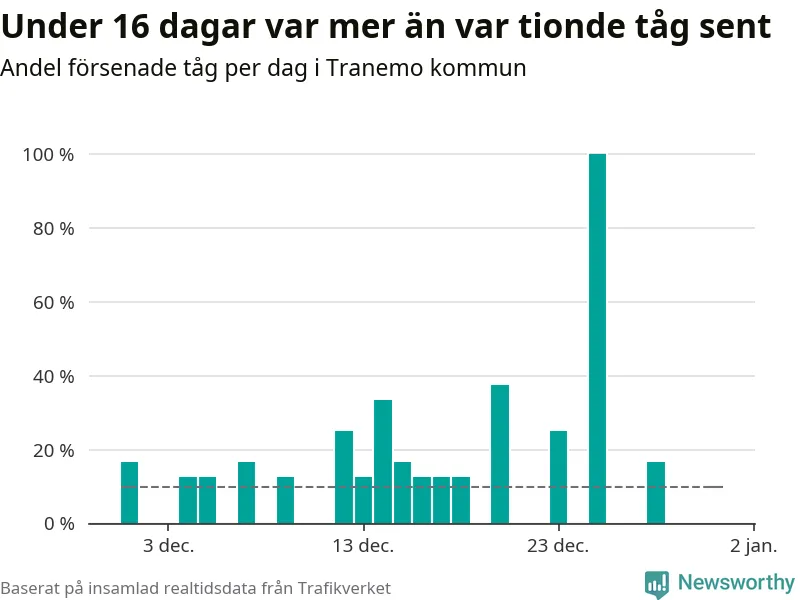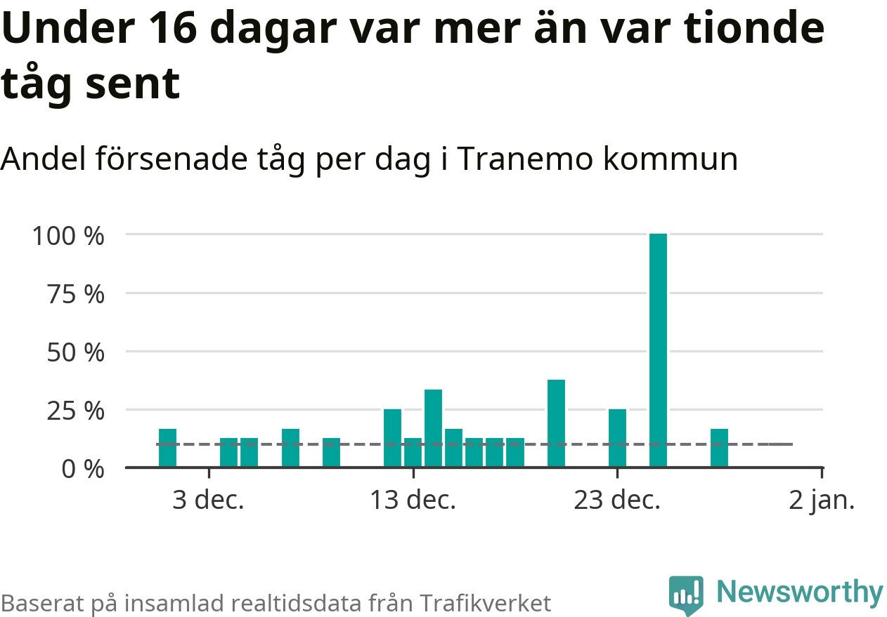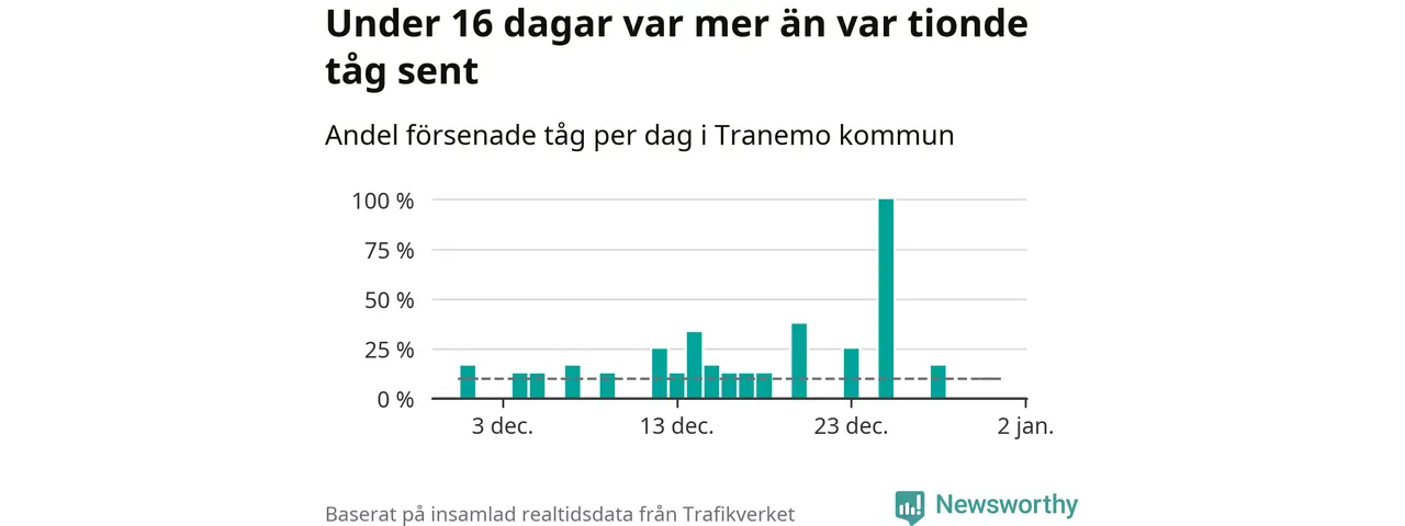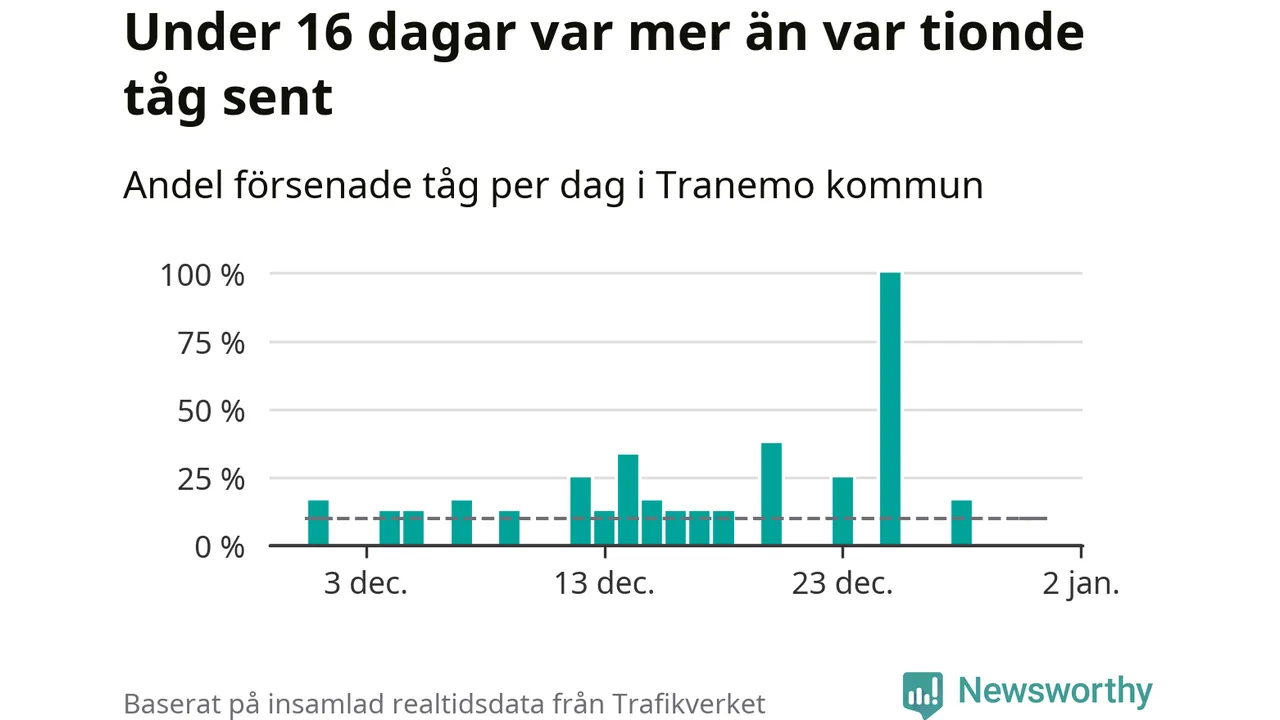 Den svenska tågtrafiken är långt från det branchgemensamma målet att 95 procent av tågen ska komma fram i tid. Newsworthy har samlat in tågens ankomsttider under december, för att se hur stor andel av tågen till Tranemo kommun som var i tid under den senaste månaden.