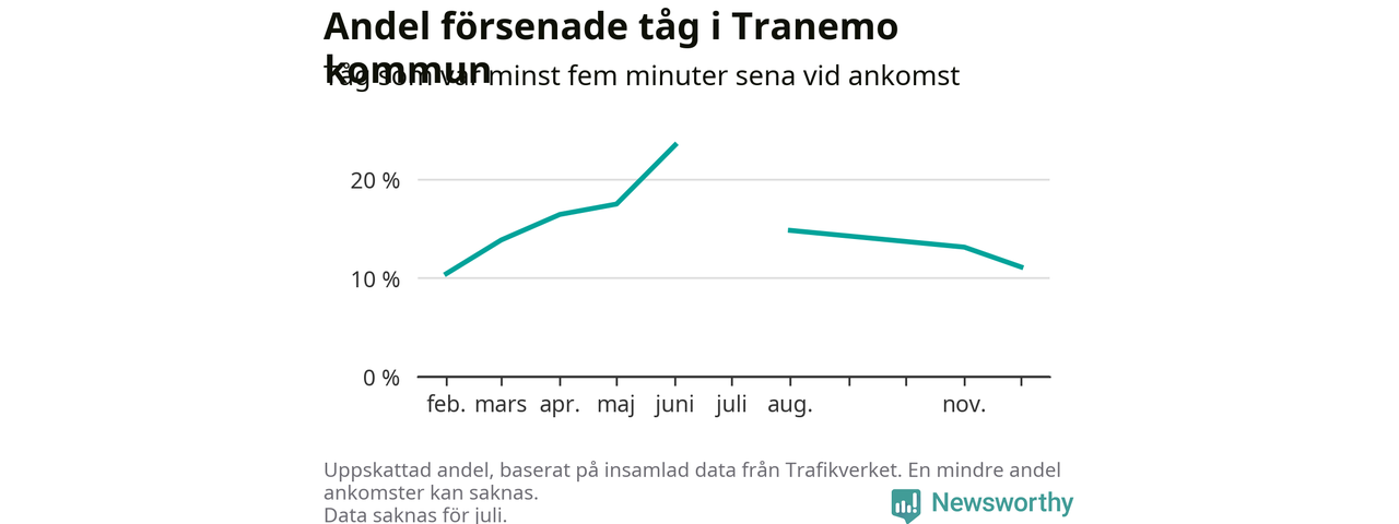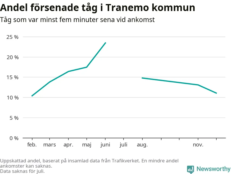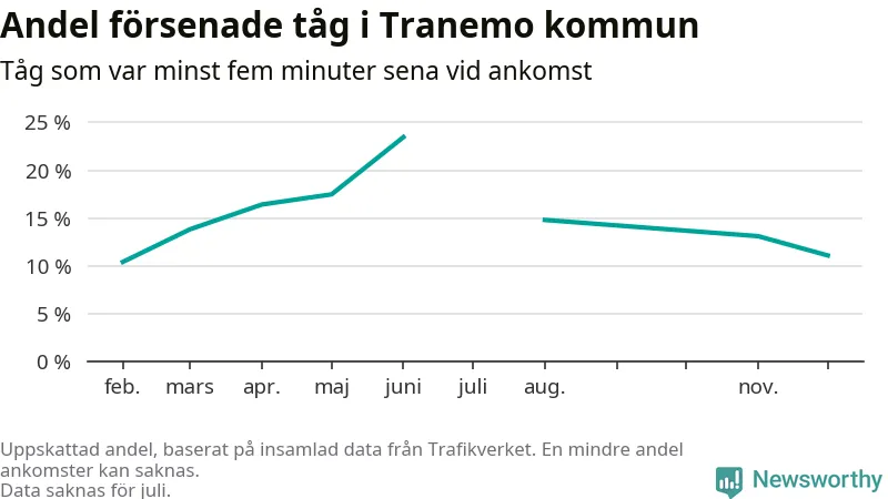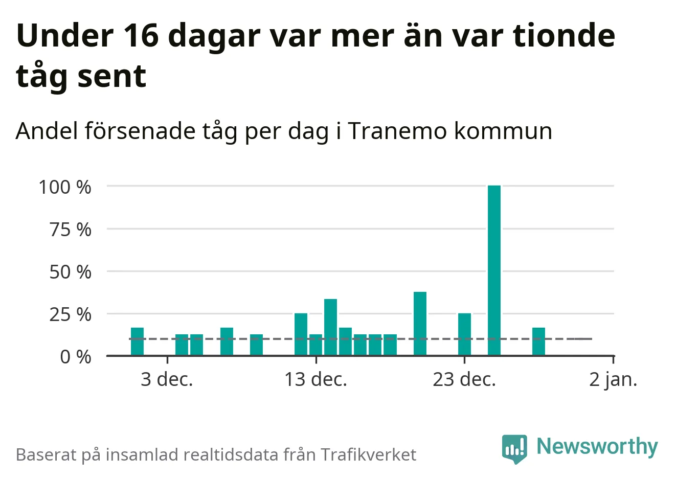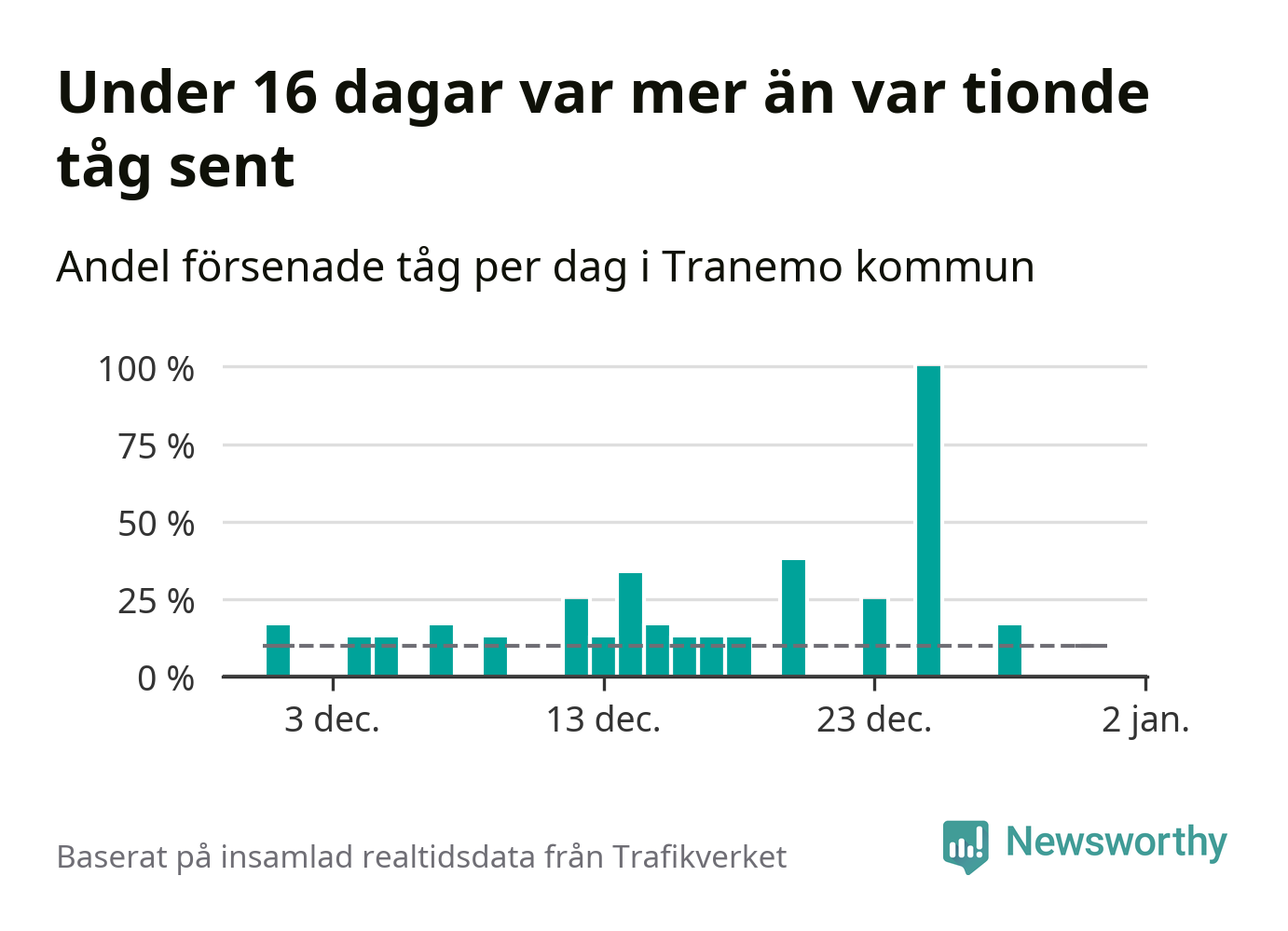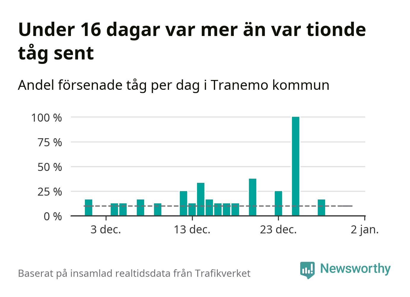 Den svenska tågtrafiken är långt från det branchgemensamma målet att 95 procent av tågen ska komma fram i tid. Newsworthy har samlat in tågens ankomsttider under december, för att se hur stor andel av tågen till Tranemo kommun som var i tid under den senaste månaden.