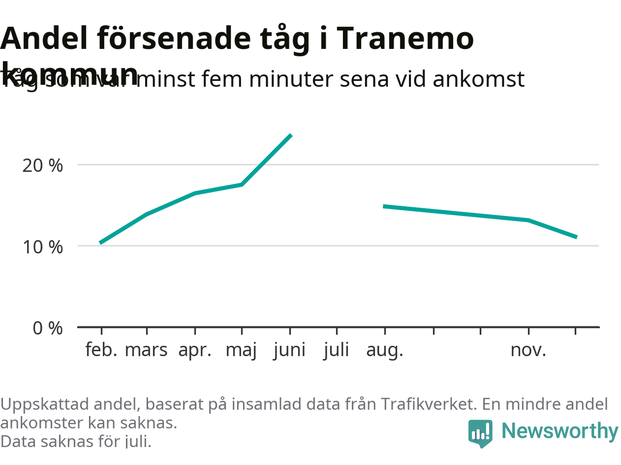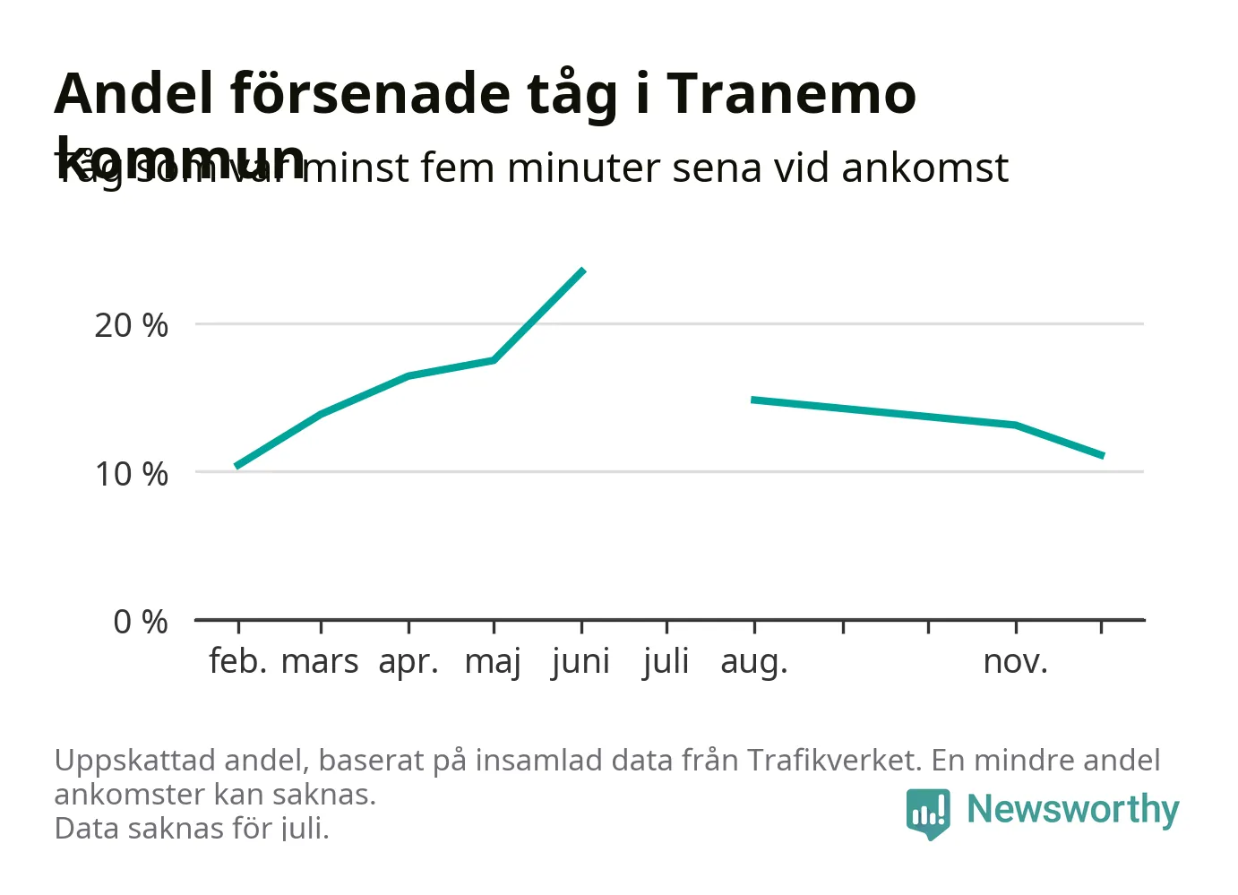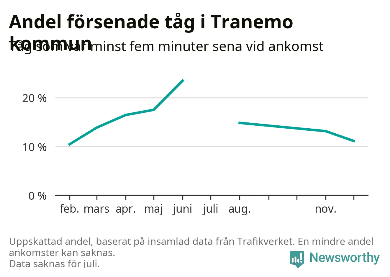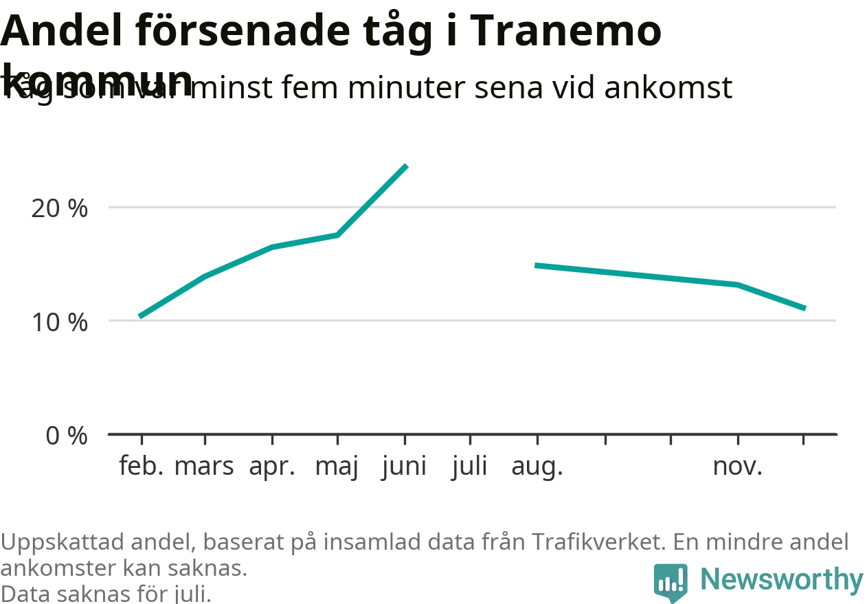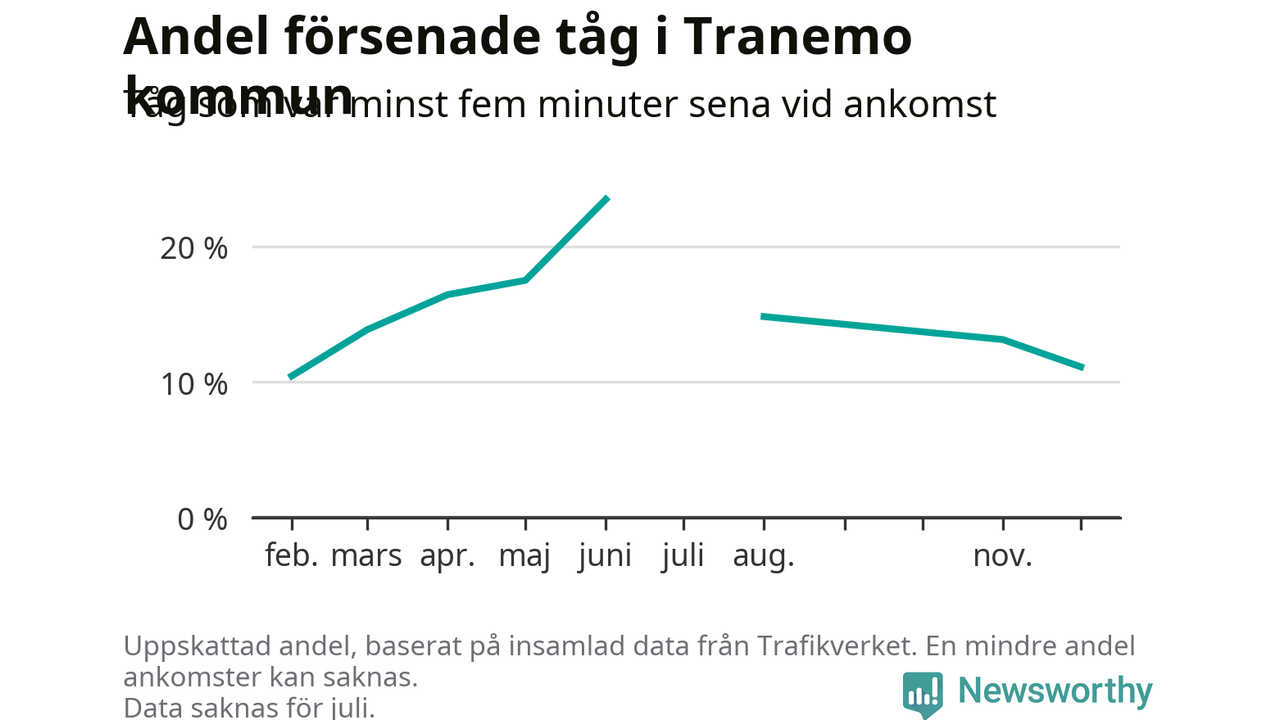 Den svenska tågtrafiken är långt från det branchgemensamma målet att 95 procent av tågen ska komma fram i tid. Newsworthy har samlat in tågens ankomsttider under december, för att se hur stor andel av tågen till Tranemo kommun som var i tid under den senaste månaden.