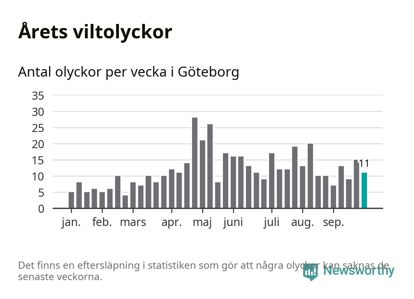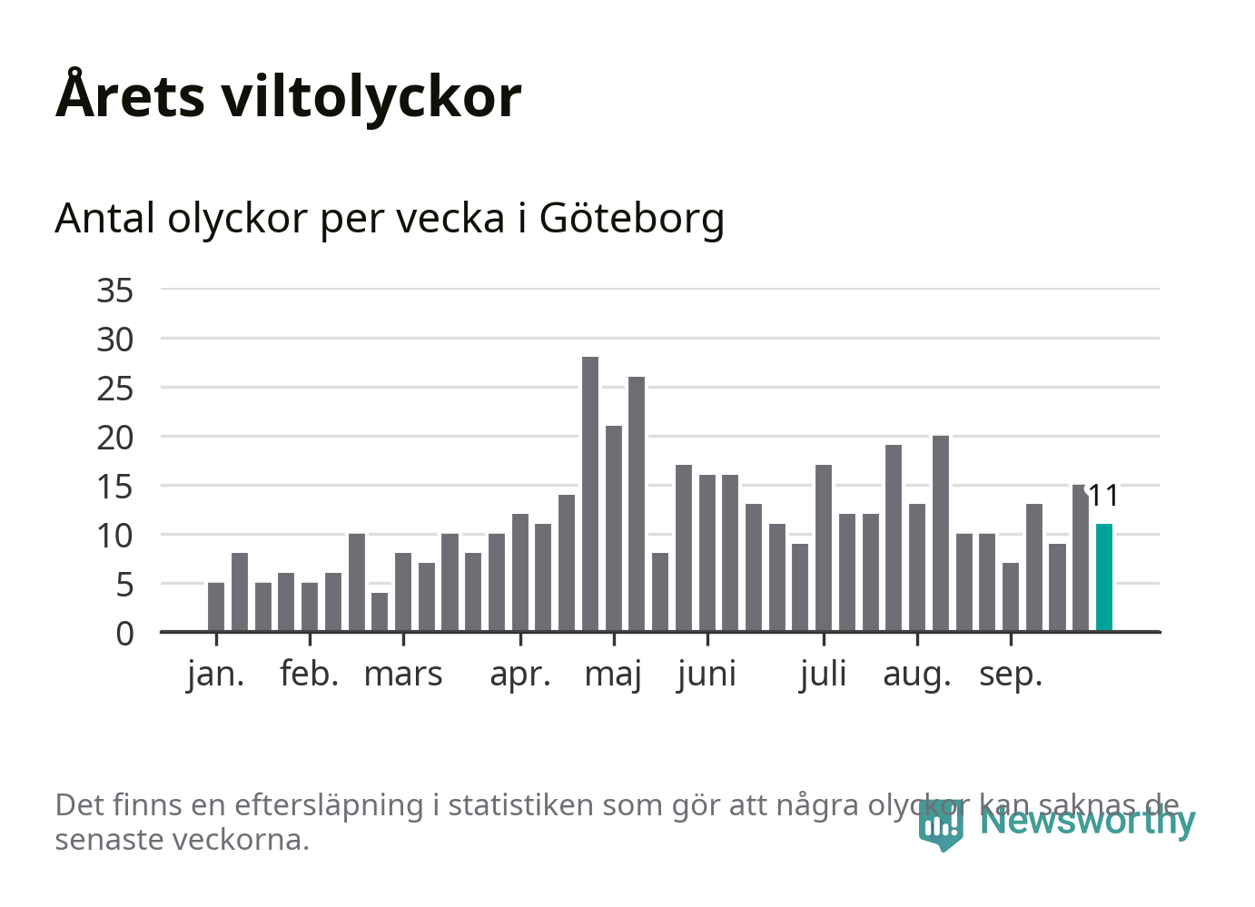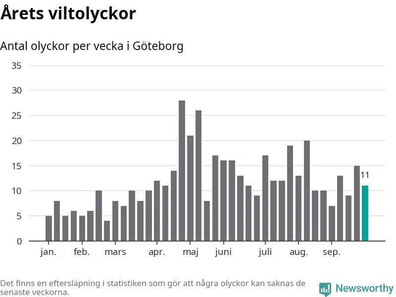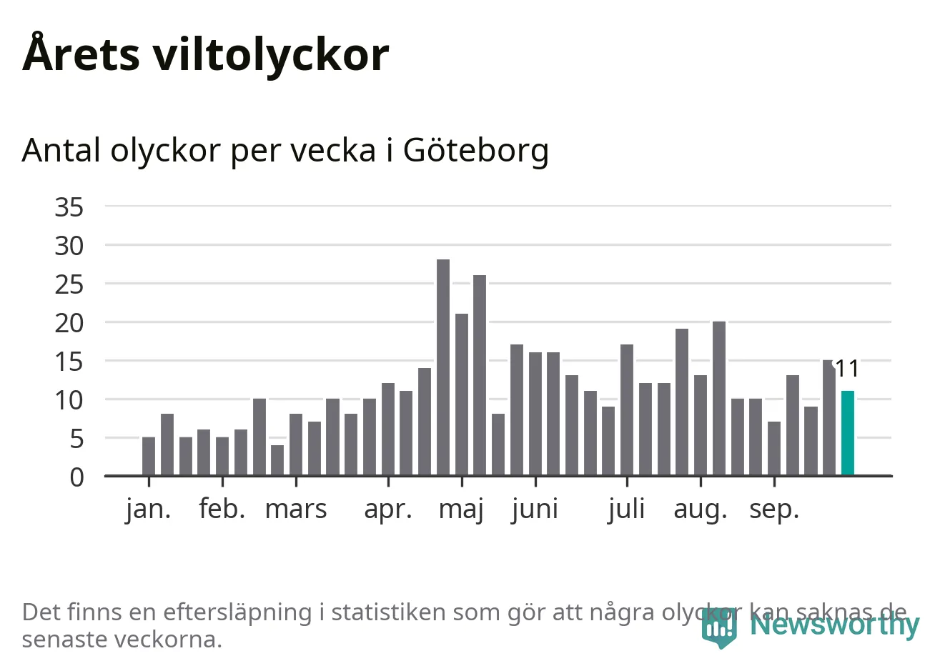 Hittills har elva viltolyckor rapporterats in i Göteborgs kommun från vecka 40. Se listan här.