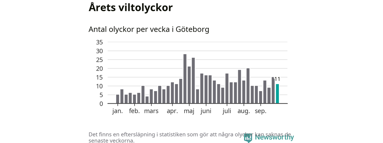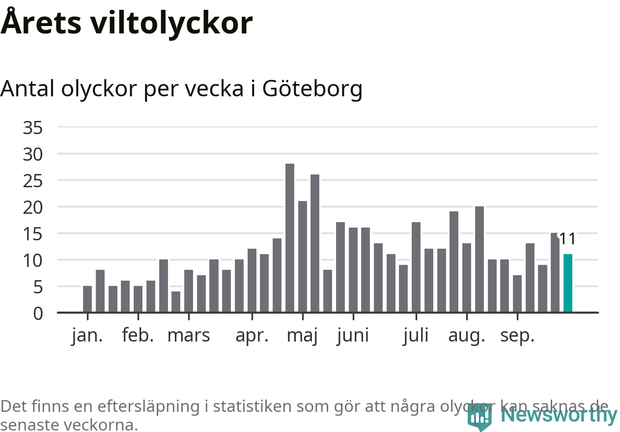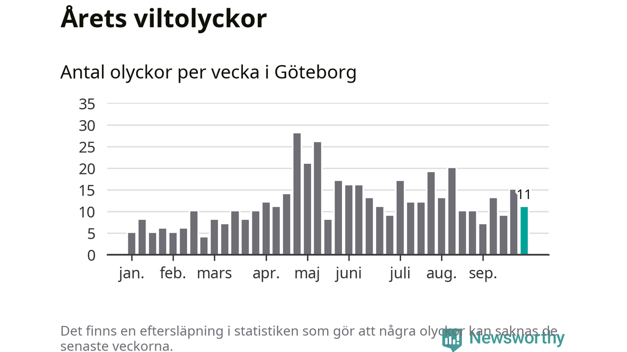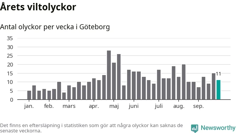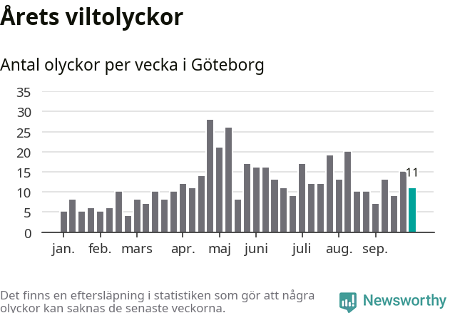 Hittills har elva viltolyckor rapporterats in i Göteborgs kommun från vecka 40. Se listan här.