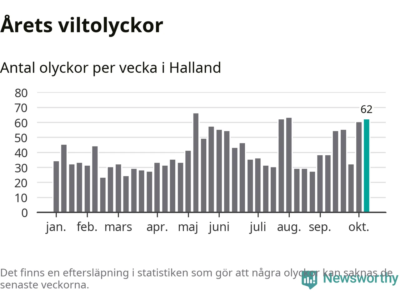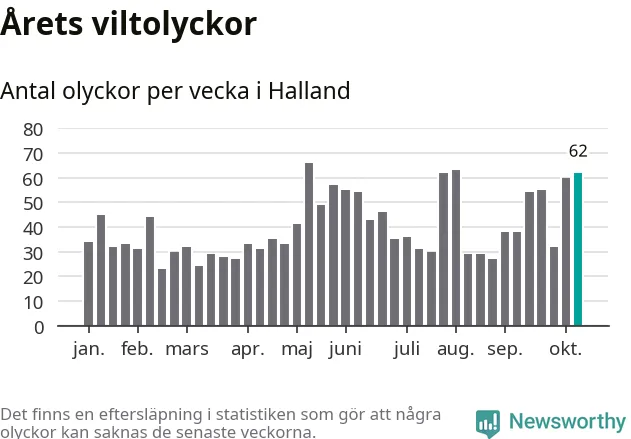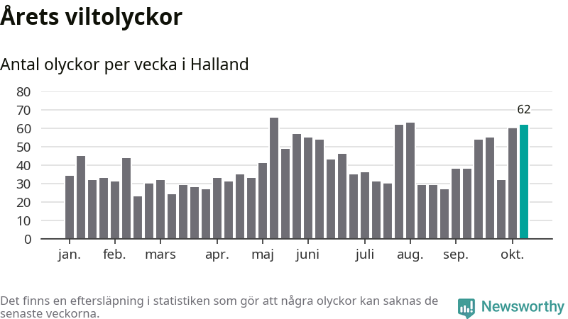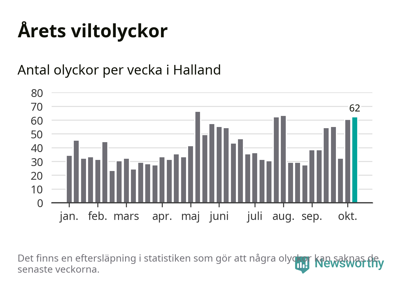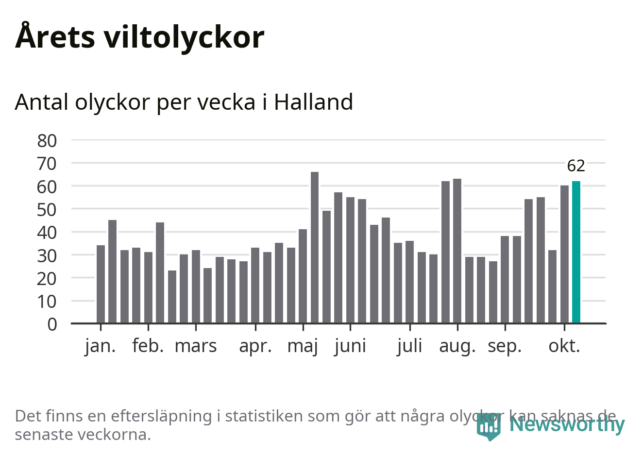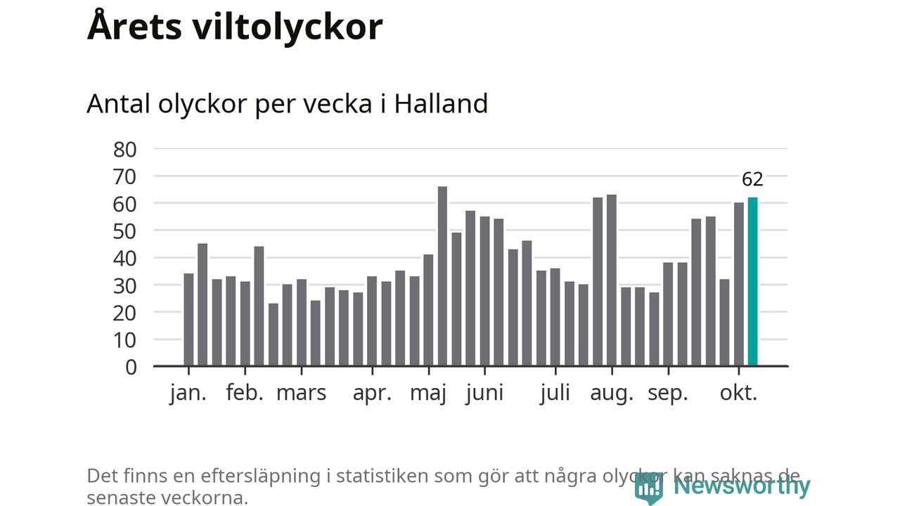 Hittills har 62 viltolyckor rapporterats in i Hallands län från vecka 42. Se listan här.
